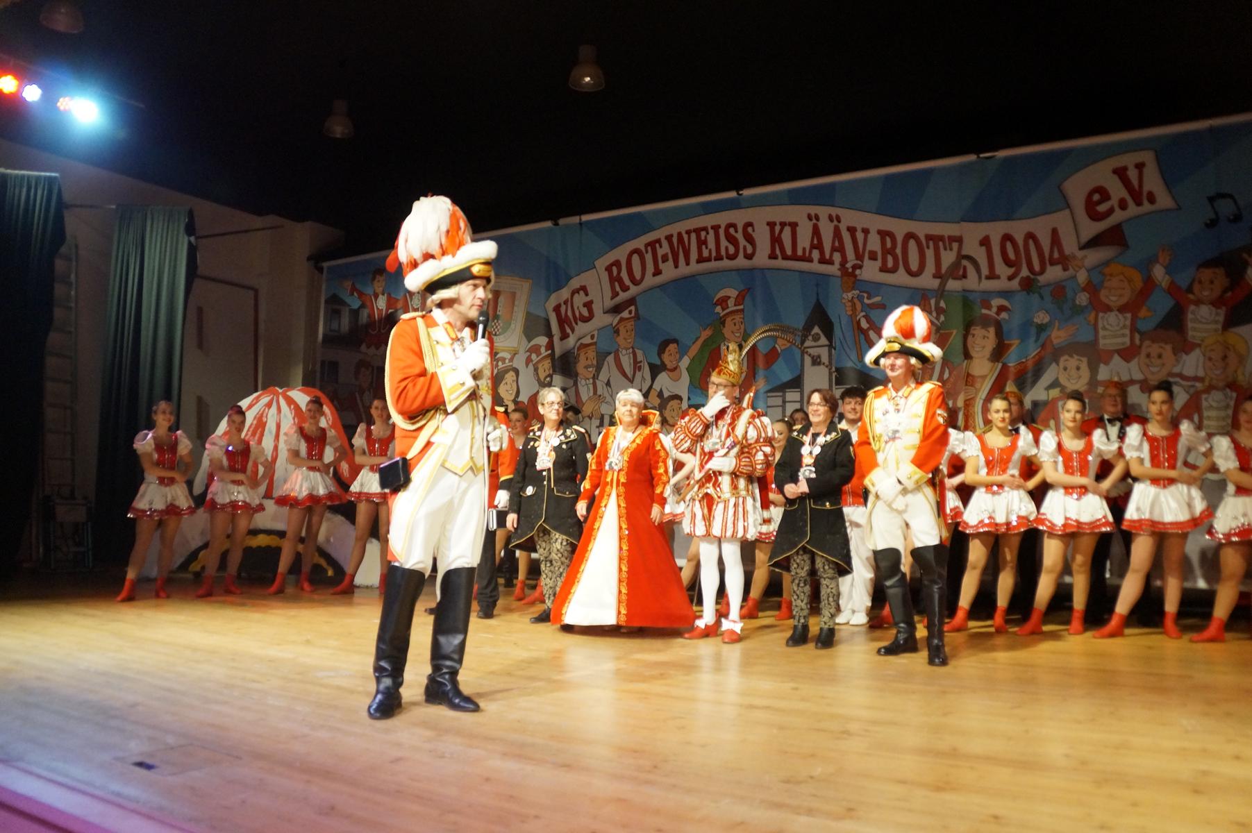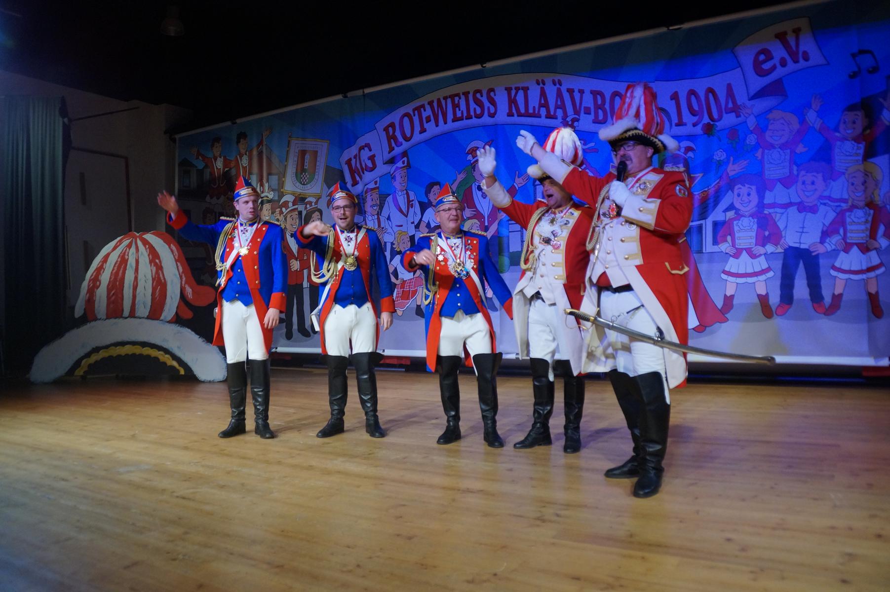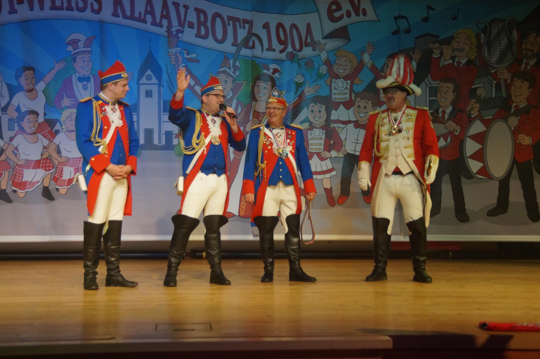 Pünktlich um 19:11 Uhr eröffnete Kommandeur Roland Schramm die Veranstaltung. In seiner Begrüßung hieß er besonders Prinz Michael I., Aegidia Daniela I., den Vorstand der KG Klääv Botz, Präsident Guido Ottersbach sowie die Senatoren willkommen.