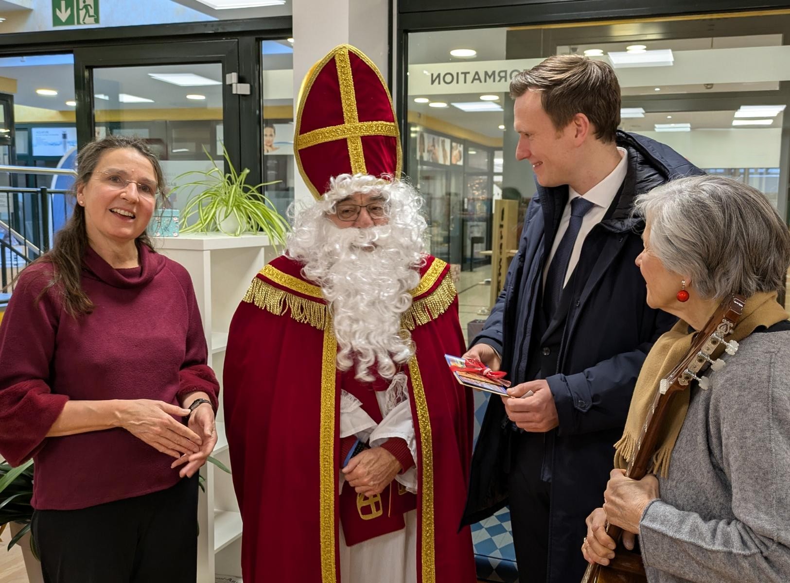 Mit einem fröhlichen Nikolauslied begrüßten sie den hohen Besuch. Dann warteten alle, bis sie an der Reihe waren. Der Nikolaus begrüßte jedes Kind persönlich und hatte Geschenke dabei – einen Schokoladennikolaus und ein kleines Pixi-Buch. Auch für die Büchereileiterin Stephanie Eichhorn gab es etwas. Als Überraschungsgast kam der neue Bürgermeister Philipp Herzog vorbei und freute sich über das lebhafte Treiben.