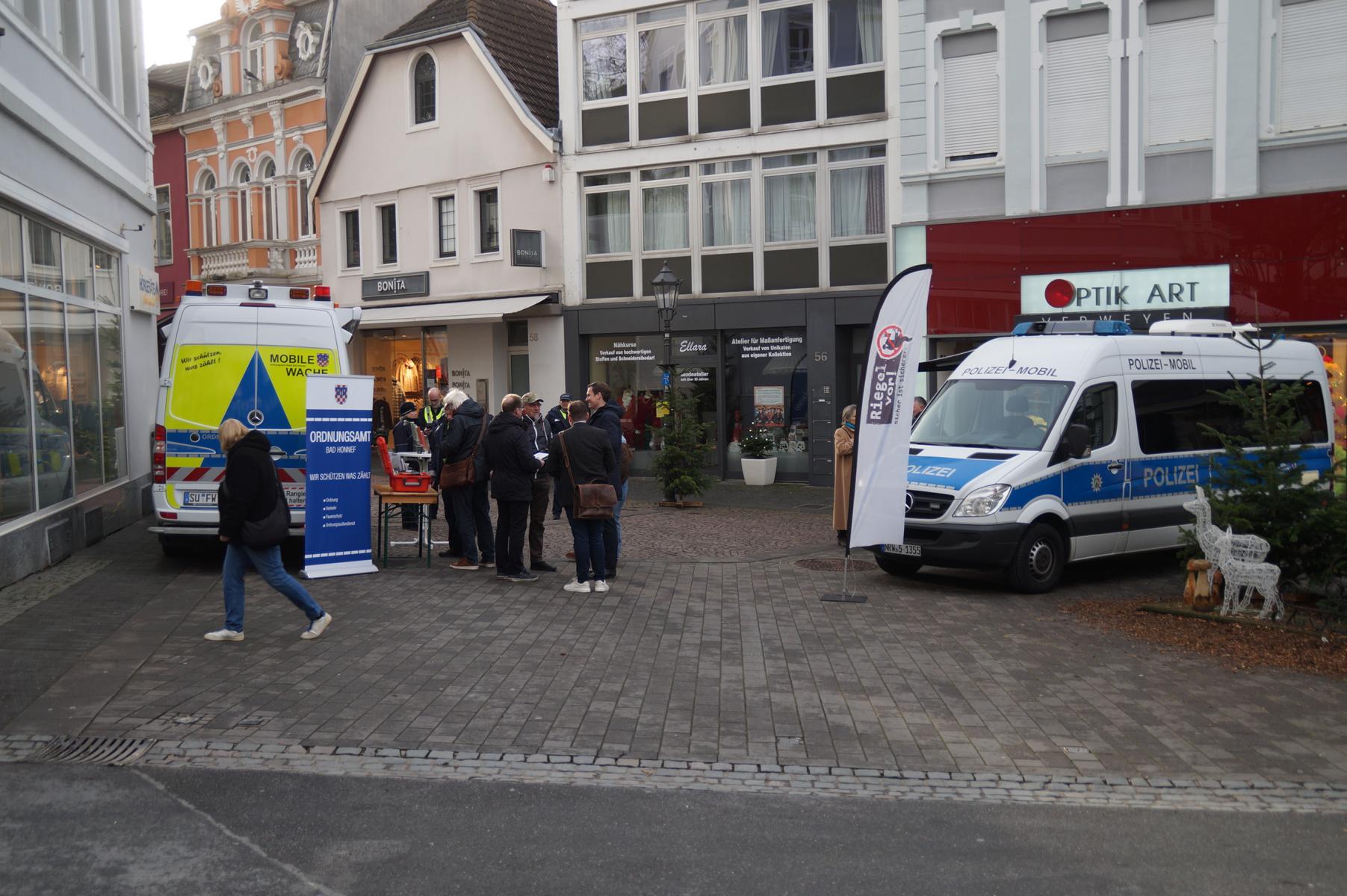 Bürgermeister Philipp Herzog eröffnete den Aktionstag am Polizei-Mobil auf dem Dreiecksplatz. Er betonte, wie wichtig ein gutes Sicherheitsgefühl für die Menschen in Bad Honnef sei: „Die Bürgerinnen und Bürger sollen sich zu jeder Zeit und an jedem Ort sicher fühlen.“ Fachleute der Polizei und Mitarbeitende des städtischen Ordnungsamts standen am Vormittag für individuelle Beratungen bereit, gaben praktische Hinweise zu Schutzmaßnahmen und verteilten Informationsmaterial. Viele Passantinnen und Passanten nutzten die Gelegenheit, konkrete Fragen zu stellen und sich über aktuelle Entwicklungen im Bereich der Kriminalprävention zu informieren.