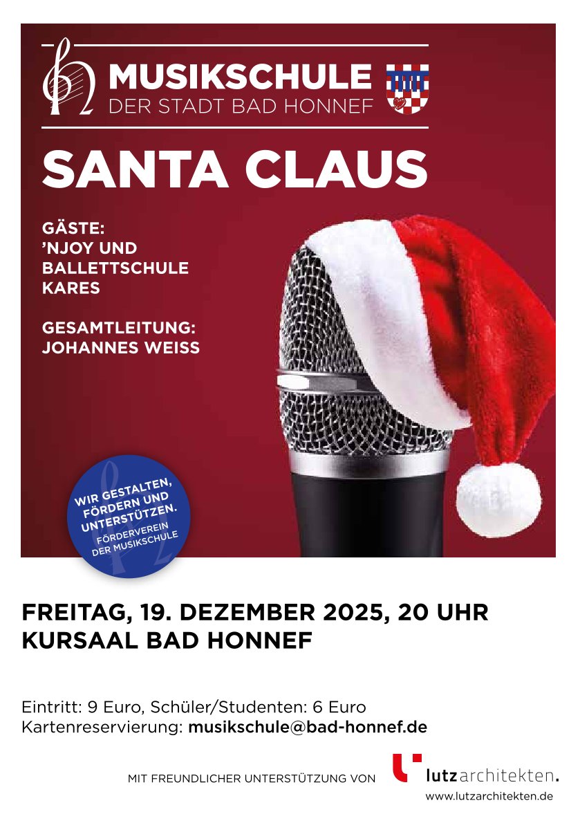 Die Musikschule der Stadt Bad Honnef lädt am Freitag, dem 19. Dezember, ab 20 Uhr zu ihrem diesjährigen Weihnachtskonzert „Santa Claus” ins Kurhaus ein. Die Gesamtleitung übernimmt an diesem Abend Johannes Weiß. Zu Gast sind der Gospelchor n’Joy und die Ballettschule Kares.