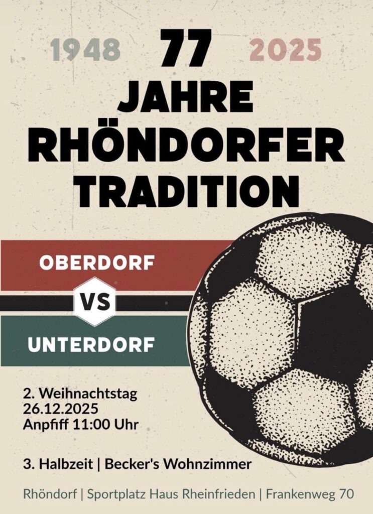 Ein ungewöhnliches Weihnachtsbrauchtum, das Rhöndorf seit Jahrzehnten verbindet – und an einem Tag im Jahr in zwei Lager teilt: Das traditionelle Fußballspiel zwischen Oberdorf und Unterdorf geht 2025 in seine 77. Auflage.
