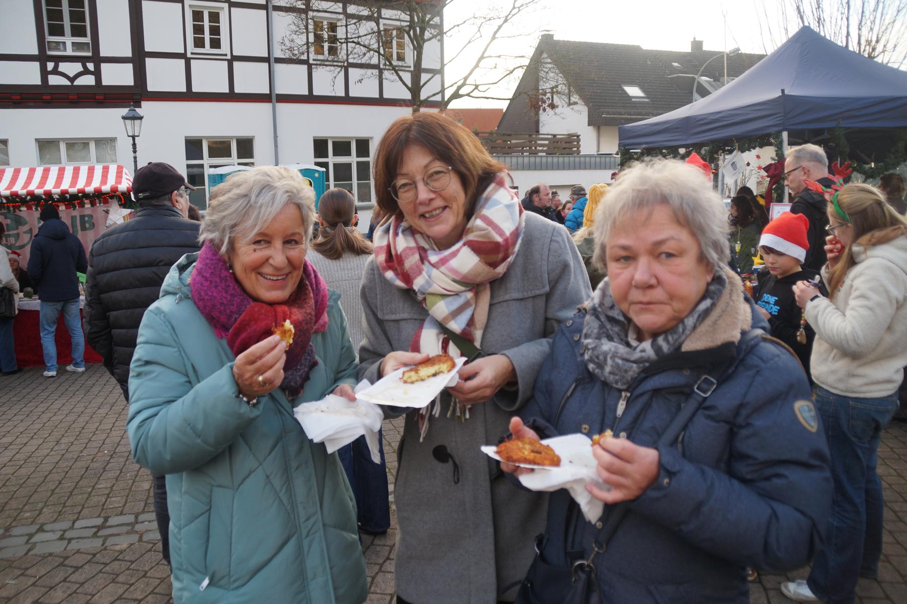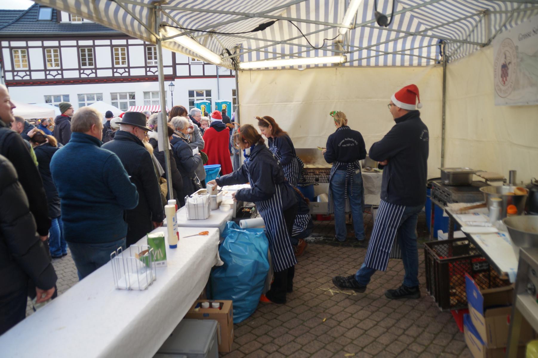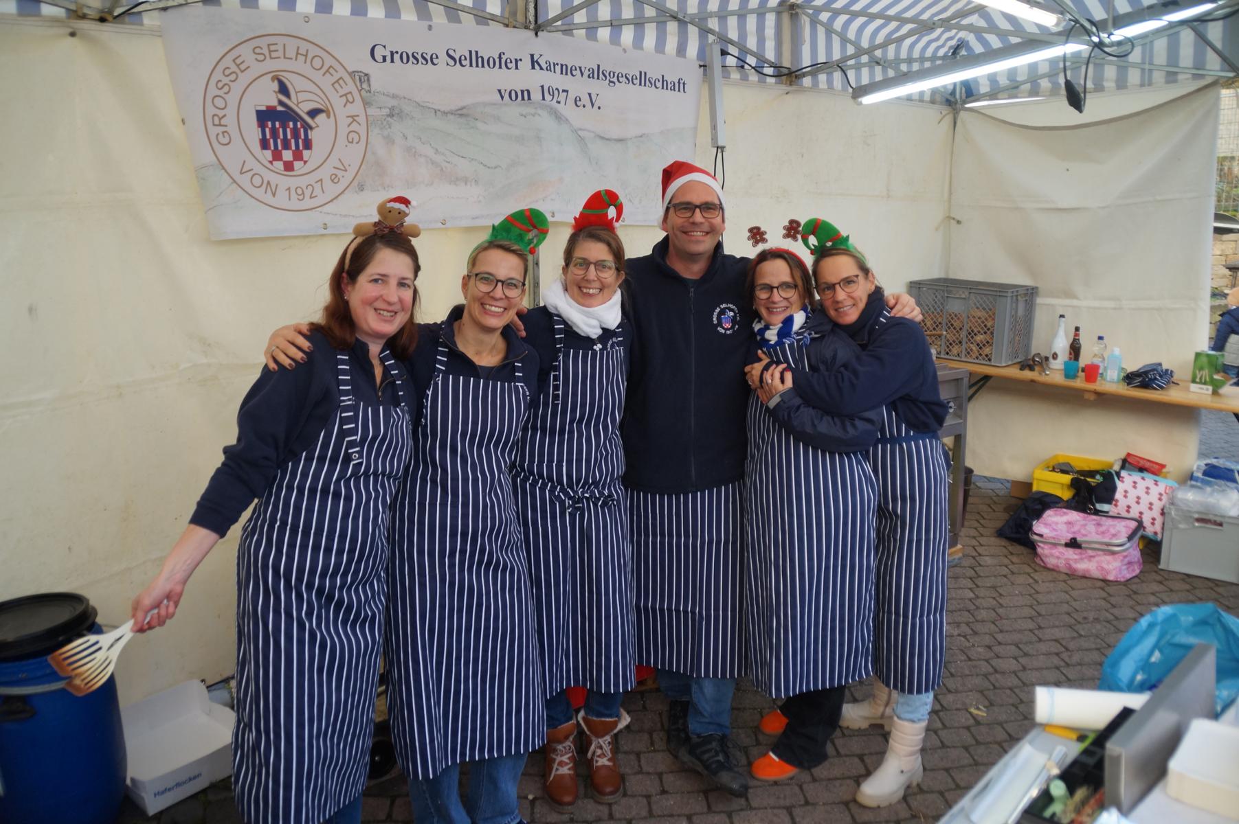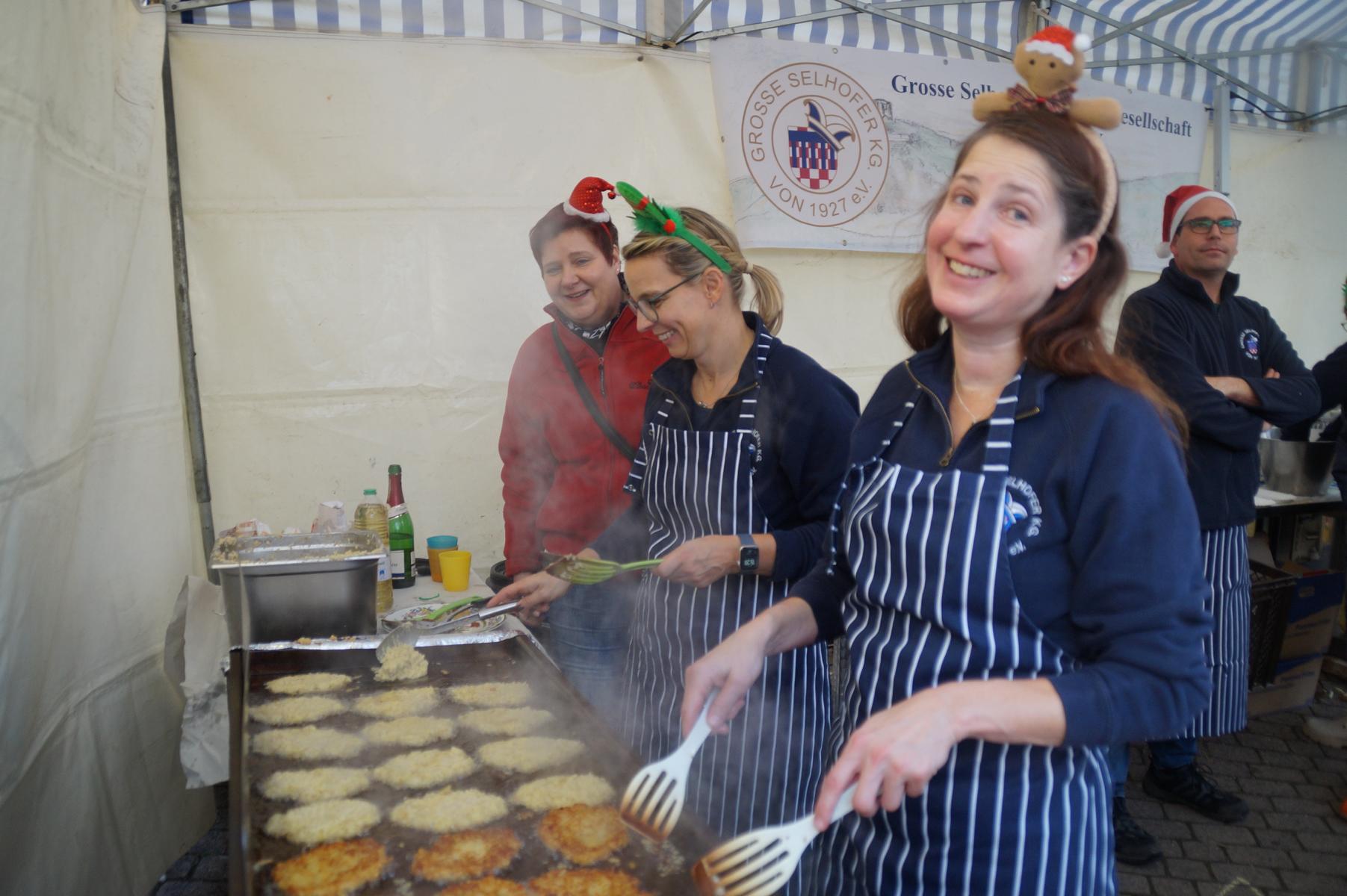 Für die Erwachsenen gab es neben Glühwein der Freiwilligen Feuerwehr auch die berühmten Reibekuchen der KG Blau Weiss Selhof. Das Damenkomitee Ziepchen versorgten die Gäste mit Erbsensuppe und Würstchen, die Ziepches Jecke boten Kesselsknall, Gulaschsuppe und gebrannte Mandeln