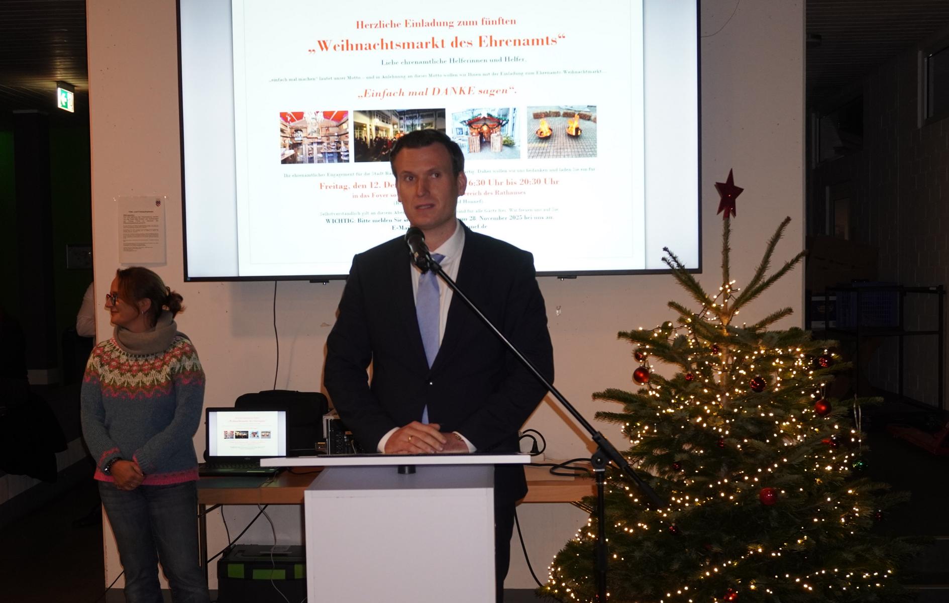 | In seiner Begrüßungsrede machte Bürgermeister Philipp Herzog deutlich, wie wichtig ihm das Ehrenamt ist: „Sie schenken unserer Stadt Wärme, Sie schenken Mitmenschen Halt, Sie schenken Gemeinschaft, wo sie gebraucht wird. Sie machen Bad Honnef zu einem Ort, an dem Menschen füreinander einstehen. Das ist vielleicht das wertvollste Geschenk, das es gibt. Möge dieser Abend Ihnen zeigen, wie sehr Ihre Arbeit gesehen wird. Möge er Ihnen Mut machen, Freude schenken und Sie daran erinnern, wie wichtig Sie für unsere Stadt sind.“ |