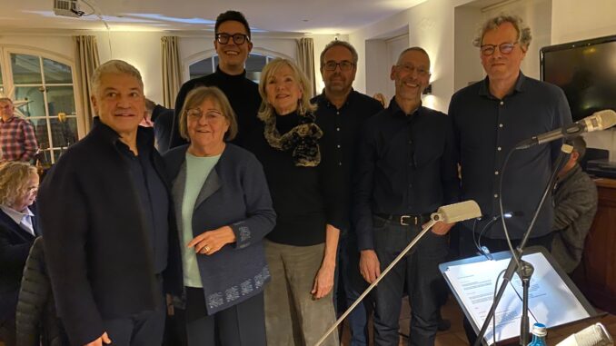 Abschluss der Spendenaktion im Weingut Pieper: Die Gruppe Wolperath unter Leitung von Thomas Heyer (l.) verzichtete auf die Gage und konnte die fehlenden 500 Euro an Inge Ivan (2.v.l.) stellvertretende Vorsitzende von der AWO Bad Honnef und Annette Stegger von der Bürgerstiftung überreichen. -- Foto© Bürgerstiftung