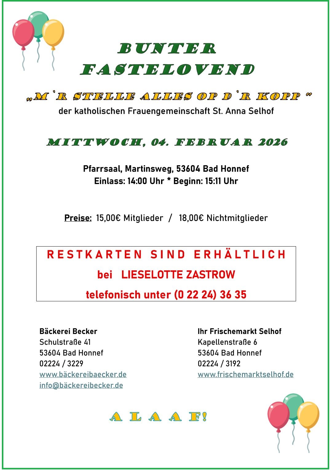Restkarten sind erhältlich bei Lieslotte Zastrow — Telefon 02224-3635