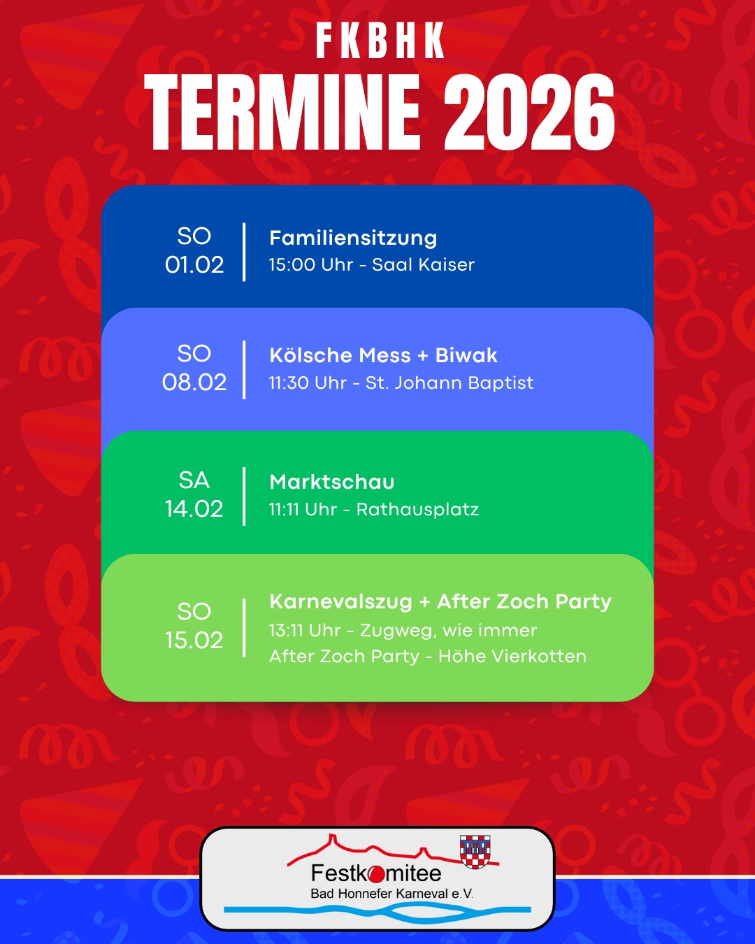 Das Festkomitee Bad Honnefer Karneval e.V. hat die Termine für den kommenden Karnevalszug bekanntgegeben. Der Zug startet in diesem Jahr am Sonntag 15.02.26  um 13:11 Uhr, wie gewohnt im Honnefer Süden rund um den Hit-Markt. Die Anmeldung für teilnehmende Gruppen ist bereits geöffnet. Das Anmeldeformular steht auf der Internetseite des Festkomitees zum Download bereit.