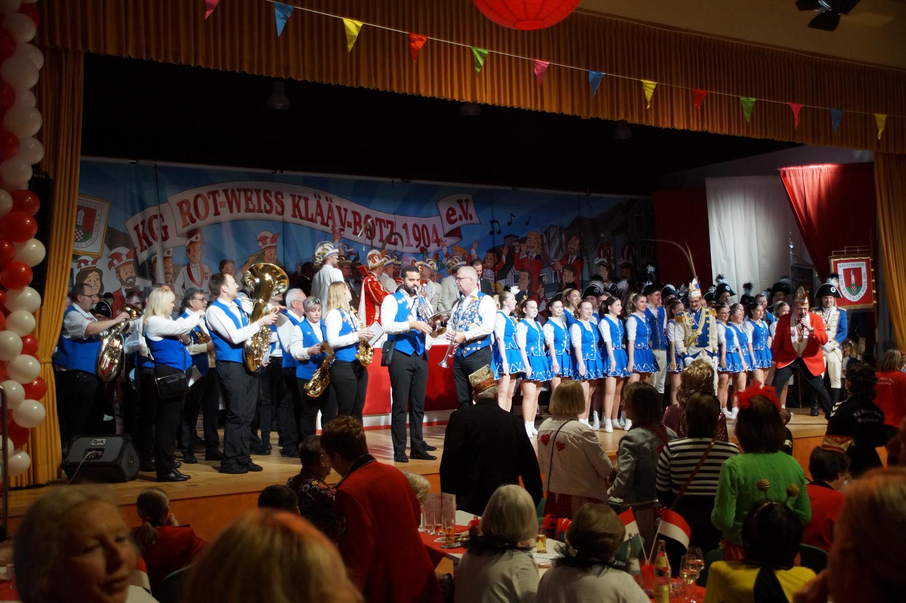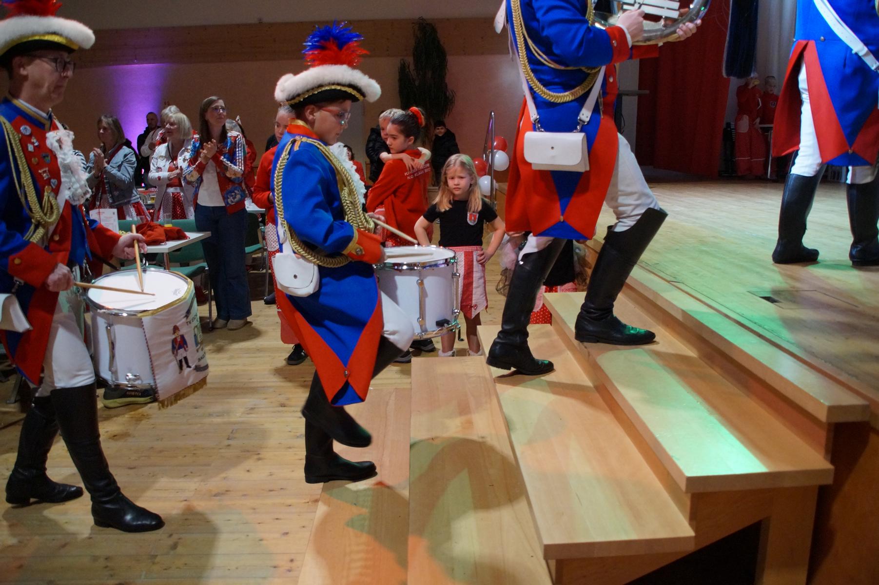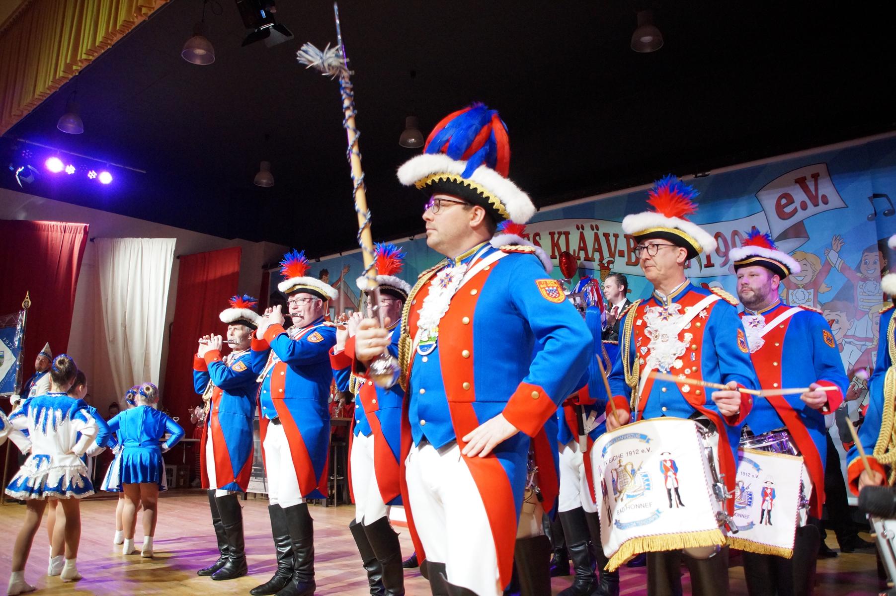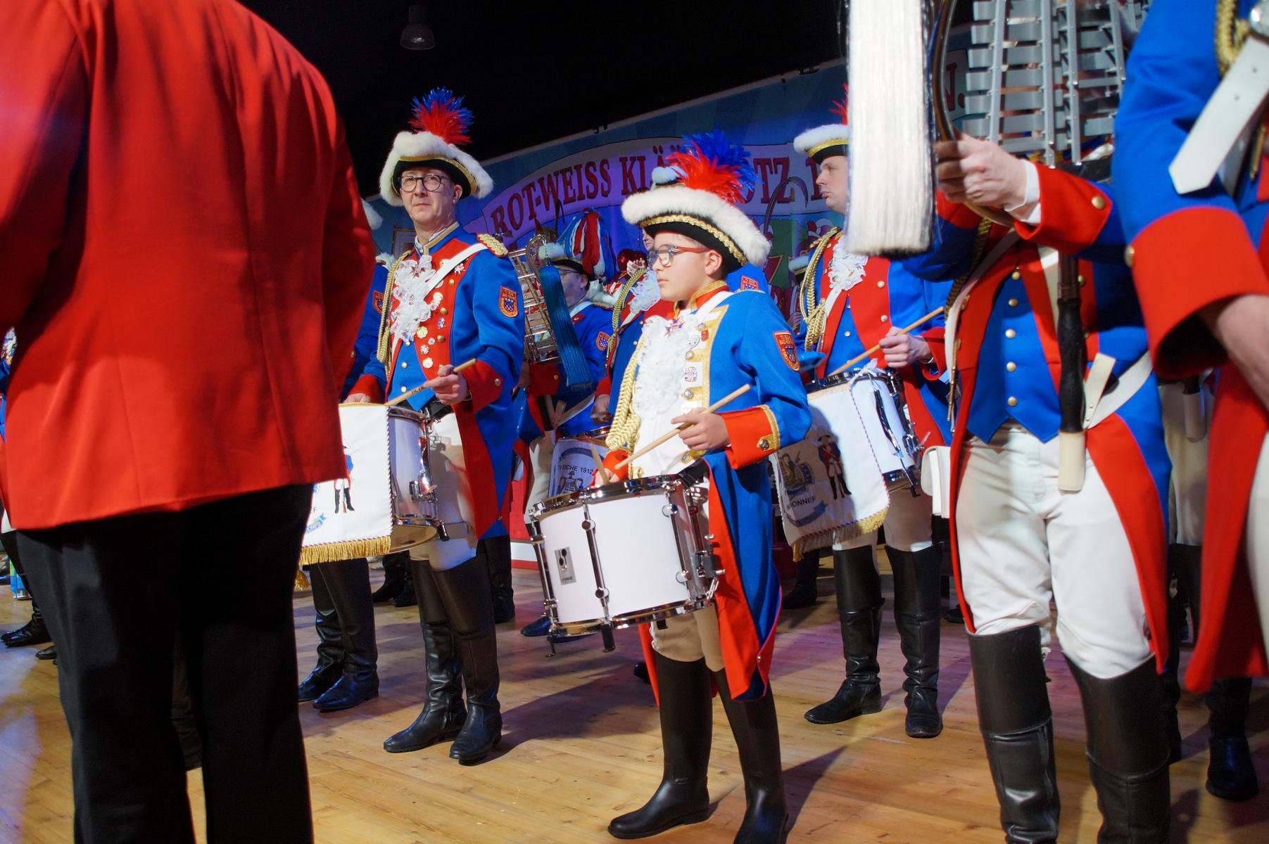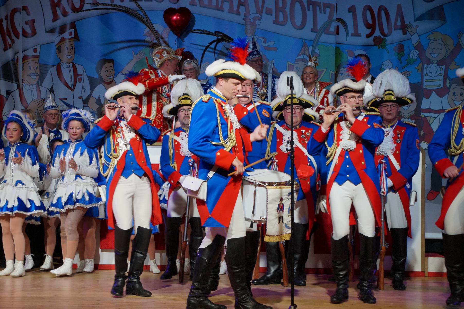 Ein weiterer Höhepunkt war der Auftritt der Prinzengarde der KG Rot-Weiß Klääv Botz, die in ihren rot-weißen Uniformen für ein eindrucksvolles Bild sorgte. Das Siebengebirgsprinzenpaar mit der Stücher KG aus Thomasberg, begleitet vom Spielmannszug der TV Eiche Bad Honnef, brachte das Bürgerhaus mit seinen Klängen noch einmal richtig in Bewegung.
