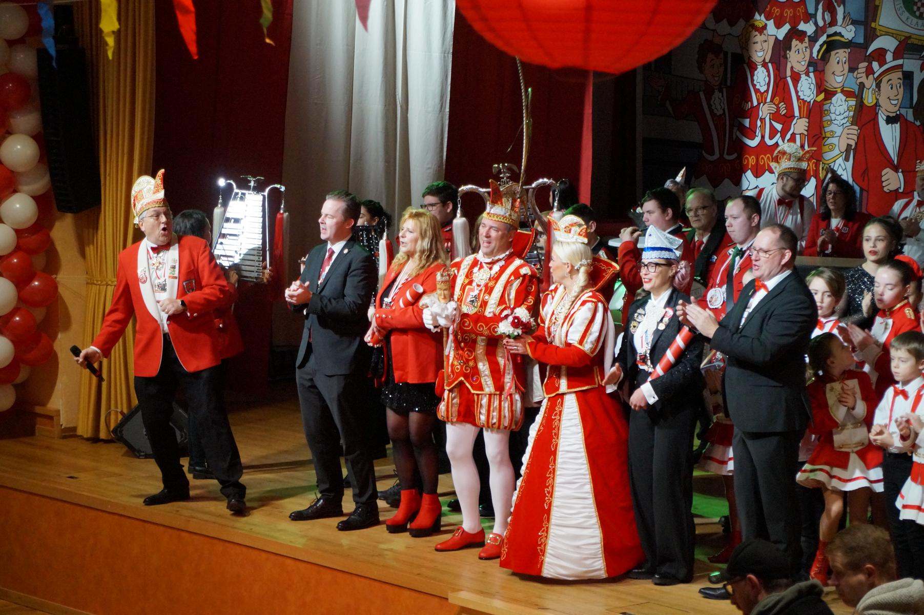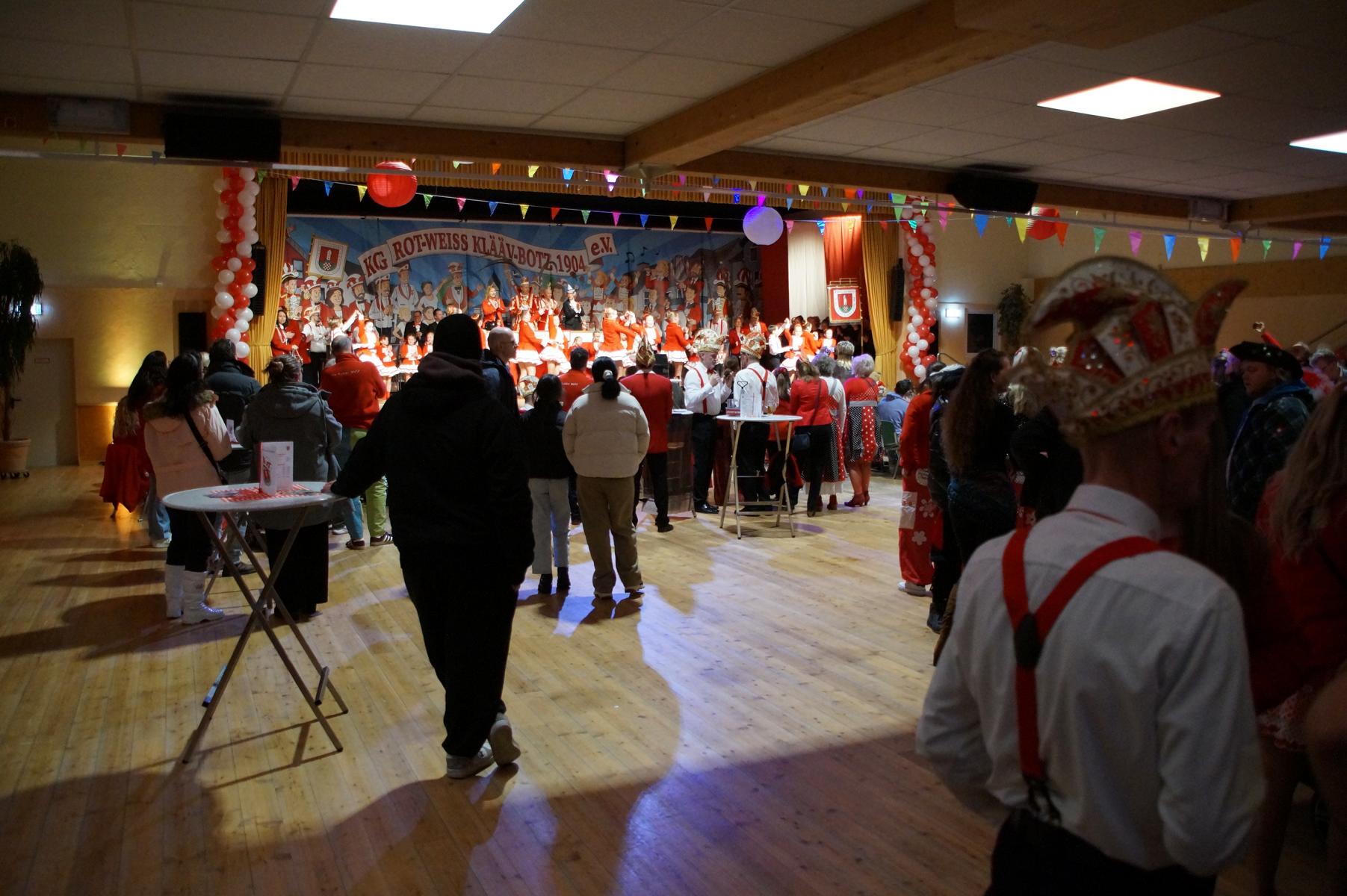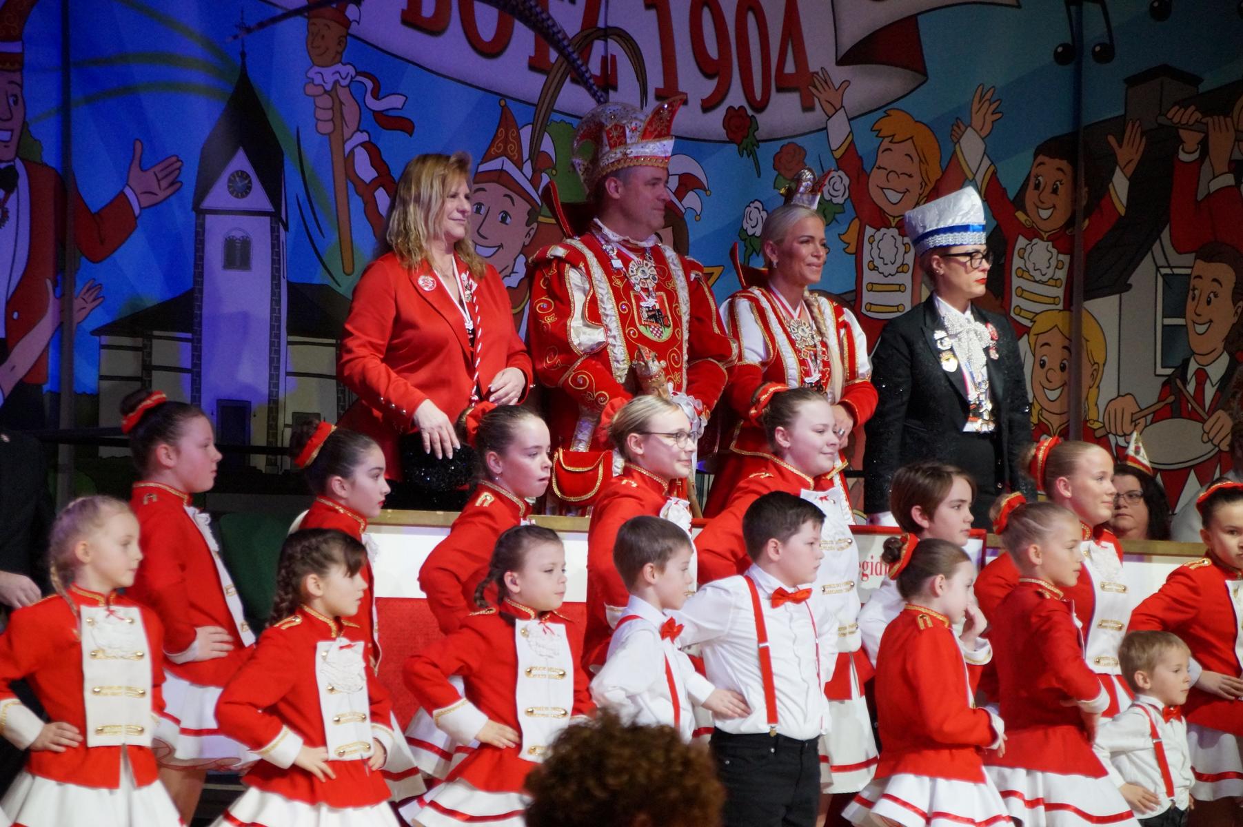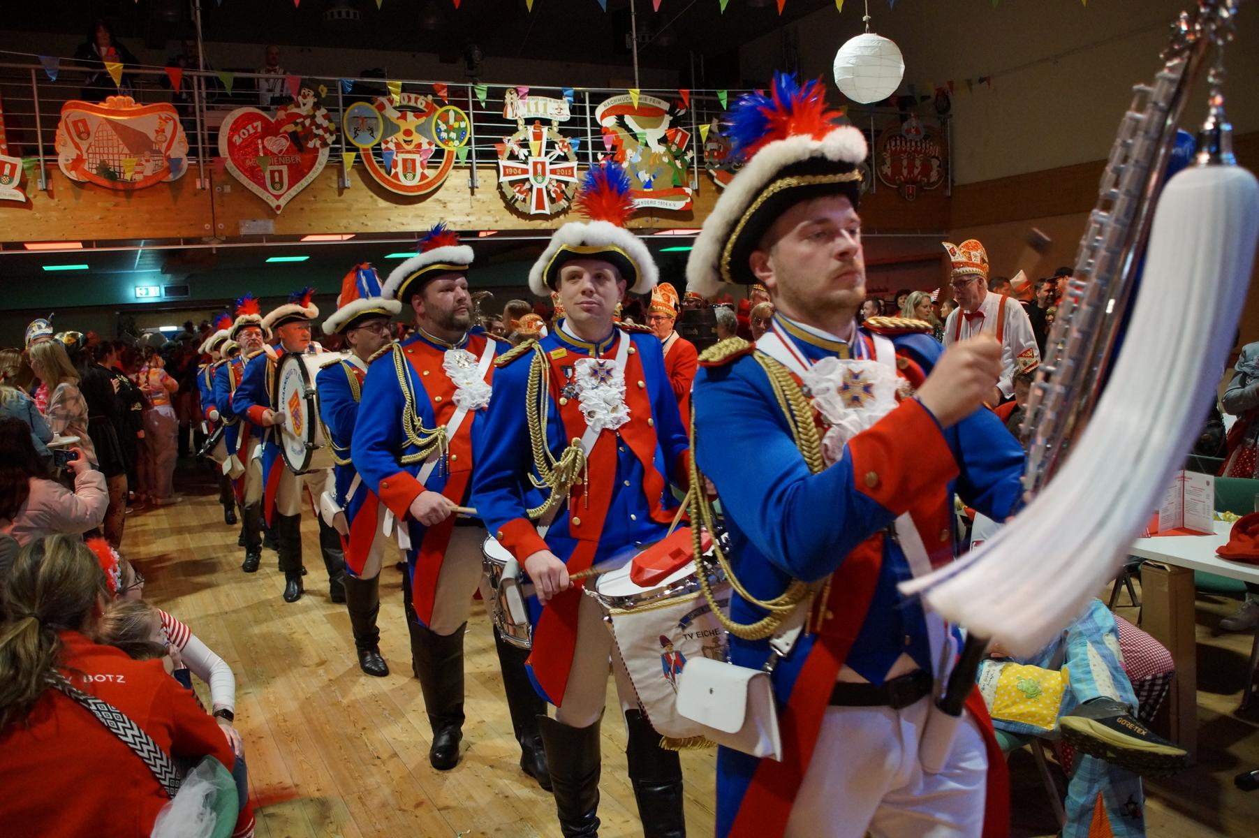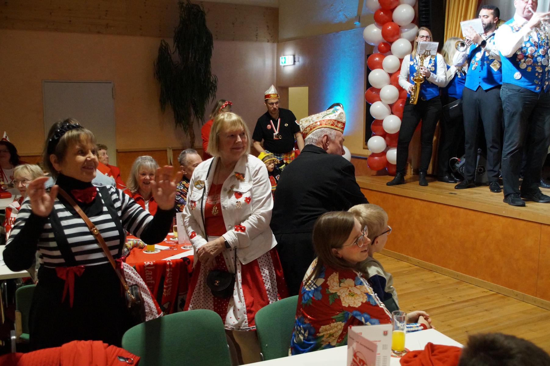 Ein weiterer Höhepunkt war der Auftritt der Prinzengarde der KG Rot-Weiß Klääv Botz, die in ihren rot-weißen Uniformen für ein eindrucksvolles Bild sorgte. Das Siebengebirgsprinzenpaar mit der Stücher KG aus Thomasberg, begleitet vom Spielmannszug der TV Eiche Bad Honnef, brachte das Bürgerhaus mit seinen Klängen noch einmal richtig in Bewegung.