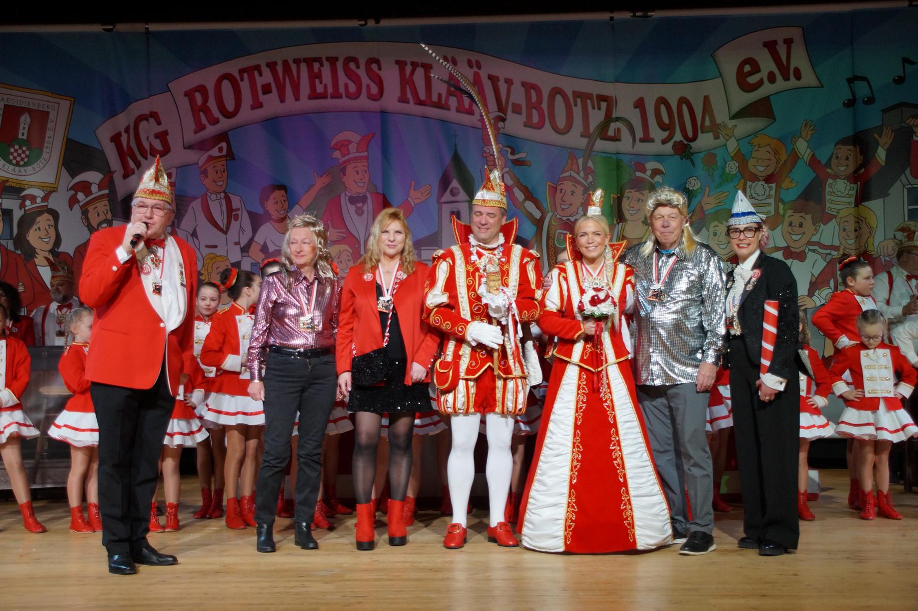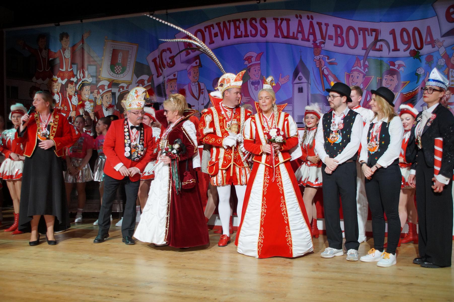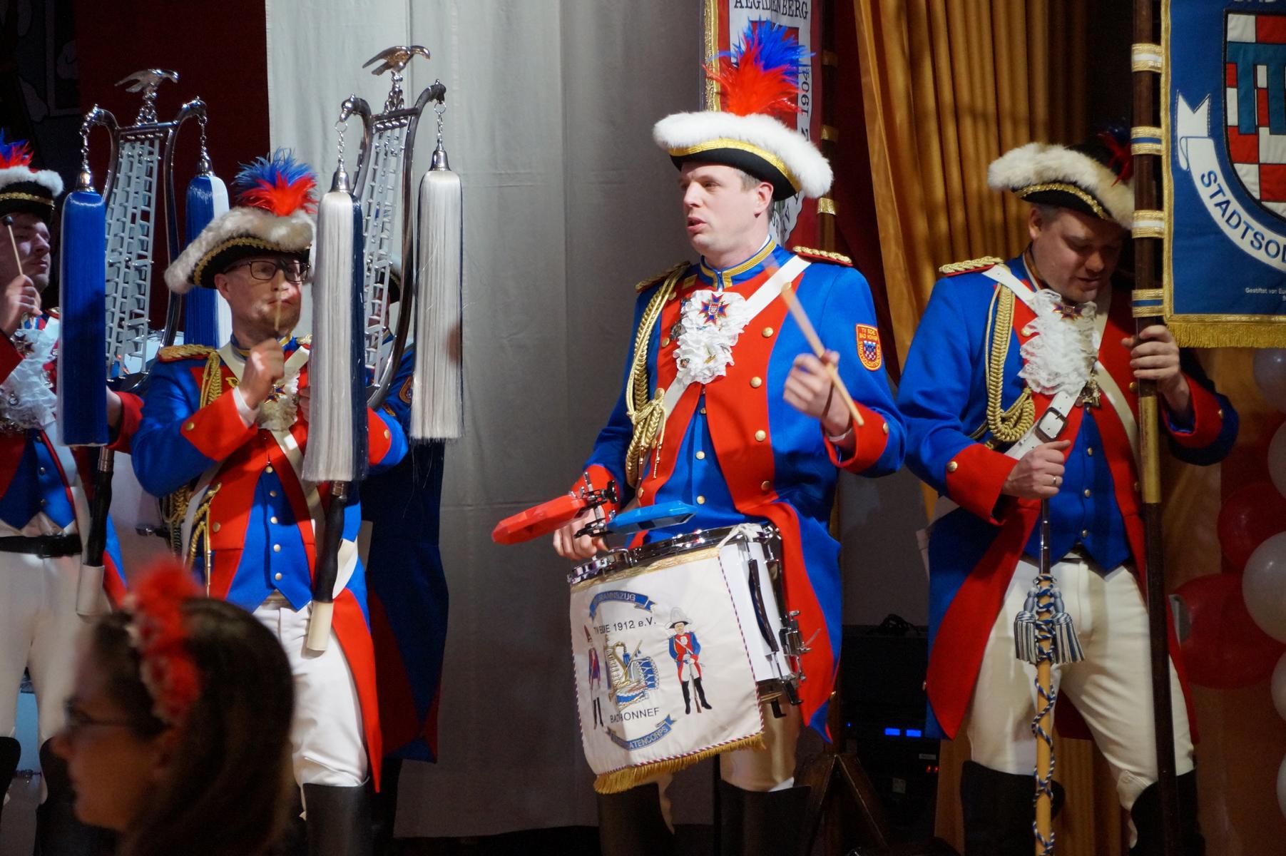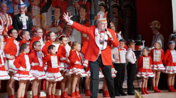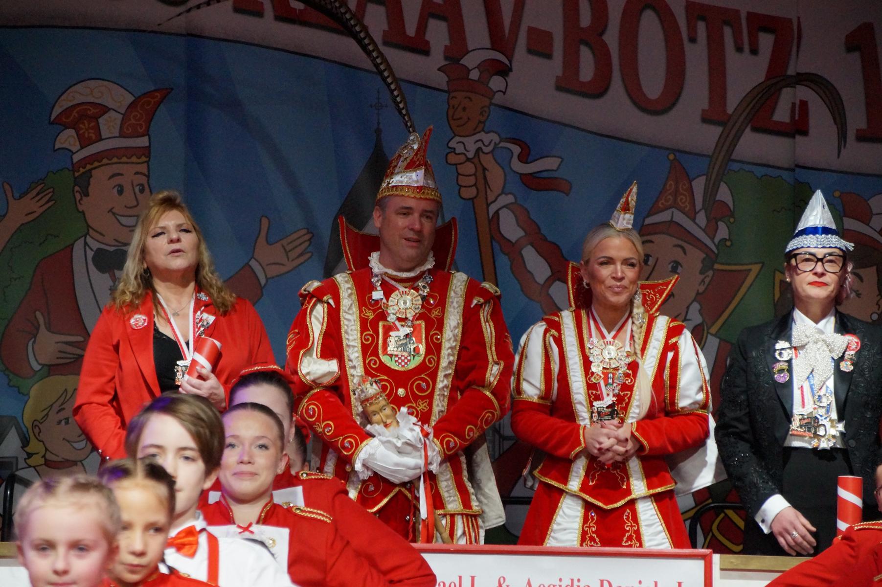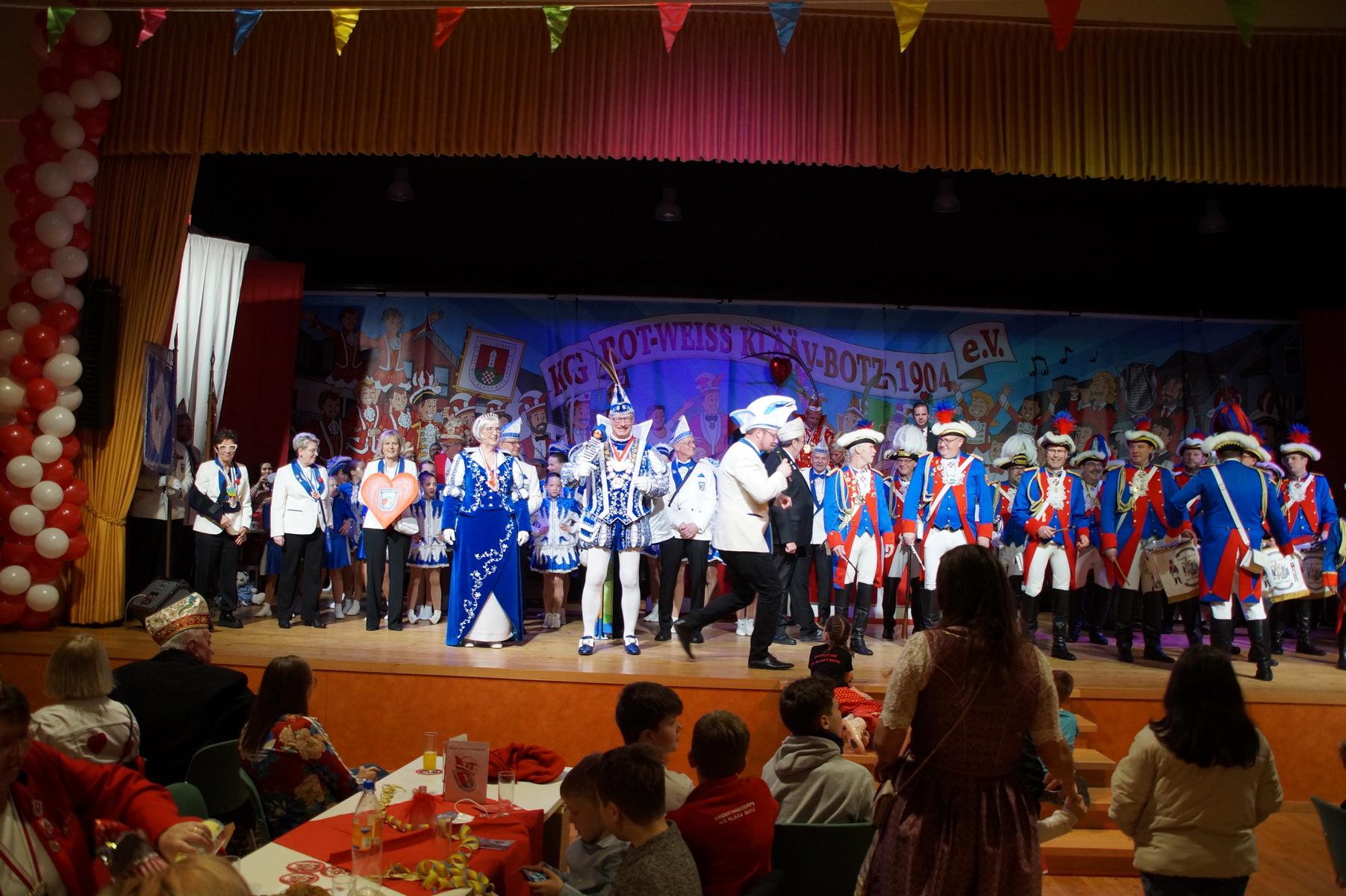Ein weiterer Höhepunkt war der Auftritt der Prinzengarde der KG Rot-Weiß Klääv Botz, die in ihren rot-weißen Uniformen für ein eindrucksvolles Bild sorgte. Das Siebengebirgsprinzenpaar mit der Stücher KG aus Thomasberg, begleitet vom Spielmannszug der TV Eiche Bad Honnef, brachte das Bürgerhaus mit seinen Klängen noch einmal richtig in Bewegung.