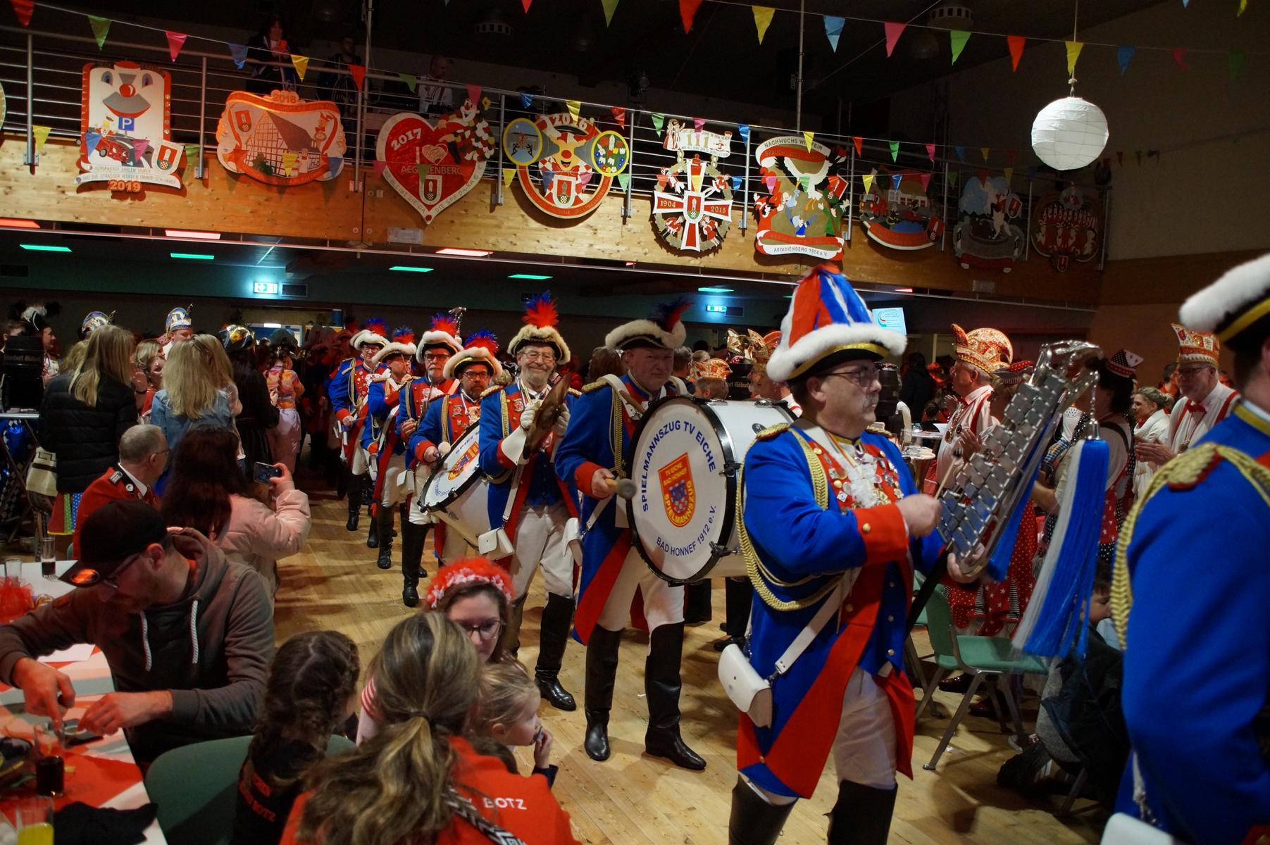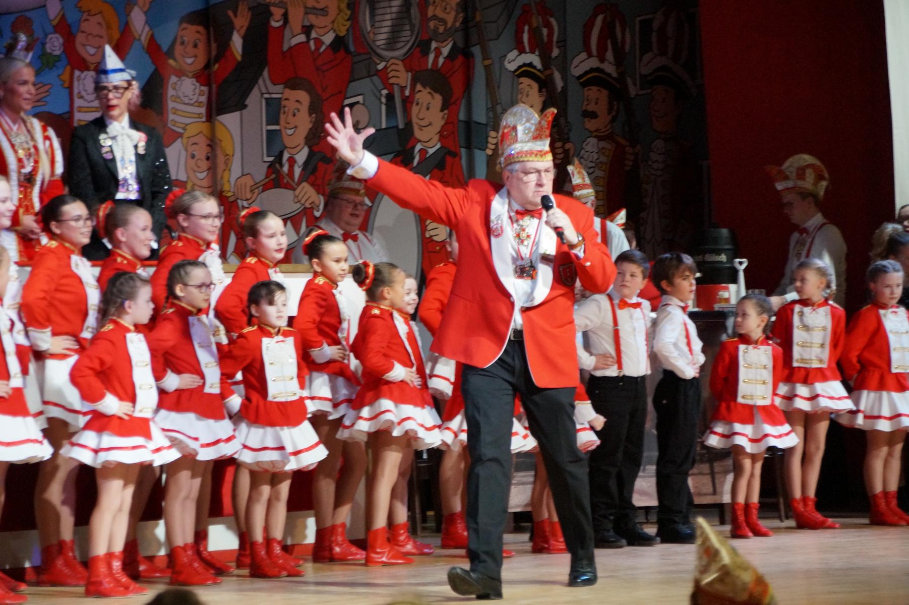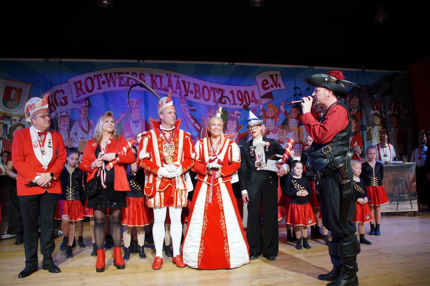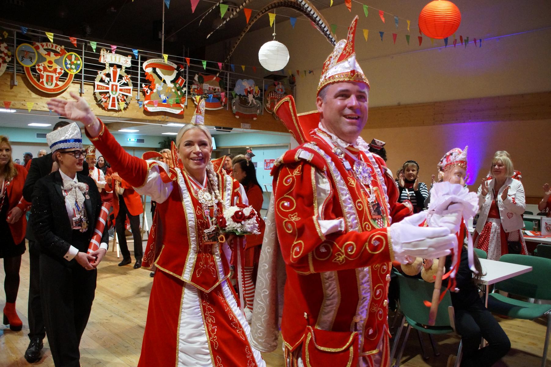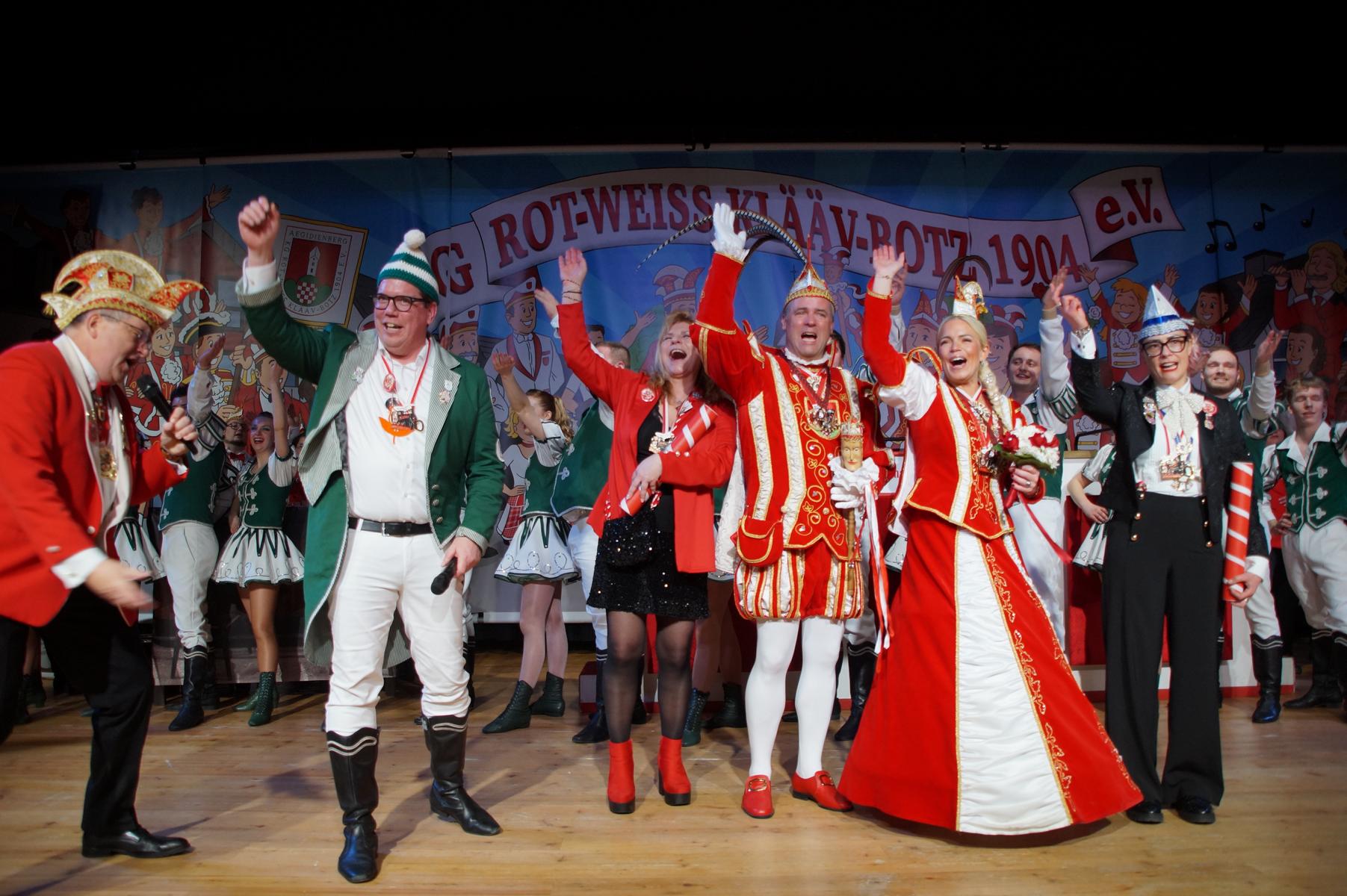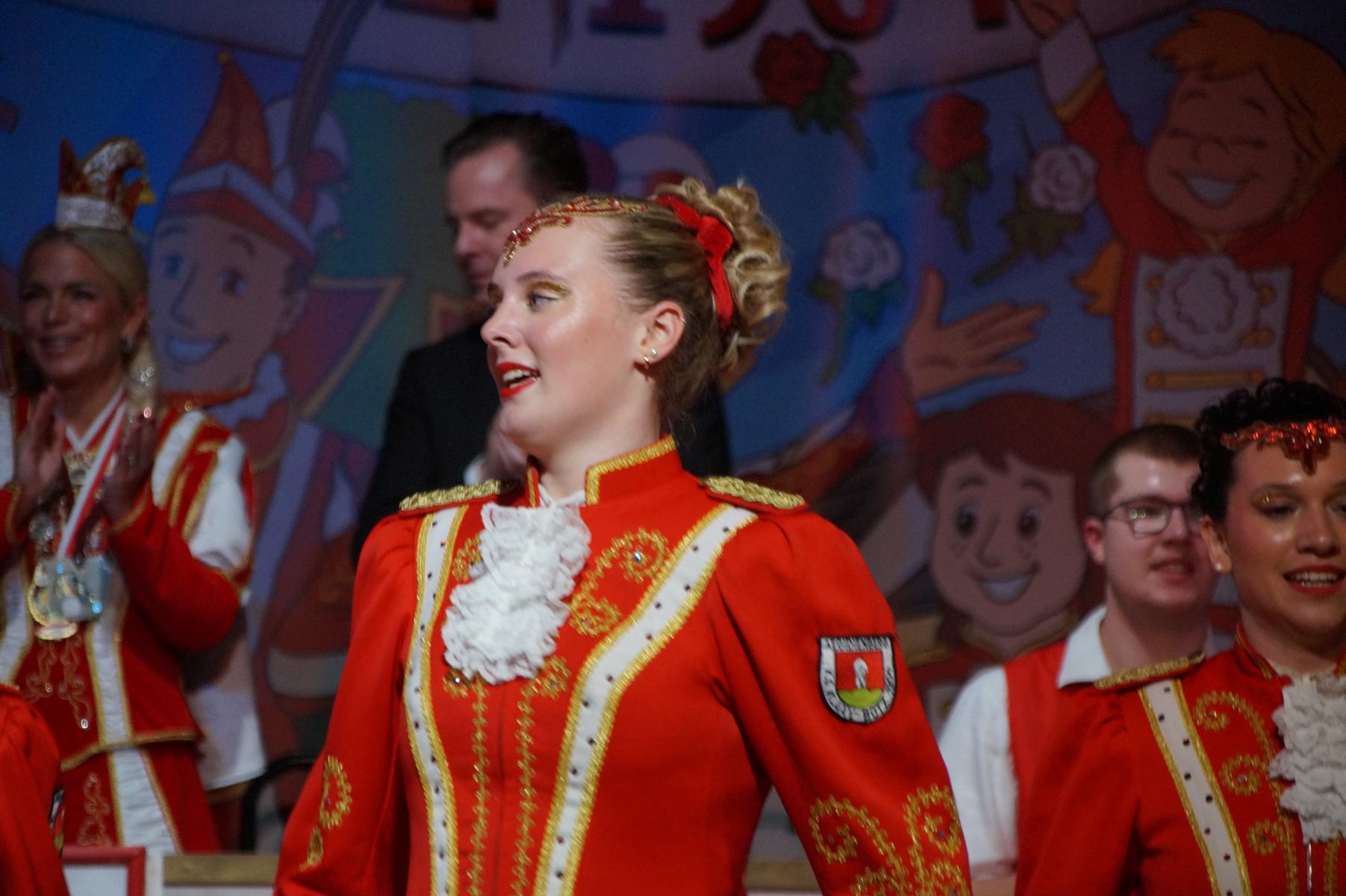 Ein weiterer Höhepunkt war der Auftritt der Prinzengarde der KG Rot-Weiß Klääv Botz, die in ihren rot-weißen Uniformen für ein eindrucksvolles Bild sorgte. Das Siebengebirgsprinzenpaar mit der Stücher KG aus Thomasberg, begleitet vom Spielmannszug der TV Eiche Bad Honnef, brachte das Bürgerhaus mit seinen Klängen noch einmal richtig in Bewegung.