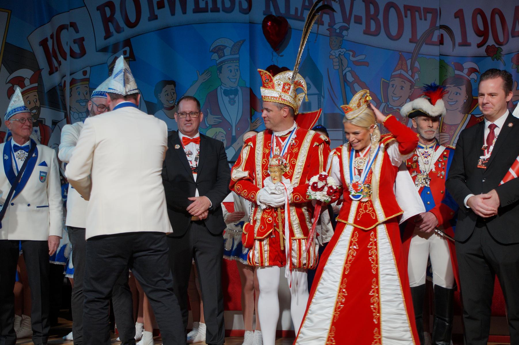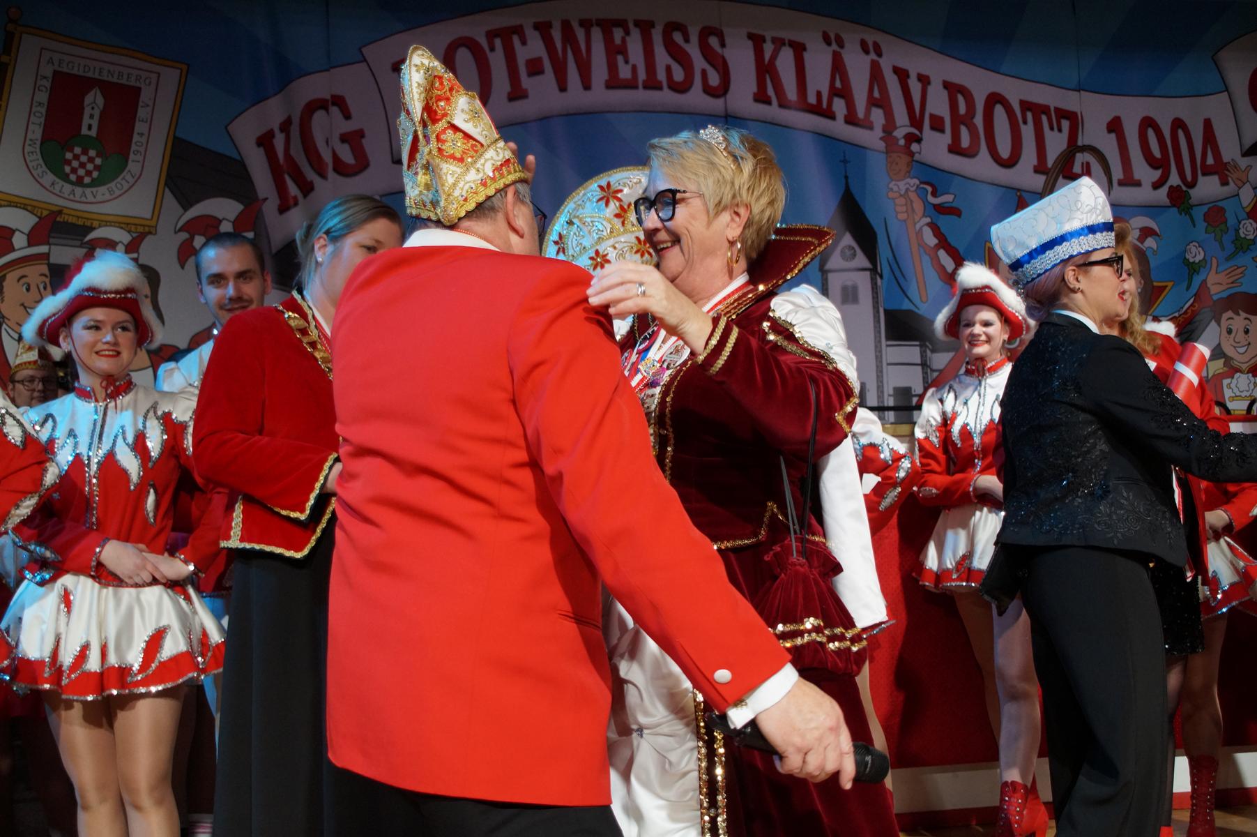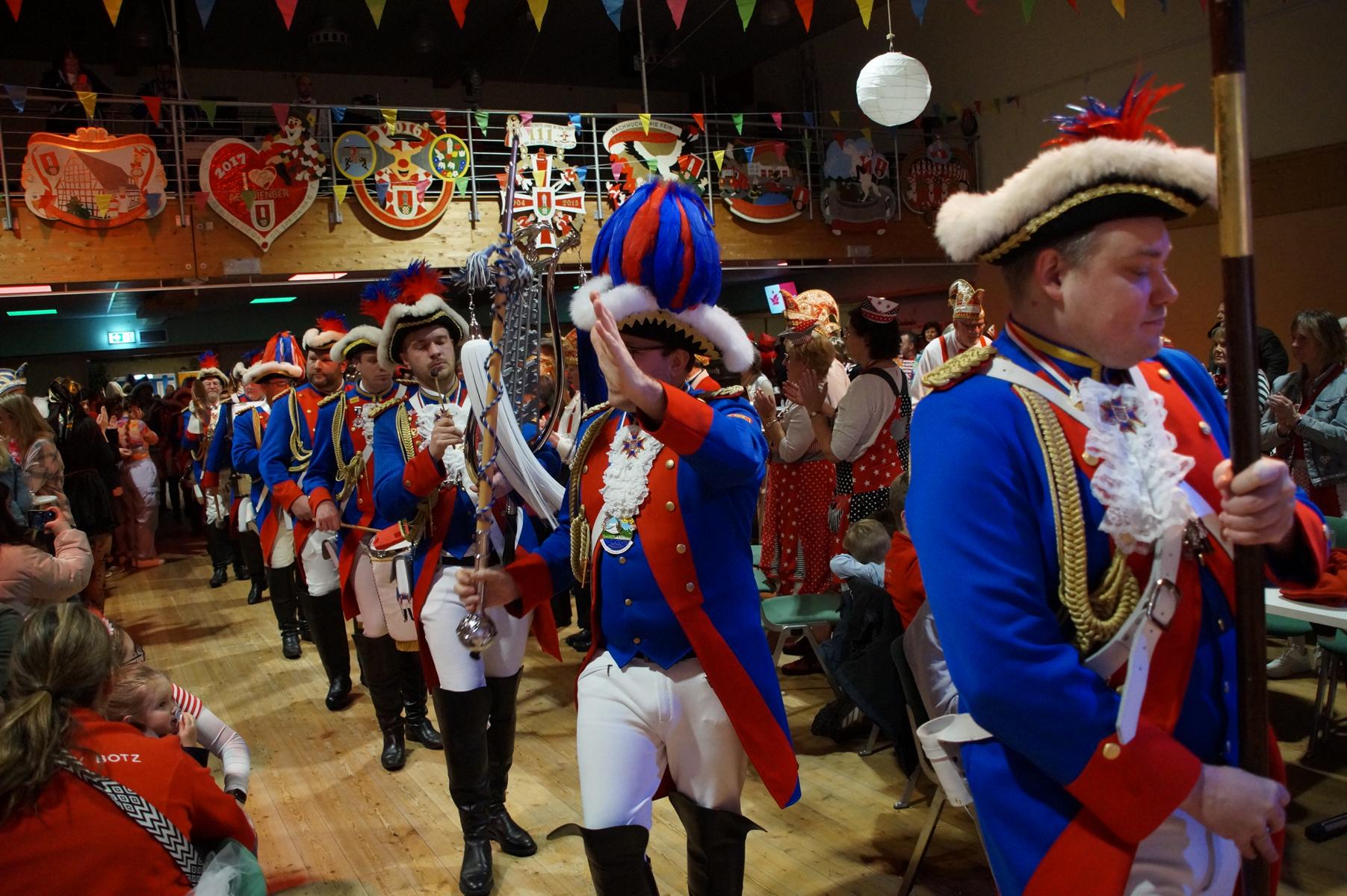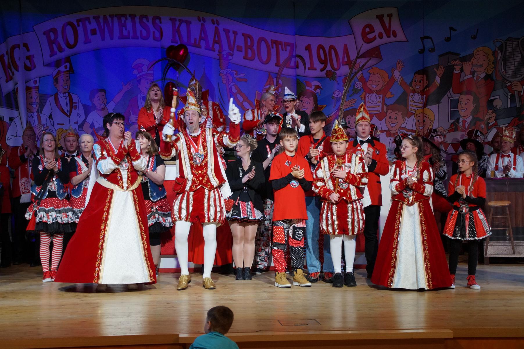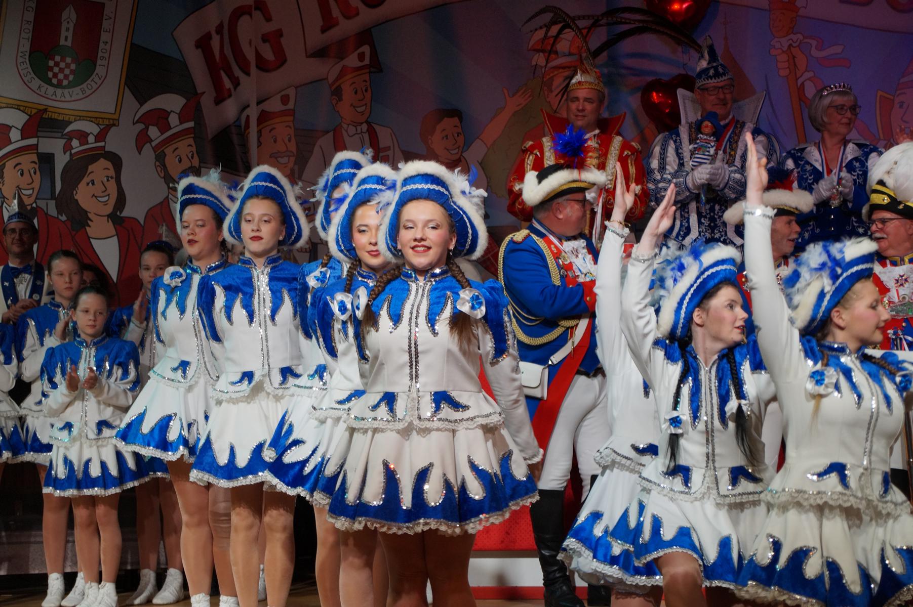 Ein weiterer Höhepunkt war der Auftritt der Prinzengarde der KG Rot-Weiß Klääv Botz, die in ihren rot-weißen Uniformen für ein eindrucksvolles Bild sorgte. Das Siebengebirgsprinzenpaar mit der Stücher KG aus Thomasberg, begleitet vom Spielmannszug der TV Eiche Bad Honnef, brachte das Bürgerhaus mit seinen Klängen noch einmal richtig in Bewegung.
