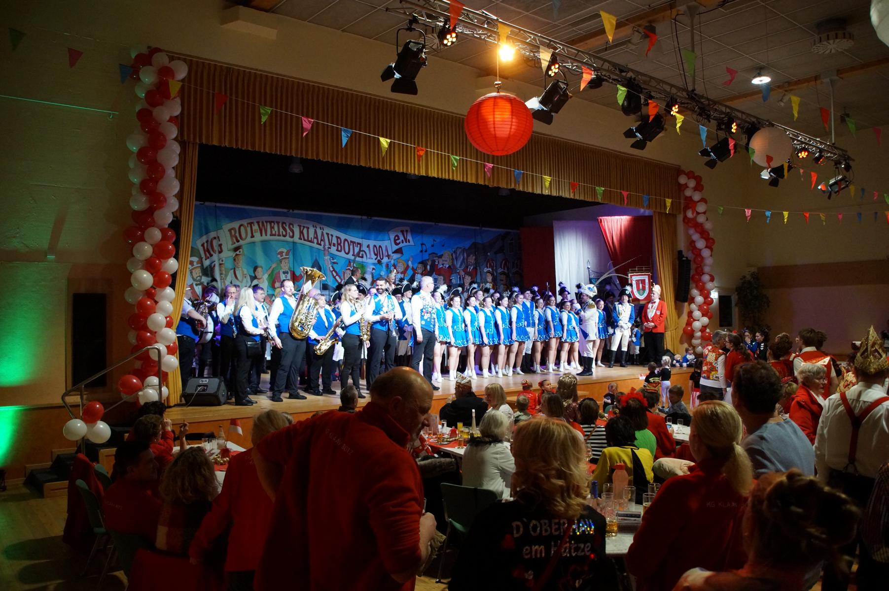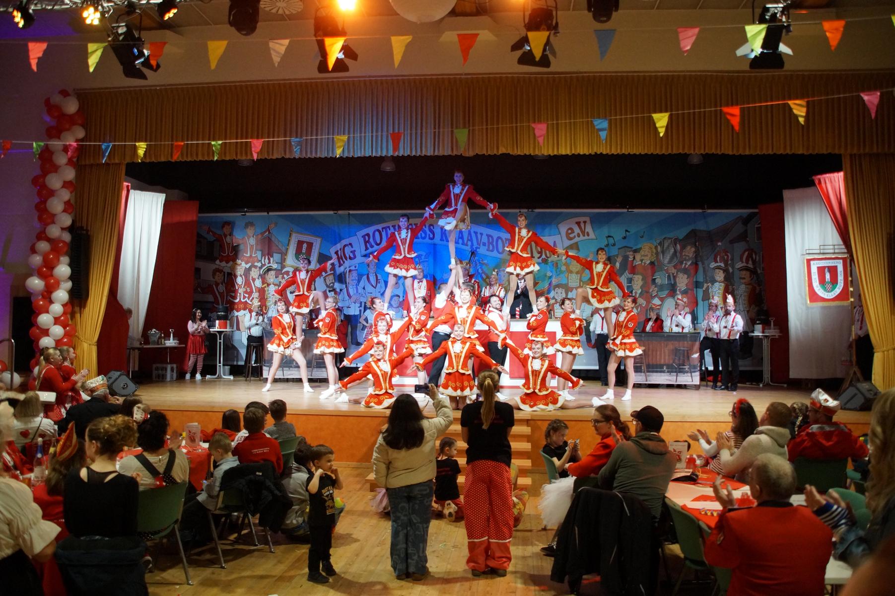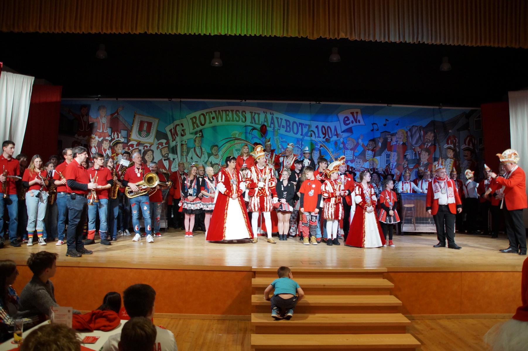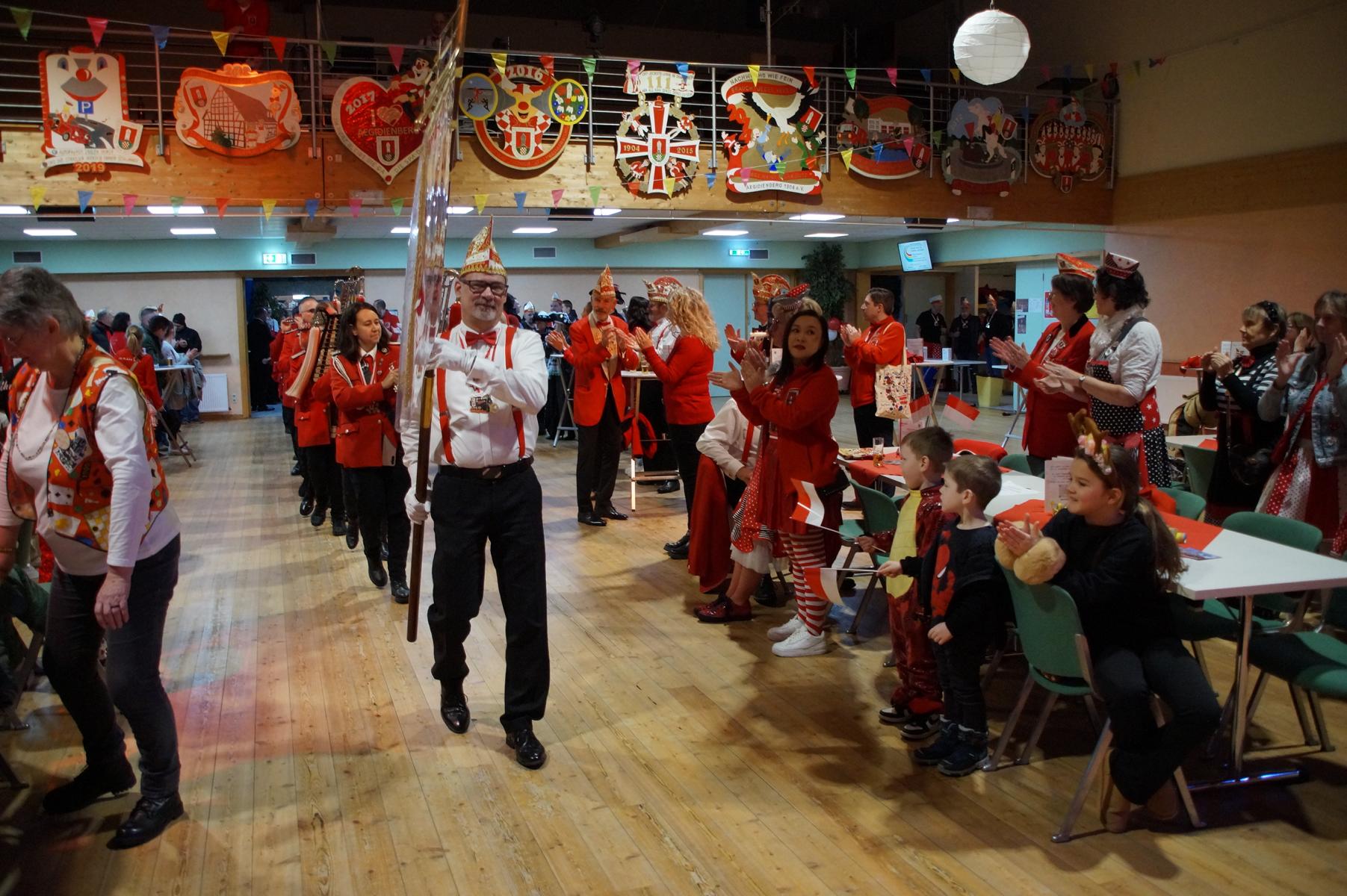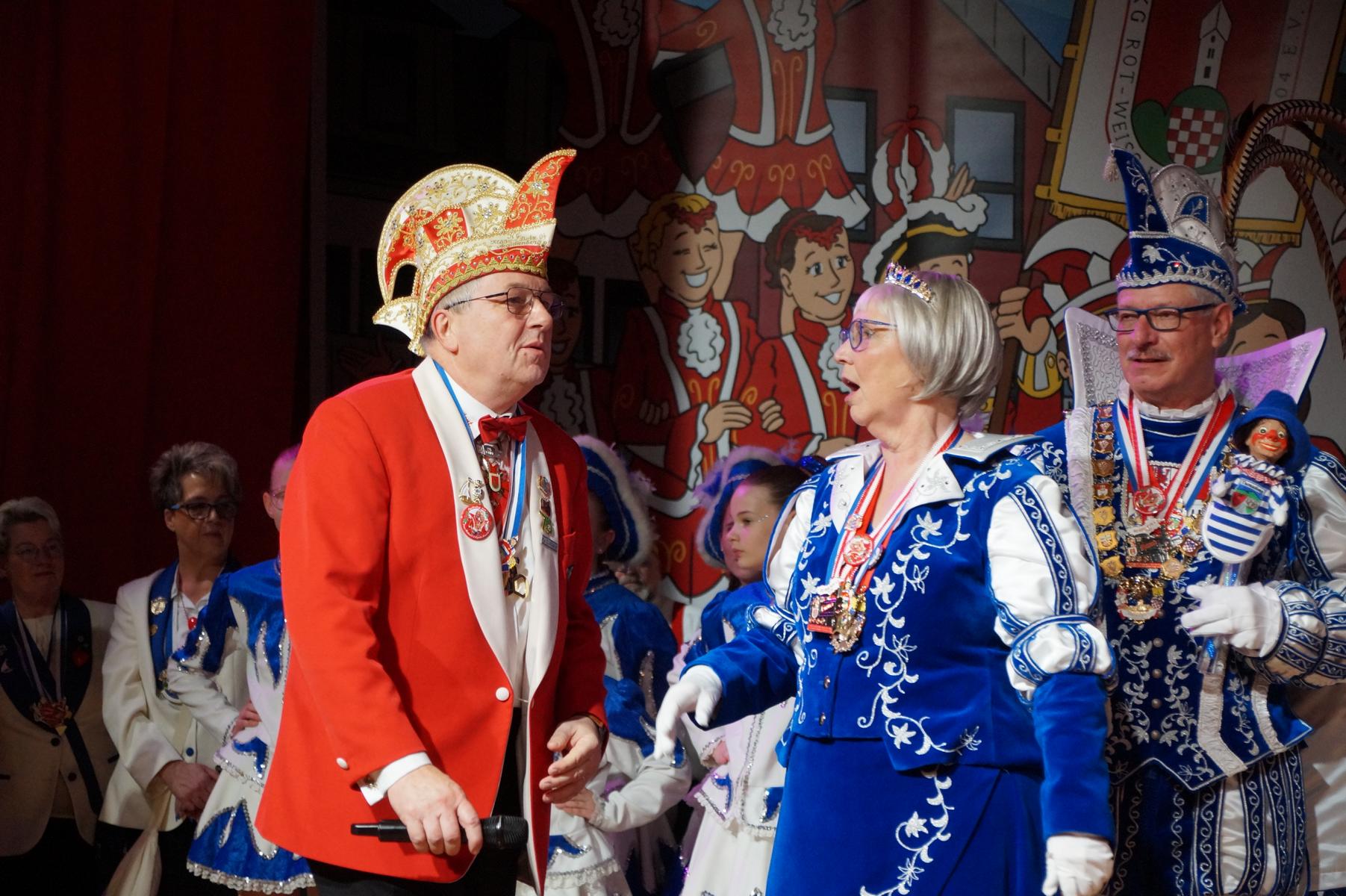 Ein weiterer Höhepunkt war der Auftritt der Prinzengarde der KG Rot-Weiß Klääv Botz, die in ihren rot-weißen Uniformen für ein eindrucksvolles Bild sorgte. Das Siebengebirgsprinzenpaar mit der Stücher KG aus Thomasberg, begleitet vom Spielmannszug der TV Eiche Bad Honnef, brachte das Bürgerhaus mit seinen Klängen noch einmal richtig in Bewegung.