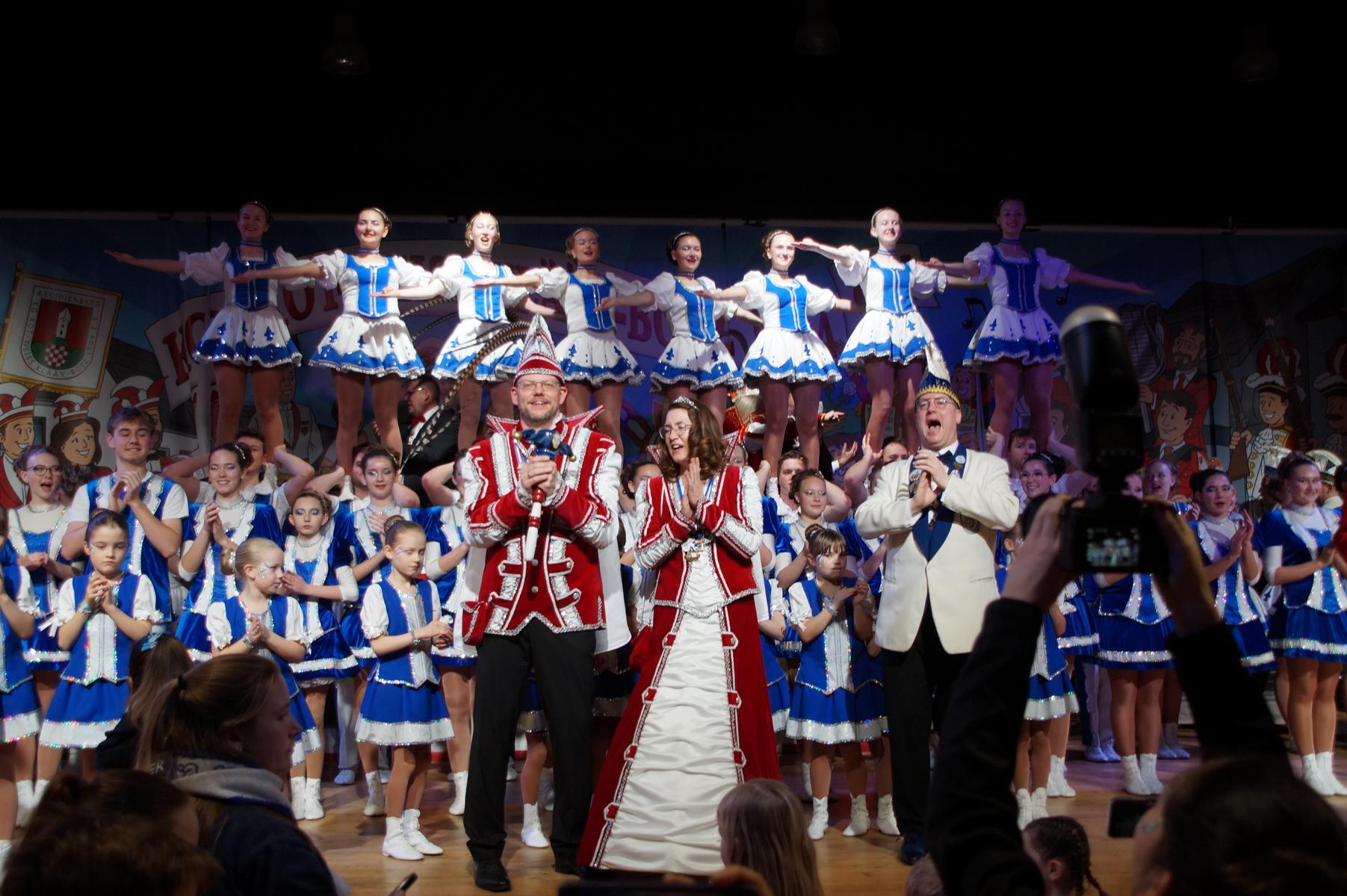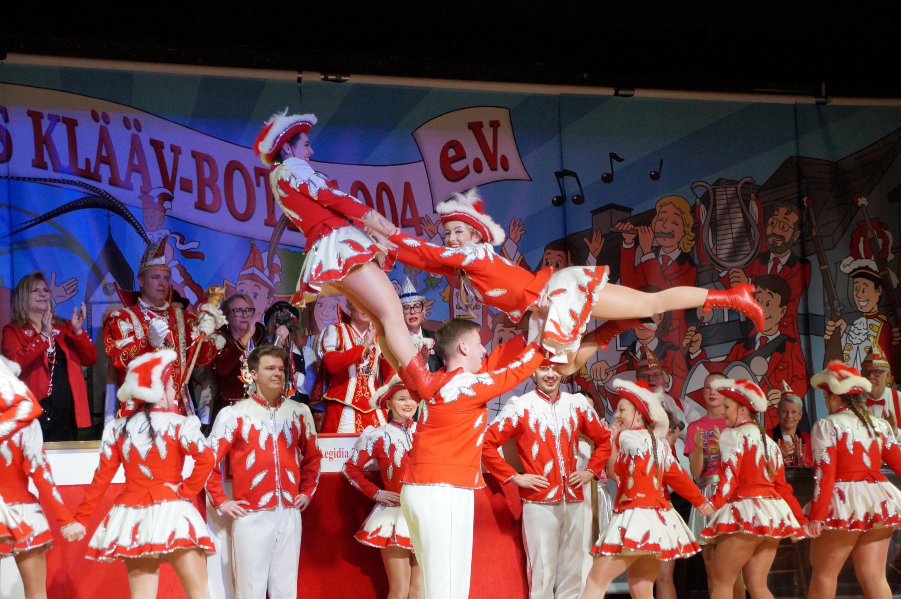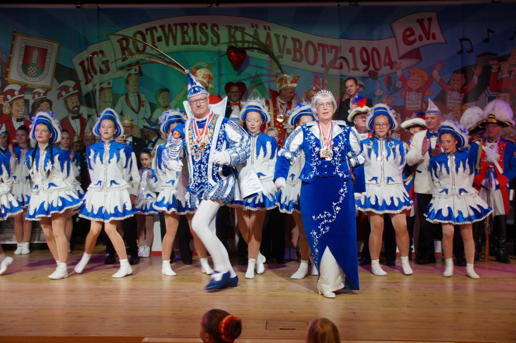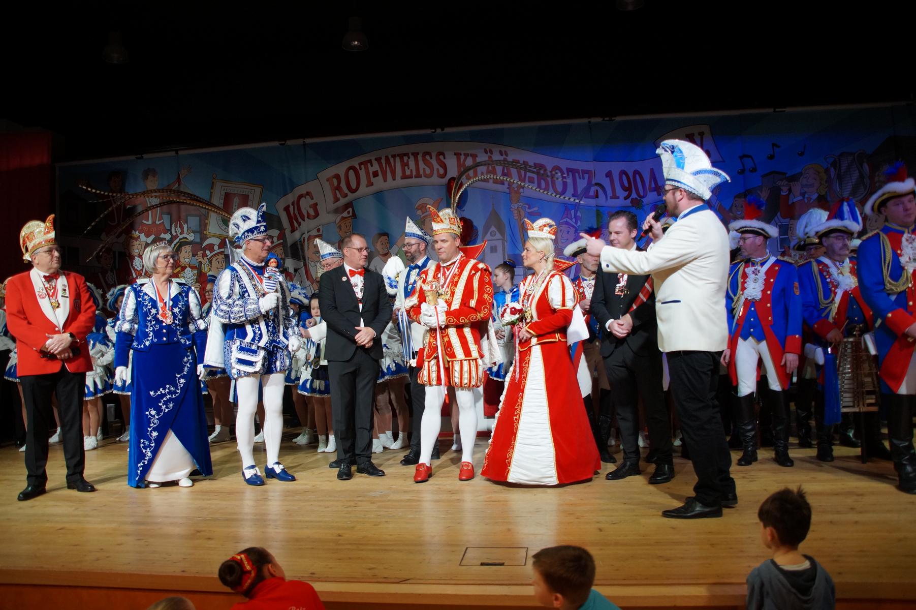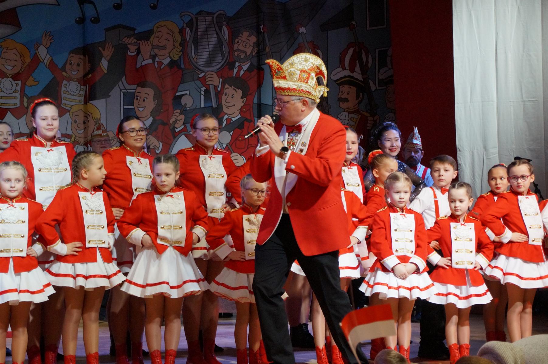 Ein weiterer Höhepunkt war der Auftritt der Prinzengarde der KG Rot-Weiß Klääv Botz, die in ihren rot-weißen Uniformen für ein eindrucksvolles Bild sorgte. Das Siebengebirgsprinzenpaar mit der Stücher KG aus Thomasberg, begleitet vom Spielmannszug der TV Eiche Bad Honnef, brachte das Bürgerhaus mit seinen Klängen noch einmal richtig in Bewegung.