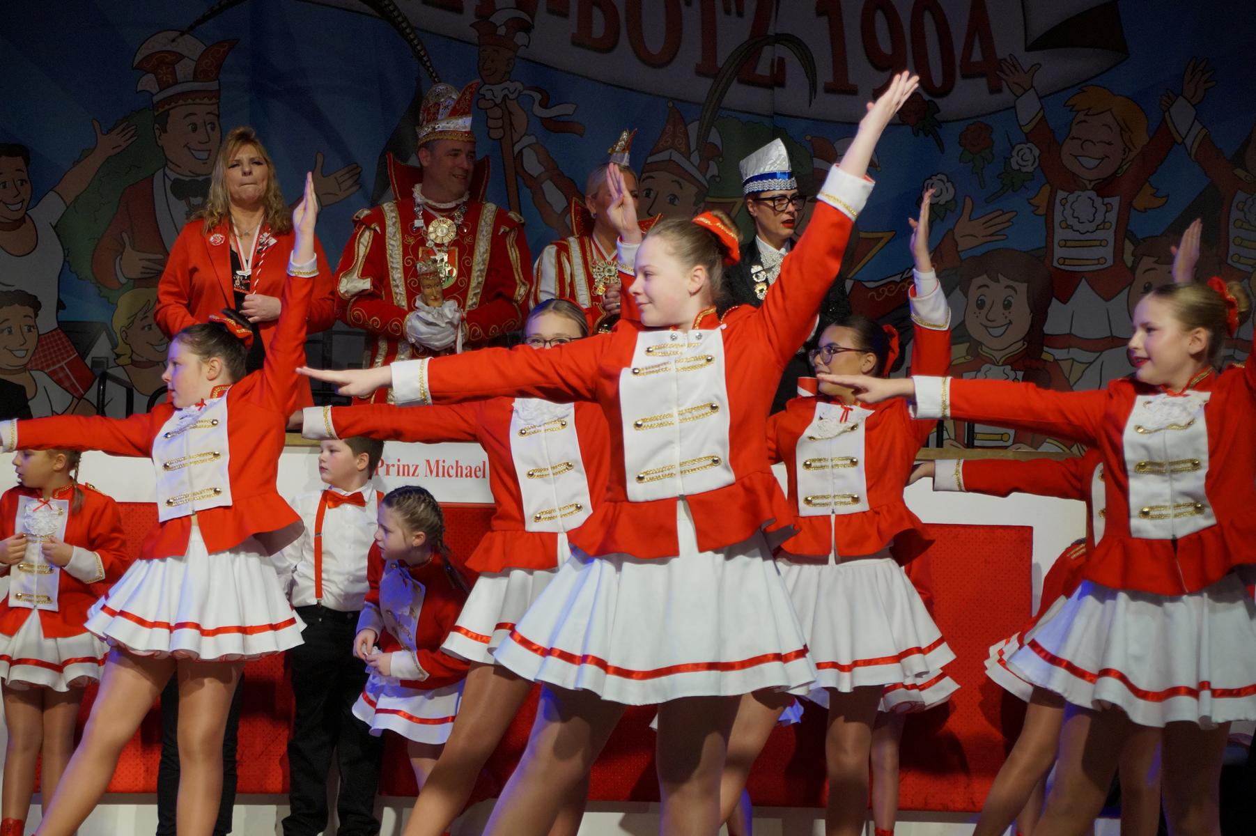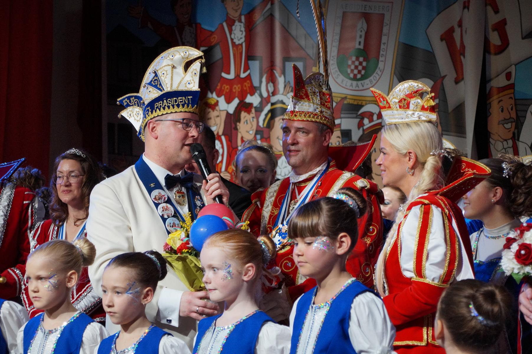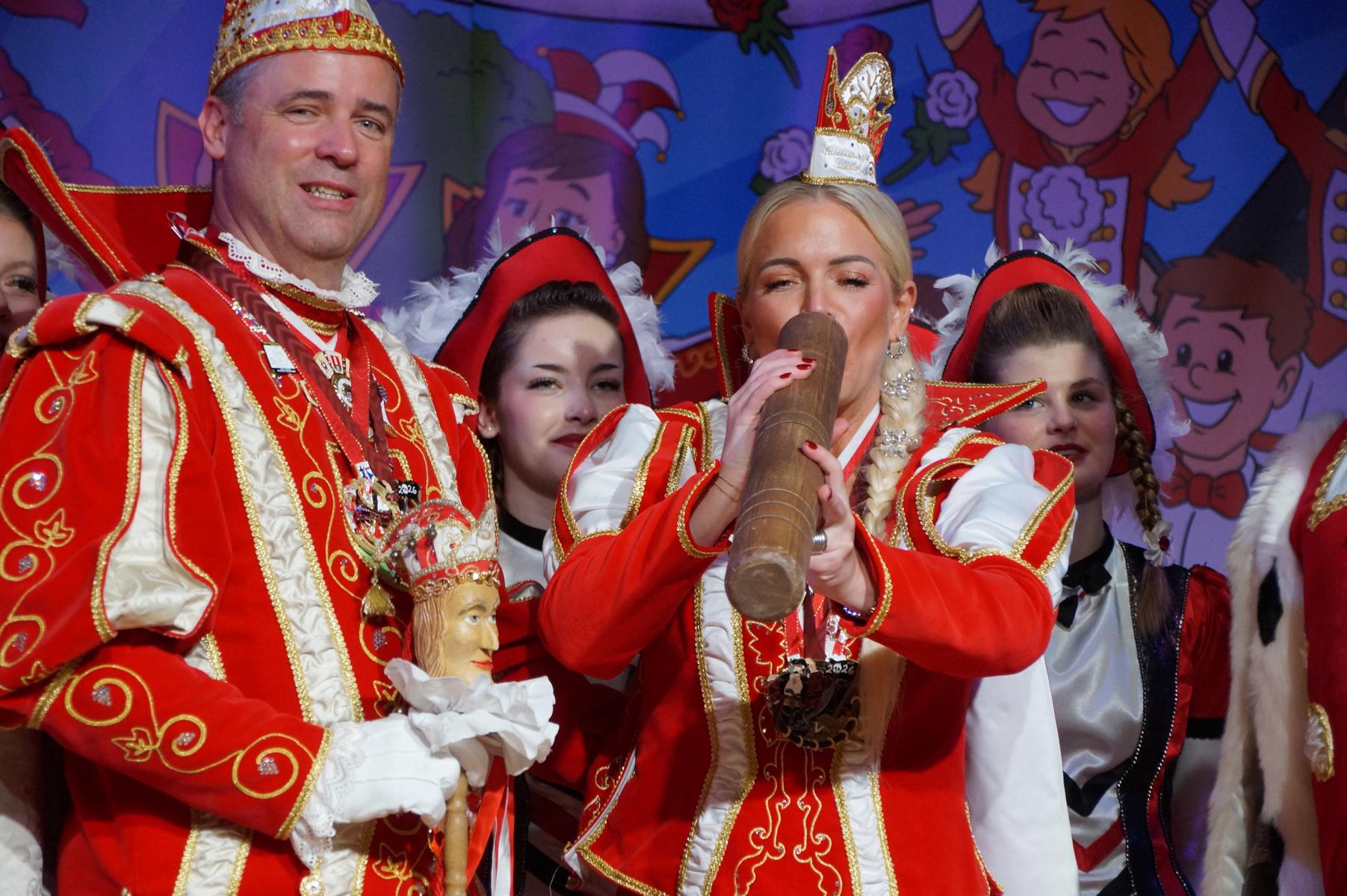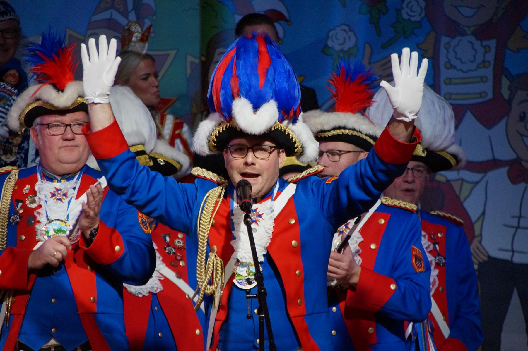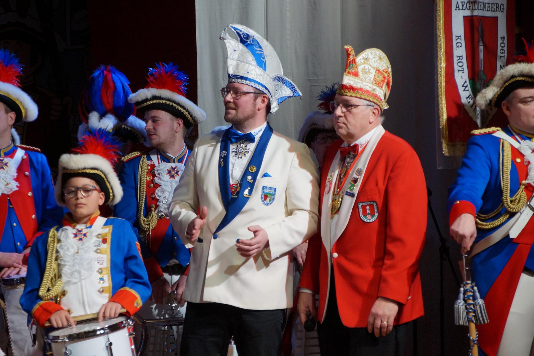 Ein weiterer Höhepunkt war der Auftritt der Prinzengarde der KG Rot-Weiß Klääv Botz, die in ihren rot-weißen Uniformen für ein eindrucksvolles Bild sorgte. Das Siebengebirgsprinzenpaar mit der Stücher KG aus Thomasberg, begleitet vom Spielmannszug der TV Eiche Bad Honnef, brachte das Bürgerhaus mit seinen Klängen noch einmal richtig in Bewegung.