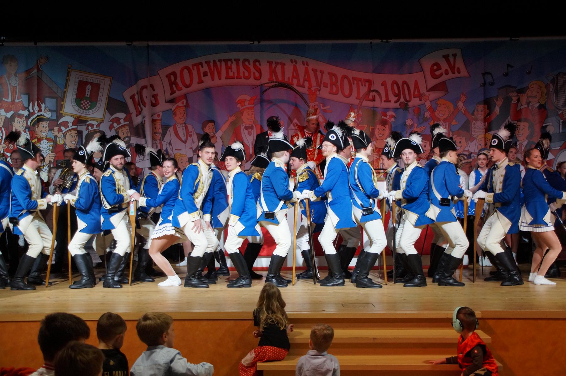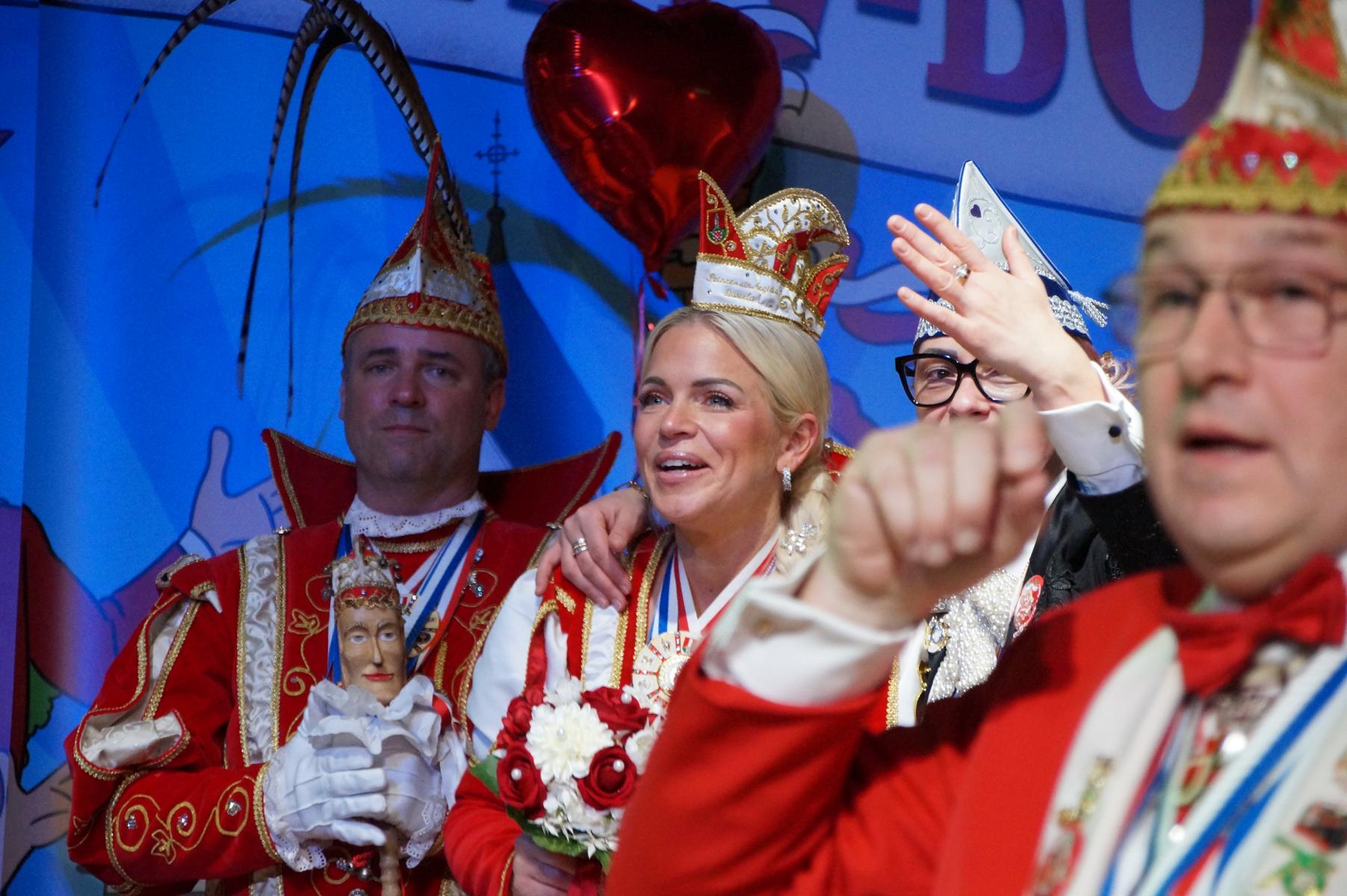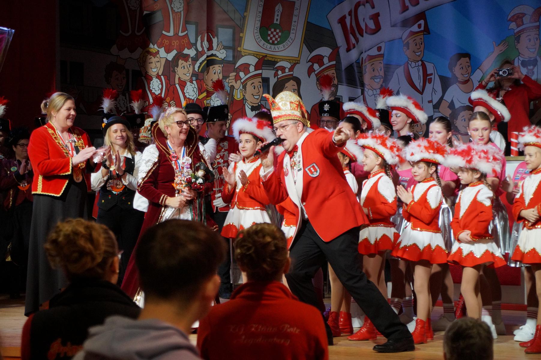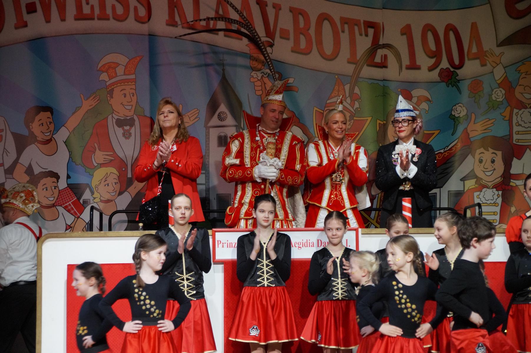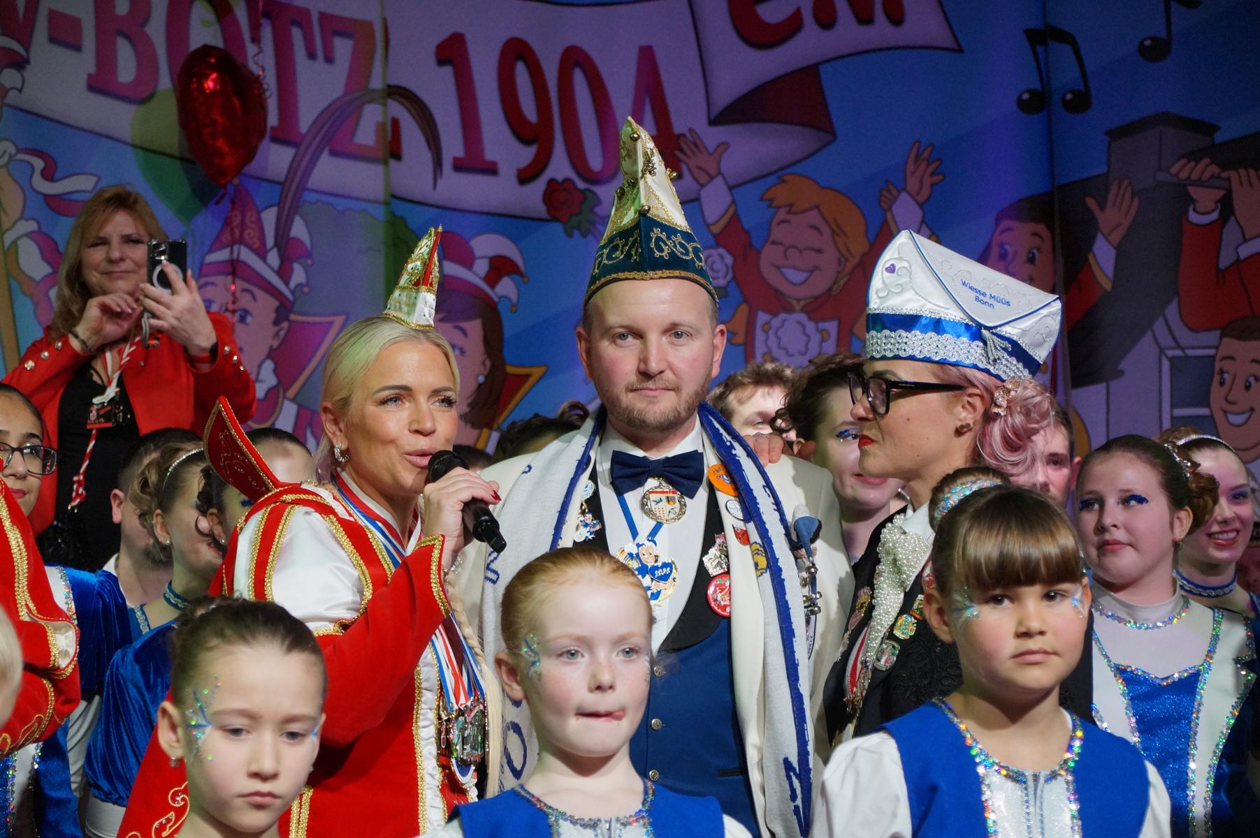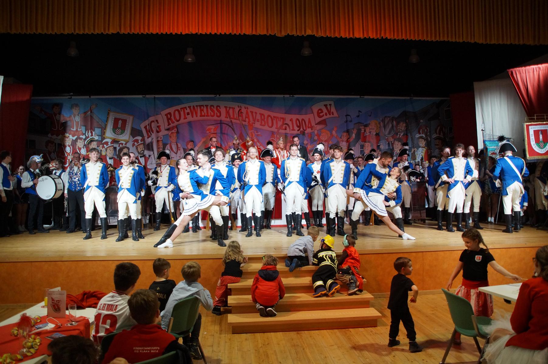 Ein weiterer Höhepunkt war der Auftritt der Prinzengarde der KG Rot-Weiß Klääv Botz, die in ihren rot-weißen Uniformen für ein eindrucksvolles Bild sorgte. Das Siebengebirgsprinzenpaar mit der Stücher KG aus Thomasberg, begleitet vom Spielmannszug der TV Eiche Bad Honnef, brachte das Bürgerhaus mit seinen Klängen noch einmal richtig in Bewegung.