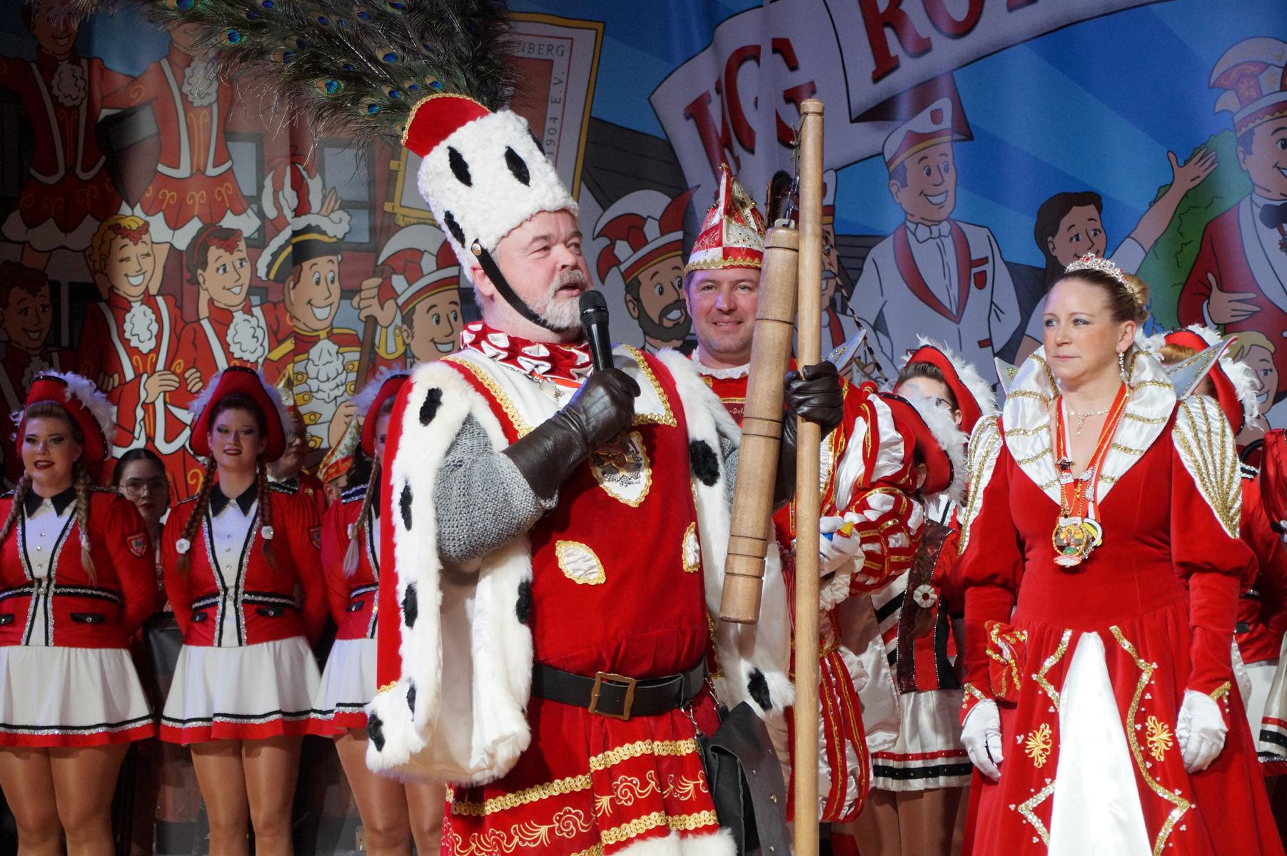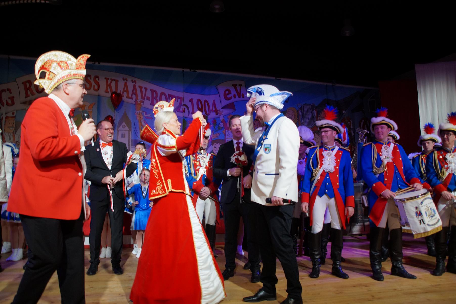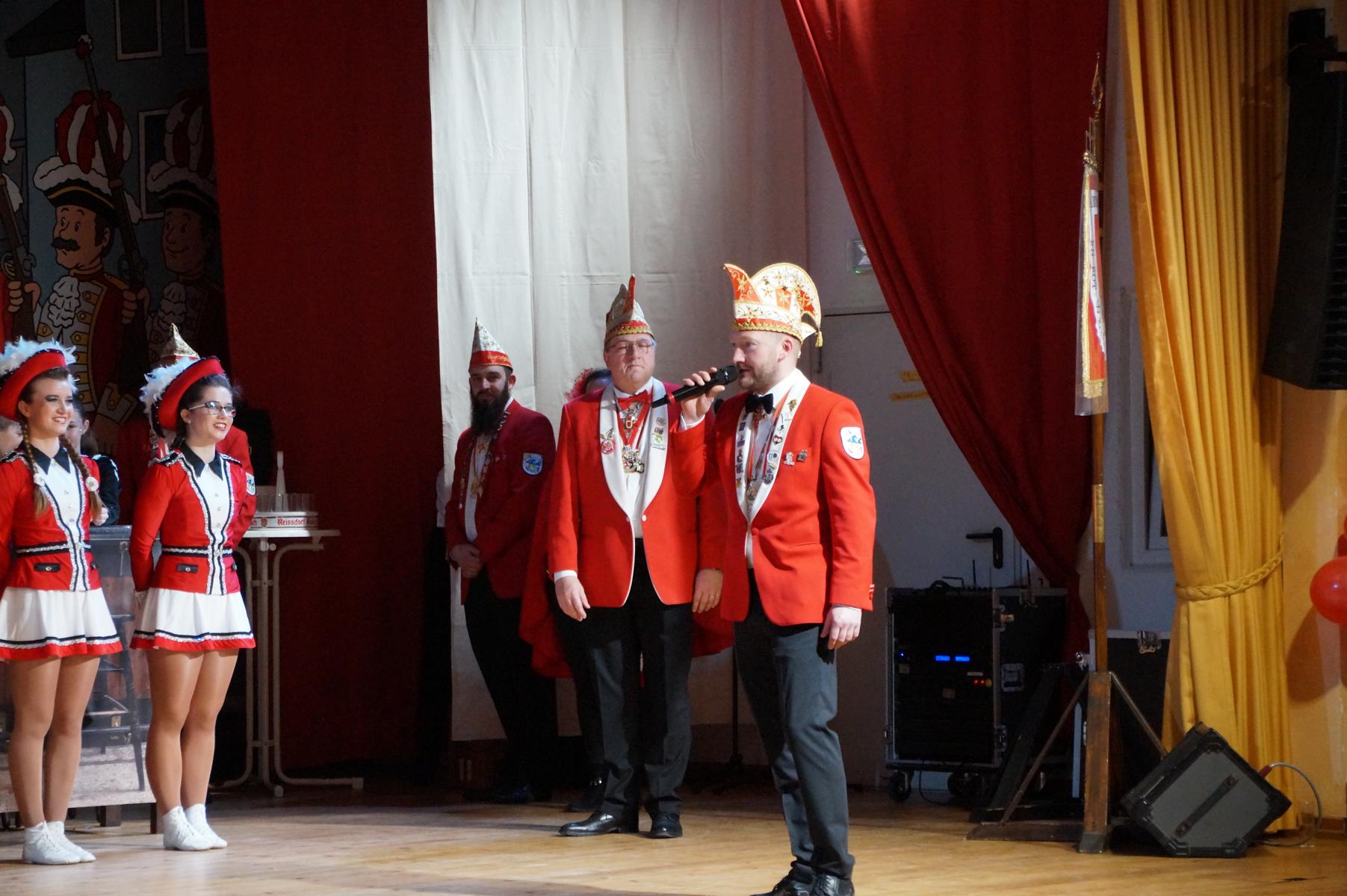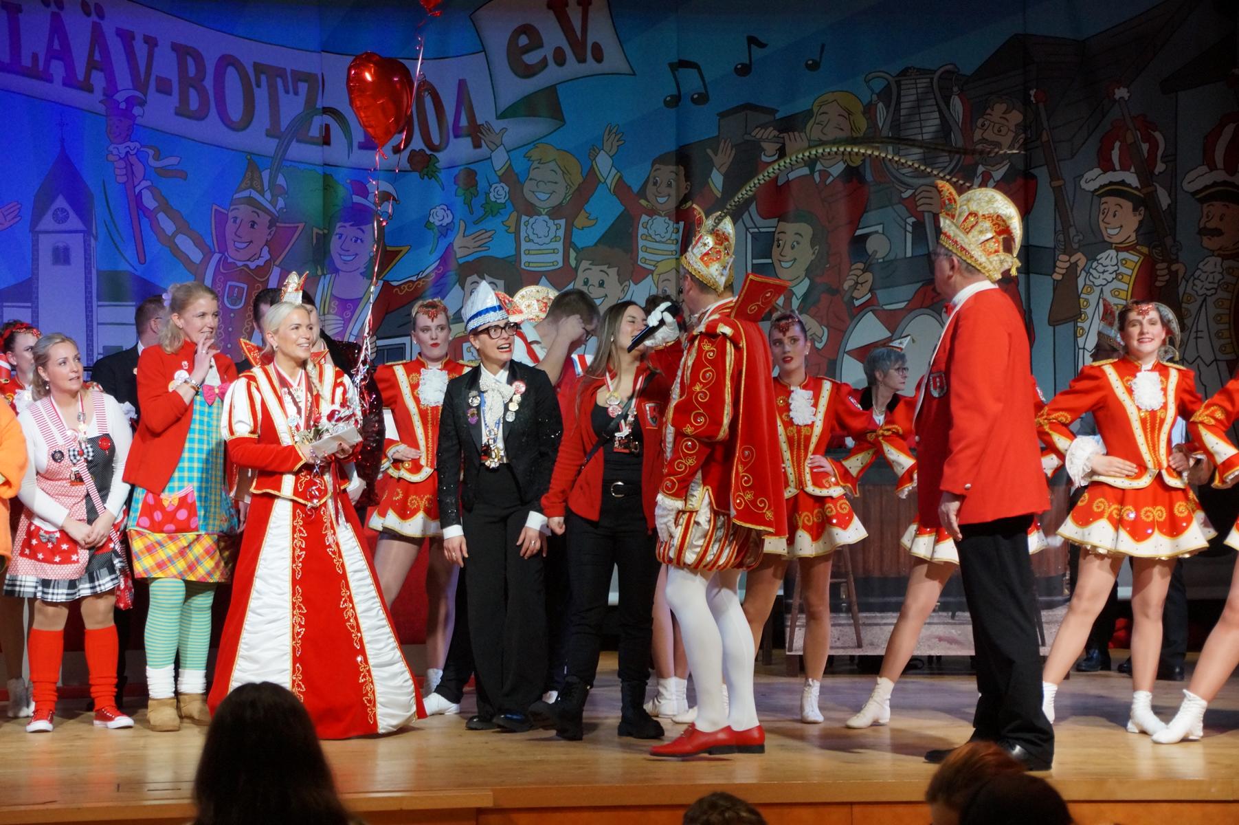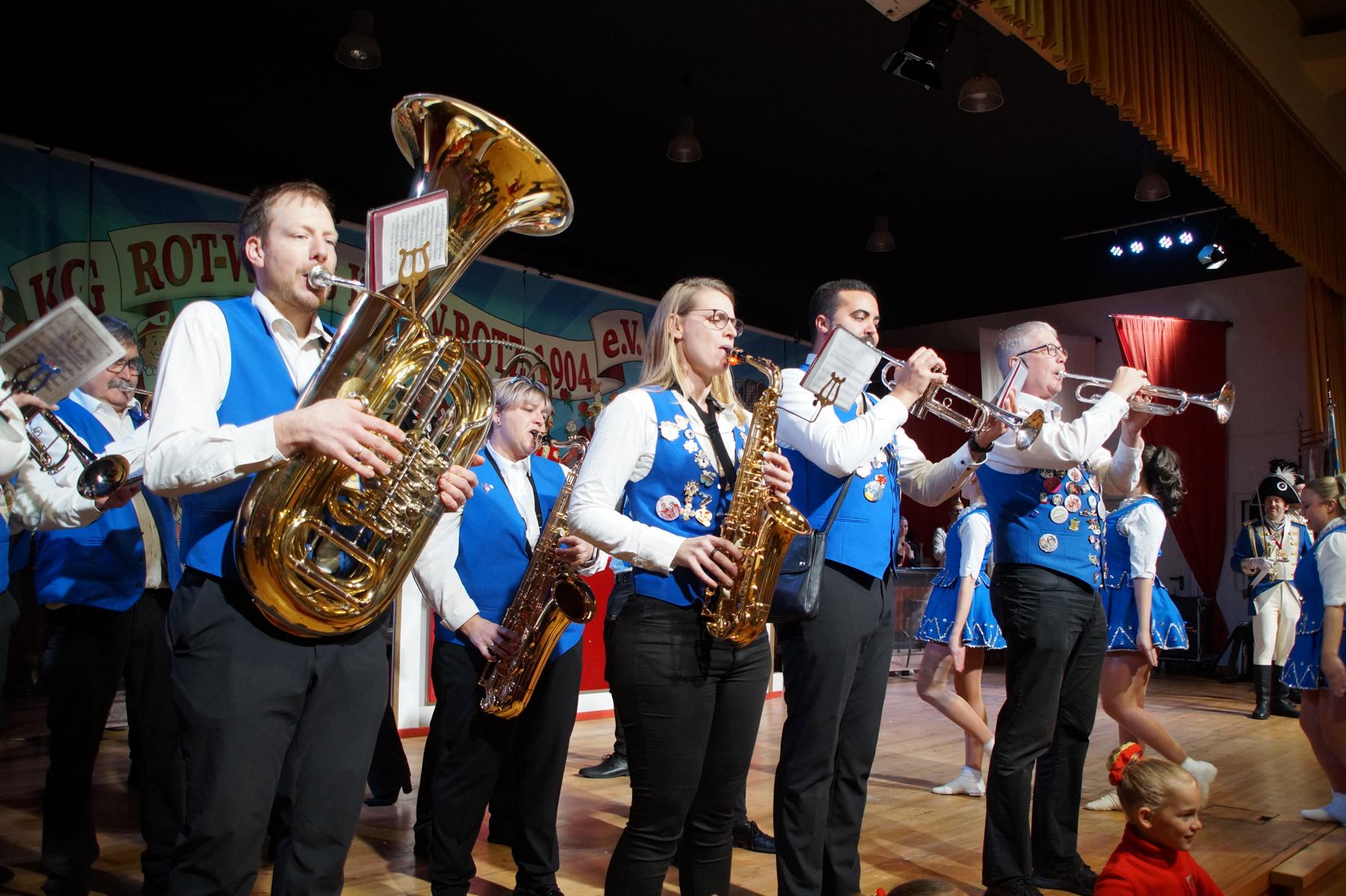 Ein weiterer Höhepunkt war der Auftritt der Prinzengarde der KG Rot-Weiß Klääv Botz, die in ihren rot-weißen Uniformen für ein eindrucksvolles Bild sorgte. Das Siebengebirgsprinzenpaar mit der Stücher KG aus Thomasberg, begleitet vom Spielmannszug der TV Eiche Bad Honnef, brachte das Bürgerhaus mit seinen Klängen noch einmal richtig in Bewegung.