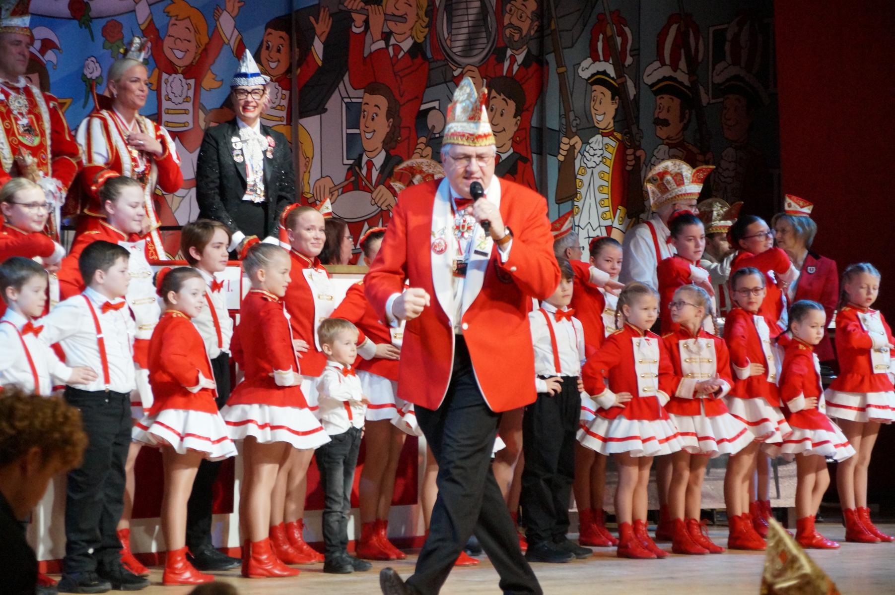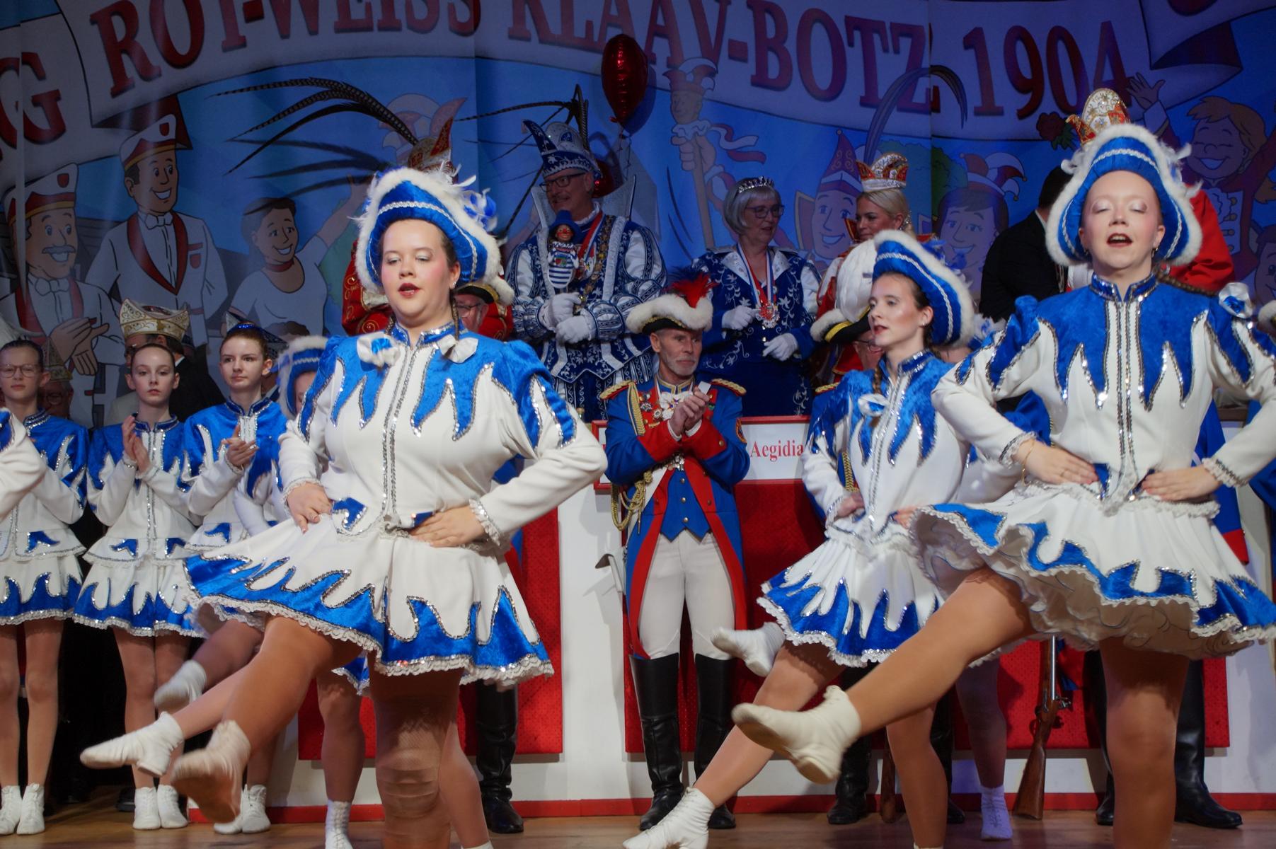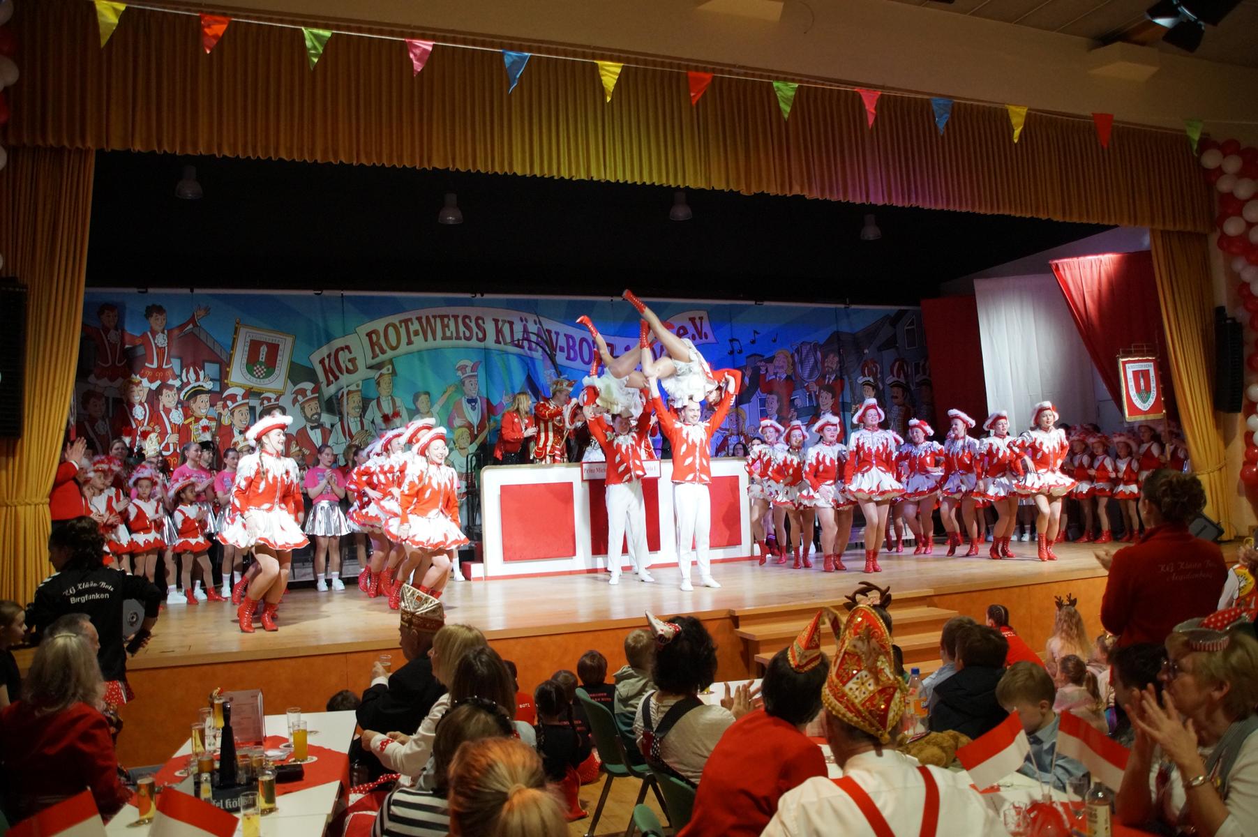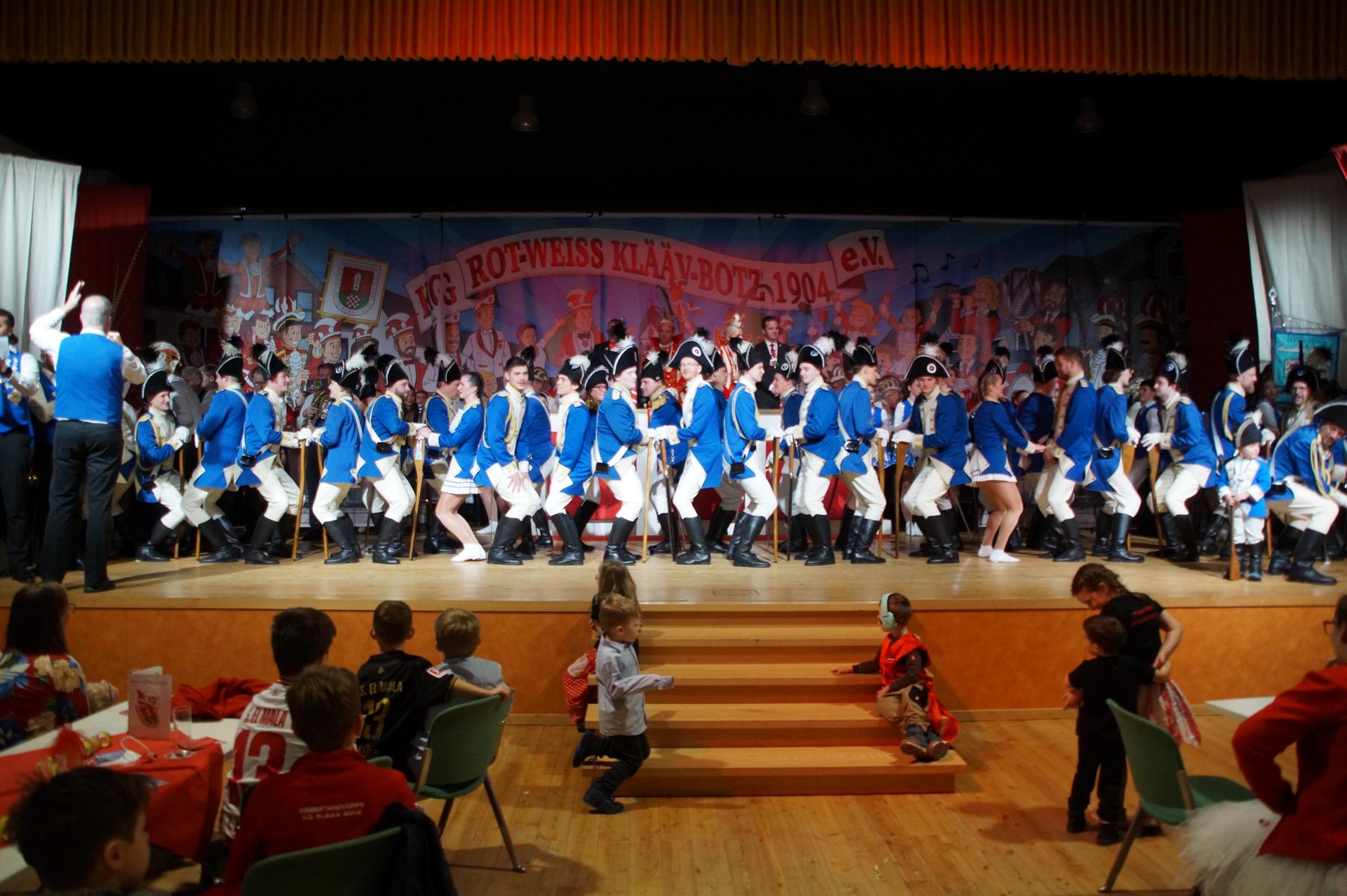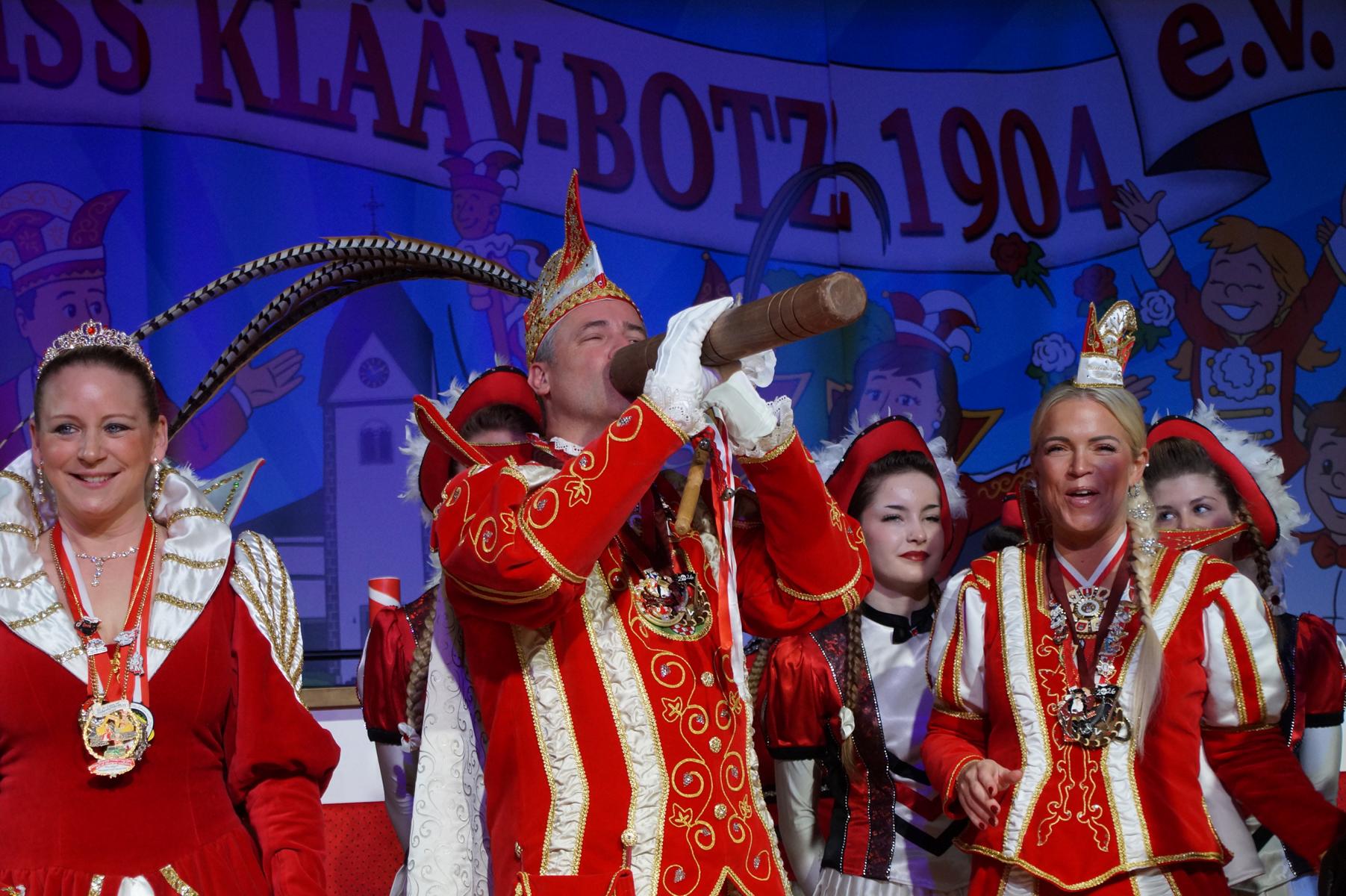 Ein weiterer Höhepunkt war der Auftritt der Prinzengarde der KG Rot-Weiß Klääv Botz, die in ihren rot-weißen Uniformen für ein eindrucksvolles Bild sorgte. Das Siebengebirgsprinzenpaar mit der Stücher KG aus Thomasberg, begleitet vom Spielmannszug der TV Eiche Bad Honnef, brachte das Bürgerhaus mit seinen Klängen noch einmal richtig in Bewegung.