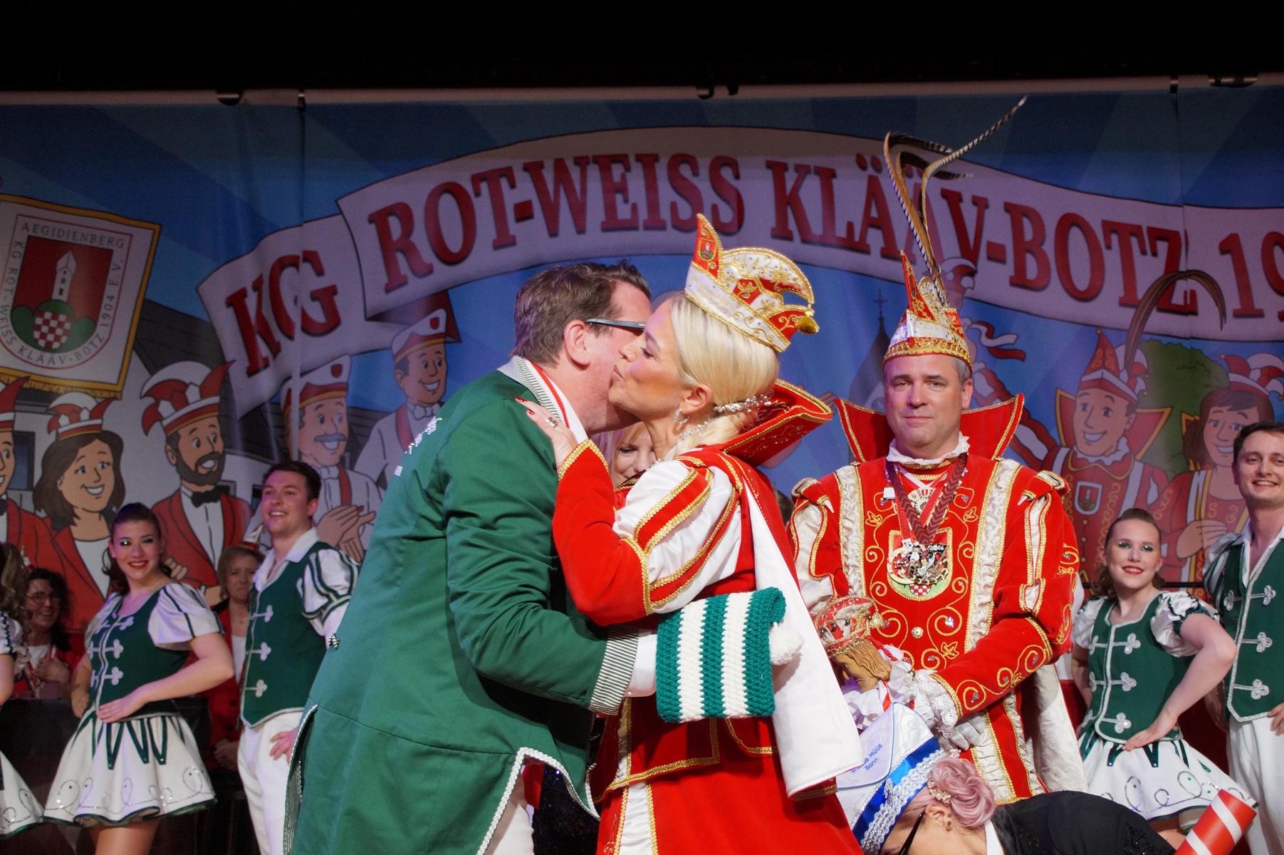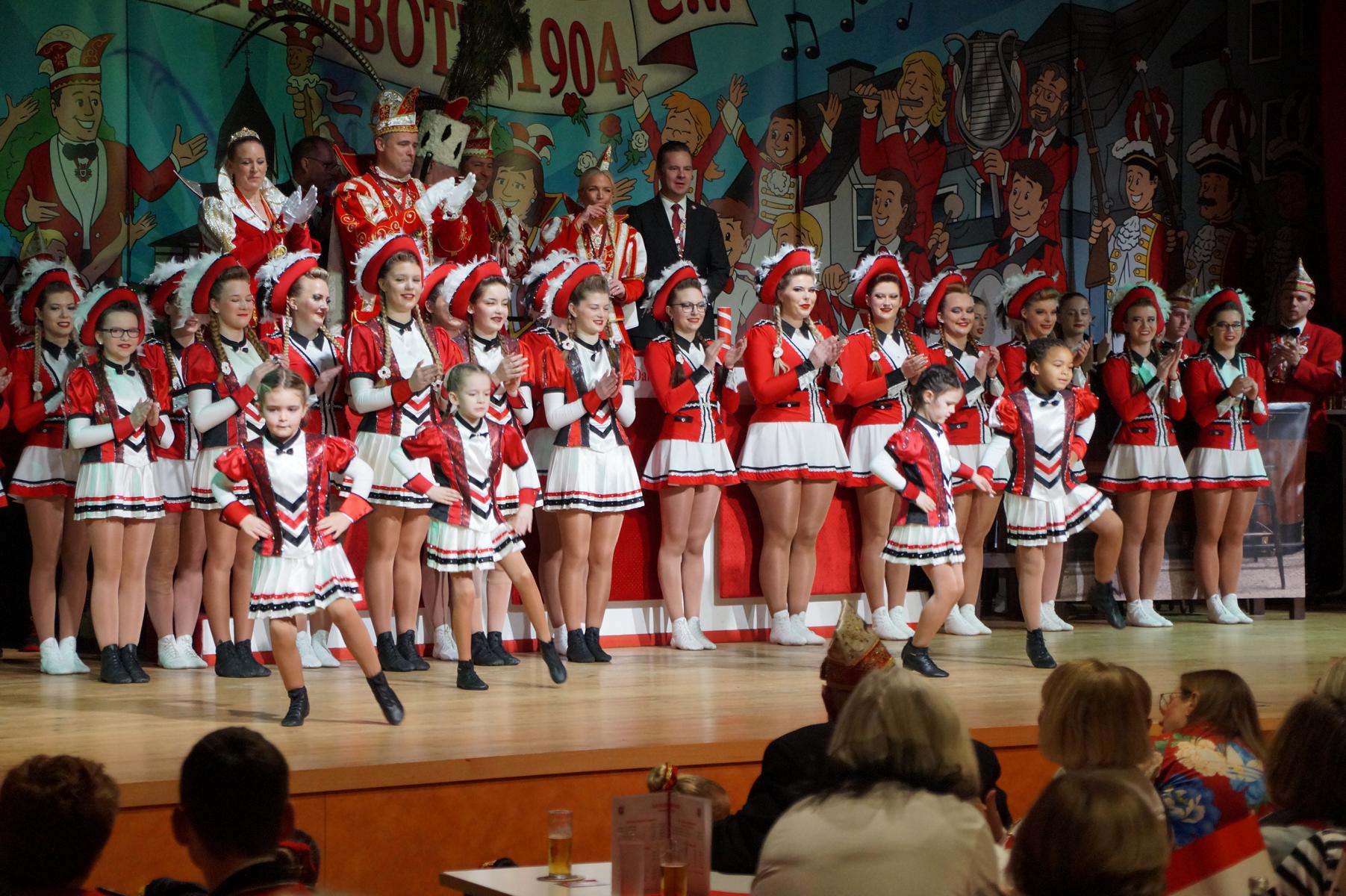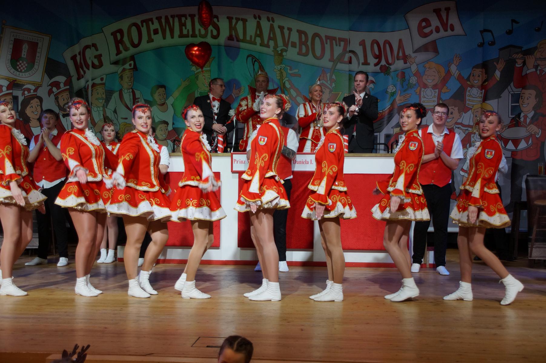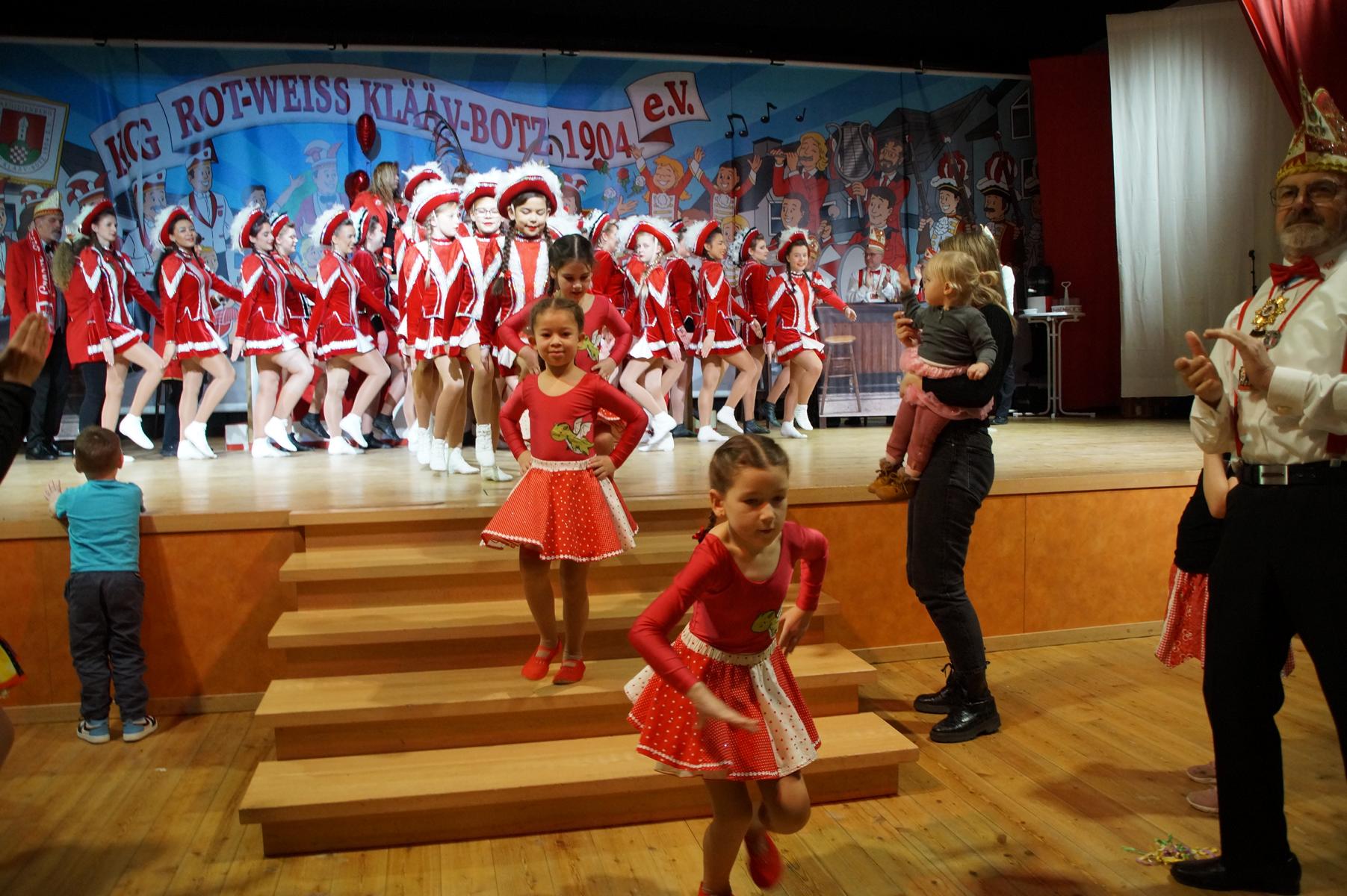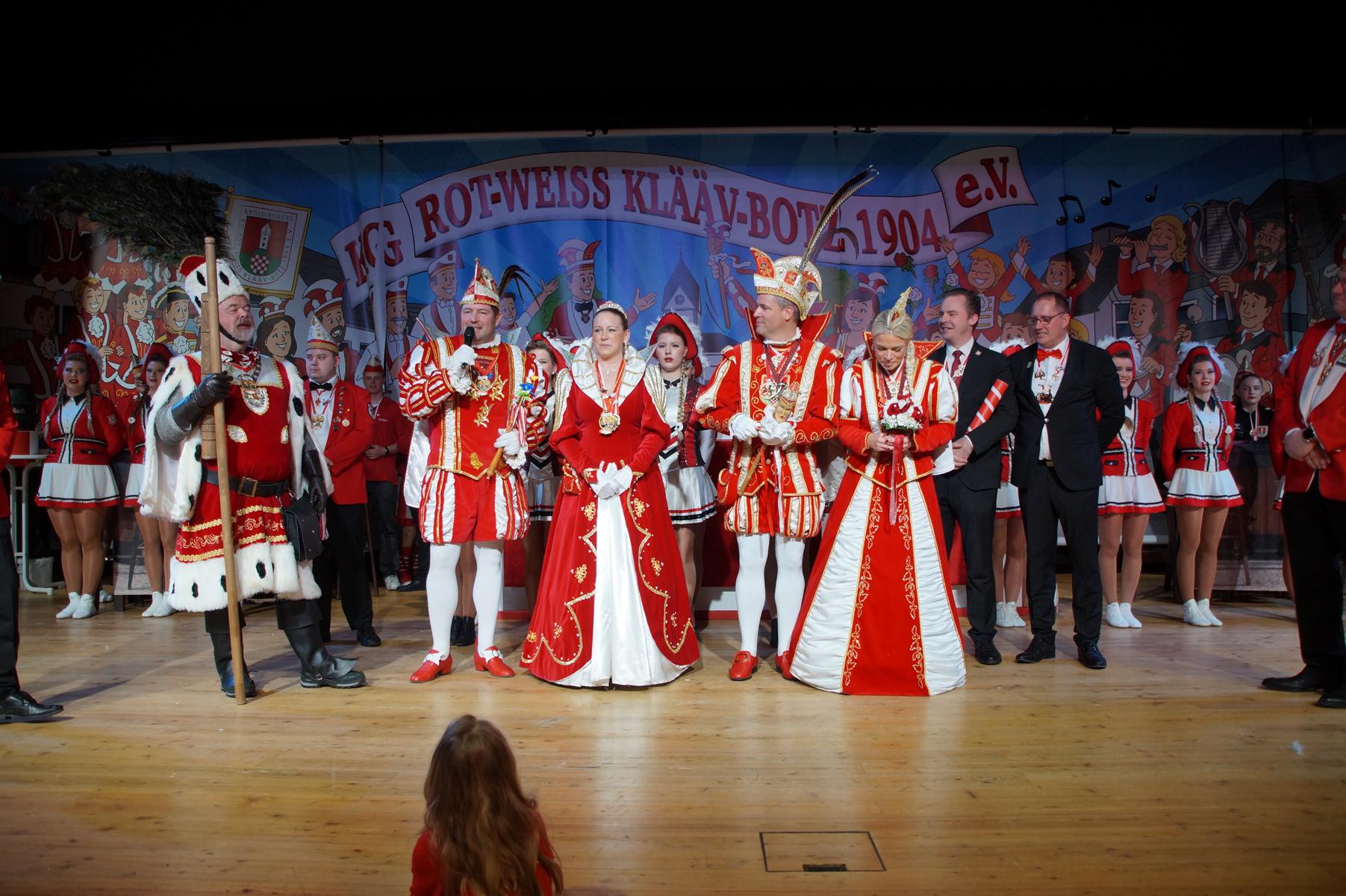 Ein weiterer Höhepunkt war der Auftritt der Prinzengarde der KG Rot-Weiß Klääv Botz, die in ihren rot-weißen Uniformen für ein eindrucksvolles Bild sorgte. Das Siebengebirgsprinzenpaar mit der Stücher KG aus Thomasberg, begleitet vom Spielmannszug der TV Eiche Bad Honnef, brachte das Bürgerhaus mit seinen Klängen noch einmal richtig in Bewegung.