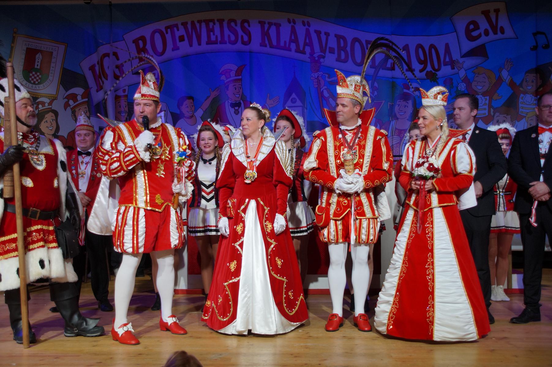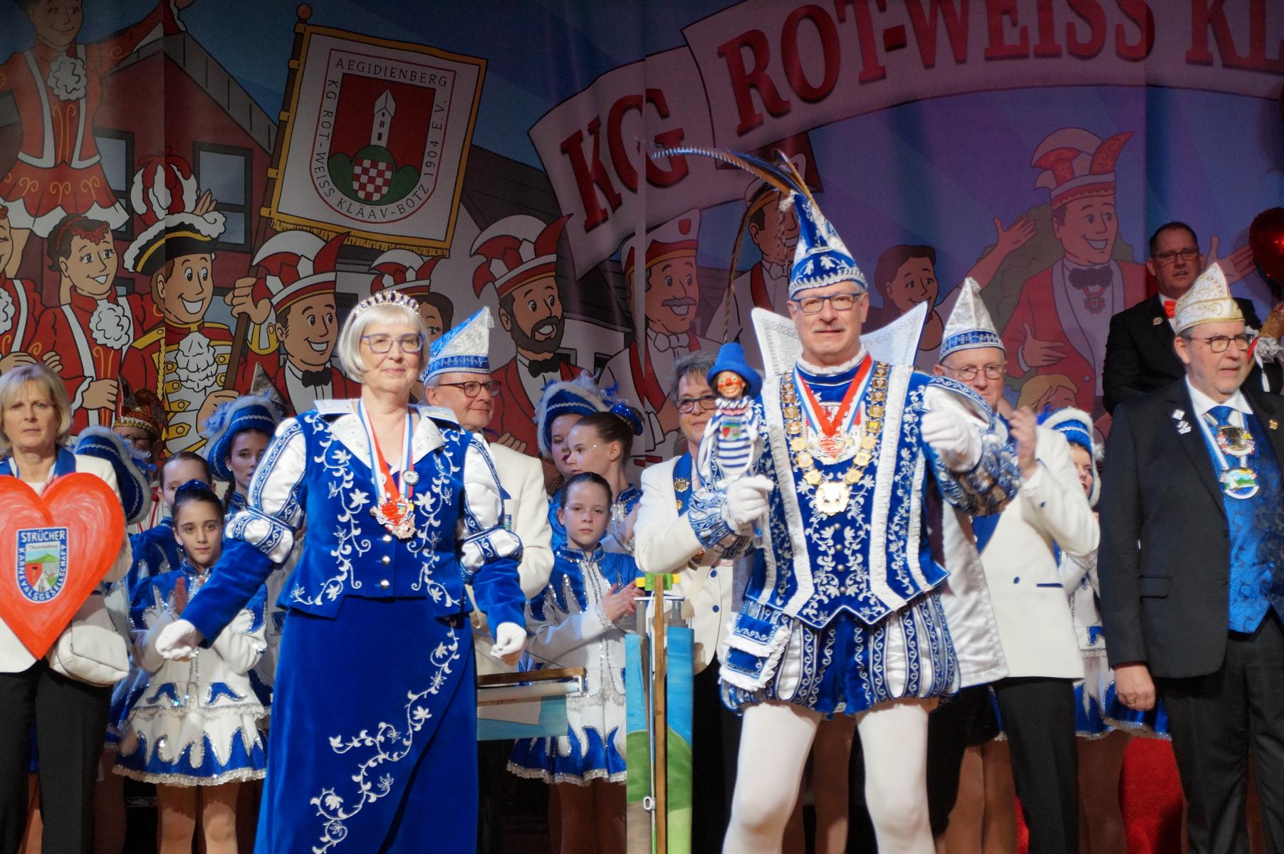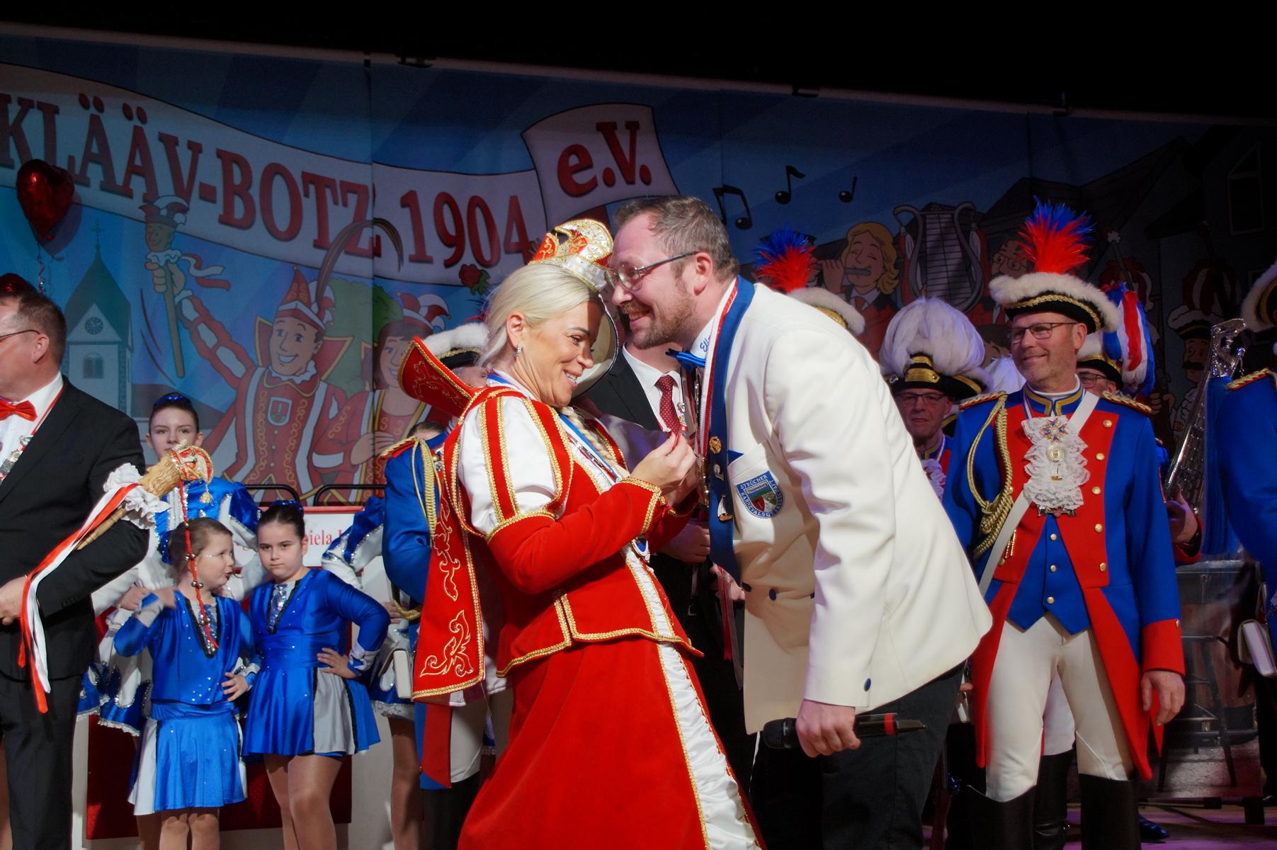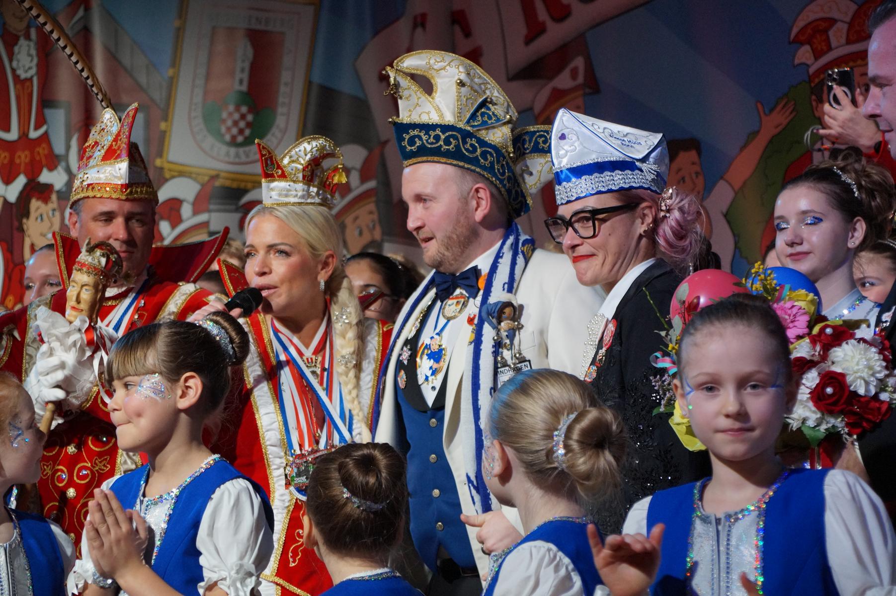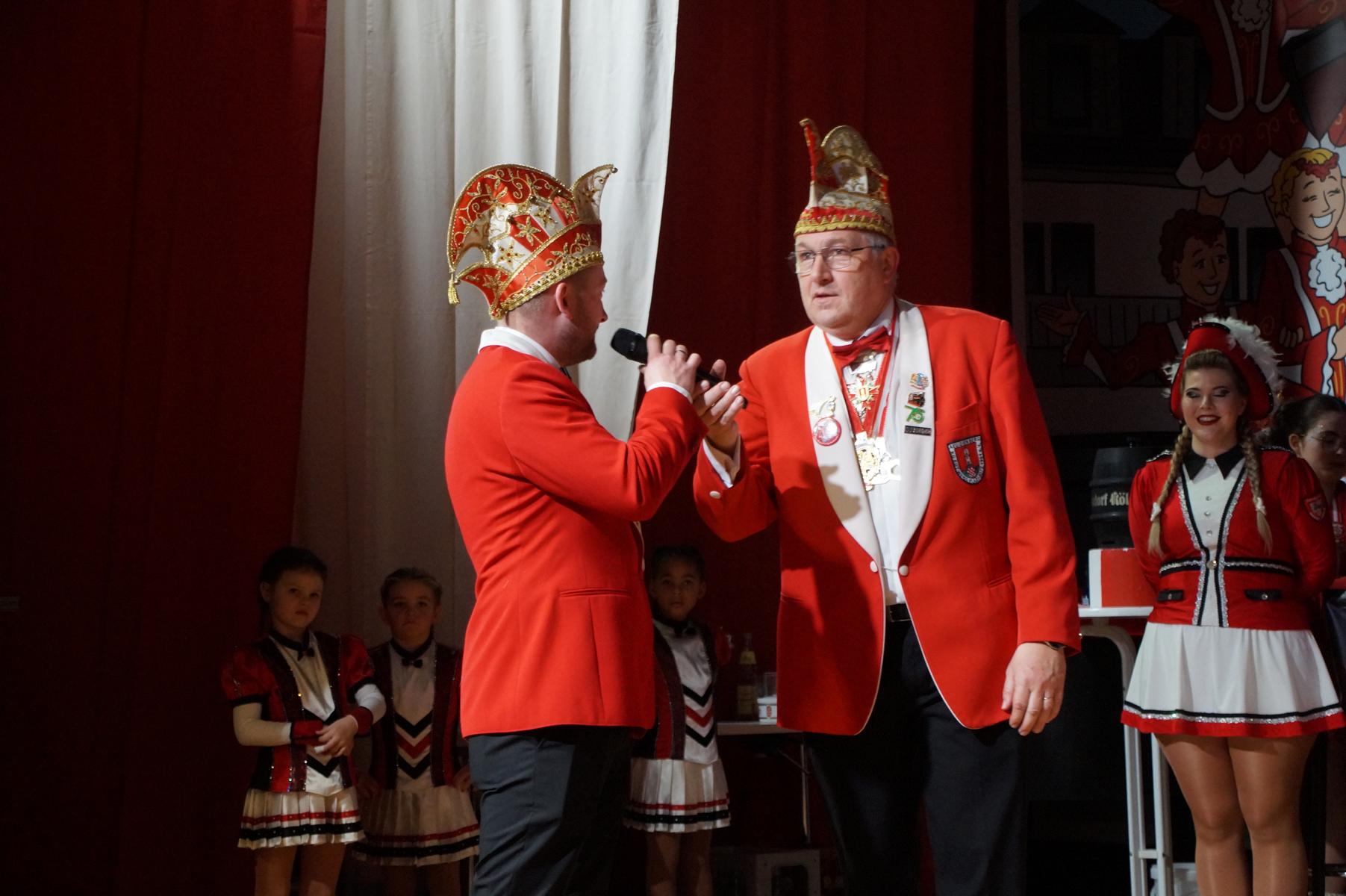 Ein weiterer Höhepunkt war der Auftritt der Prinzengarde der KG Rot-Weiß Klääv Botz, die in ihren rot-weißen Uniformen für ein eindrucksvolles Bild sorgte. Das Siebengebirgsprinzenpaar mit der Stücher KG aus Thomasberg, begleitet vom Spielmannszug der TV Eiche Bad Honnef, brachte das Bürgerhaus mit seinen Klängen noch einmal richtig in Bewegung.
