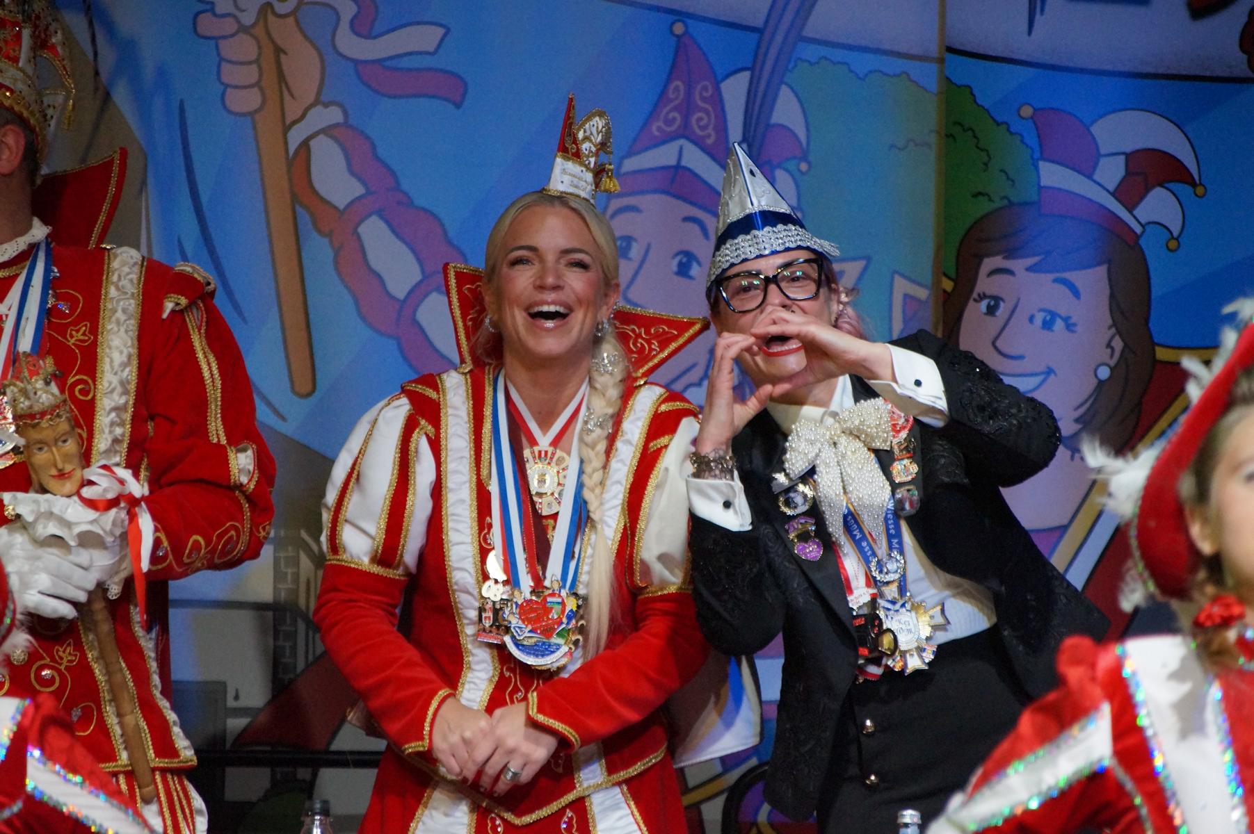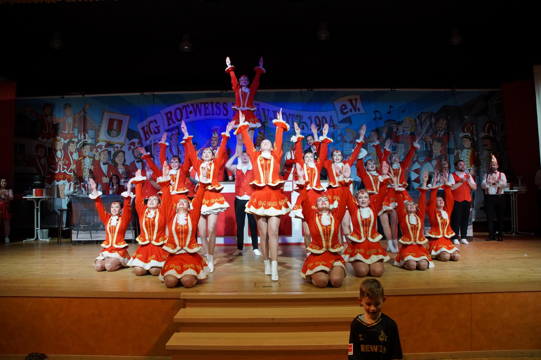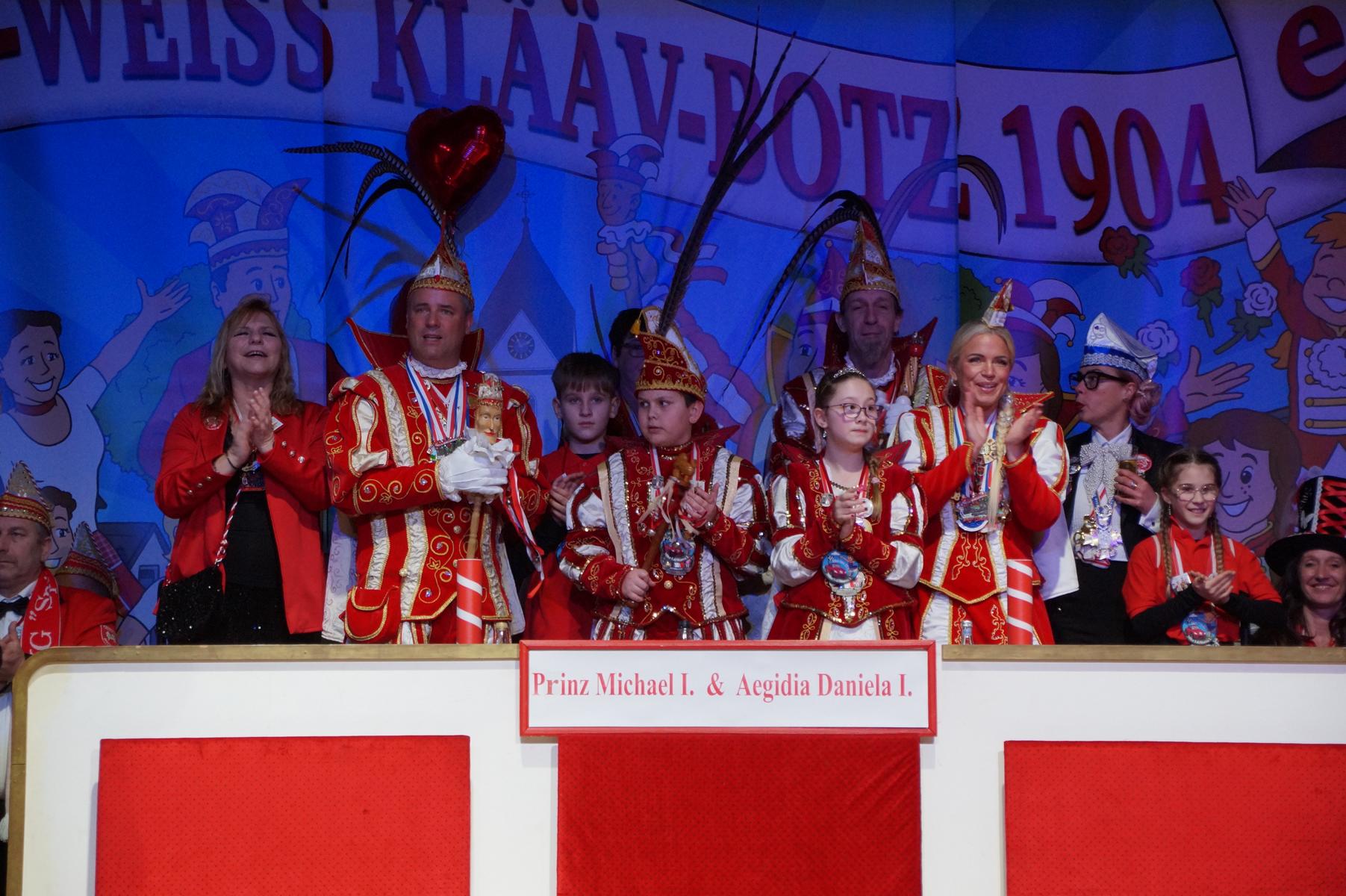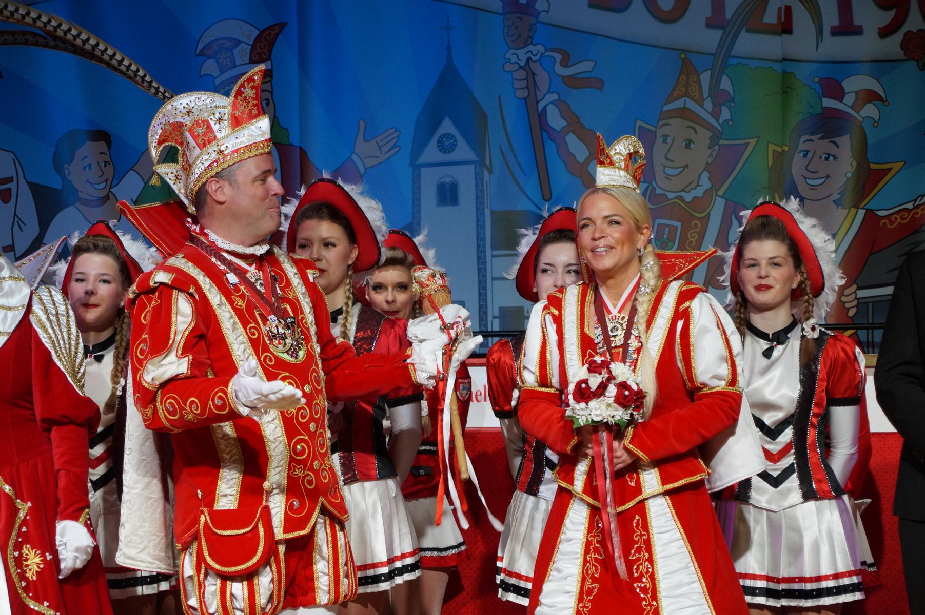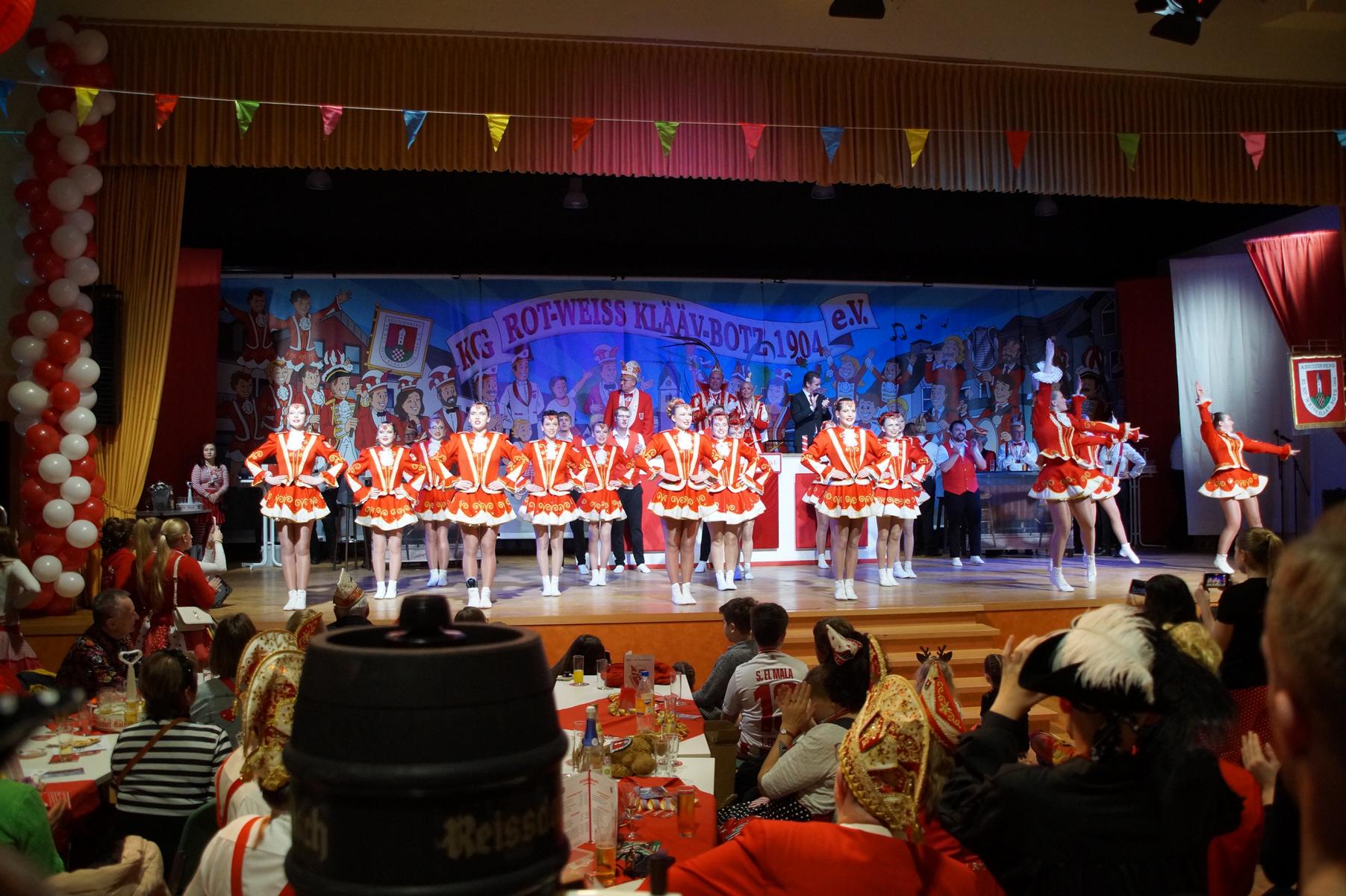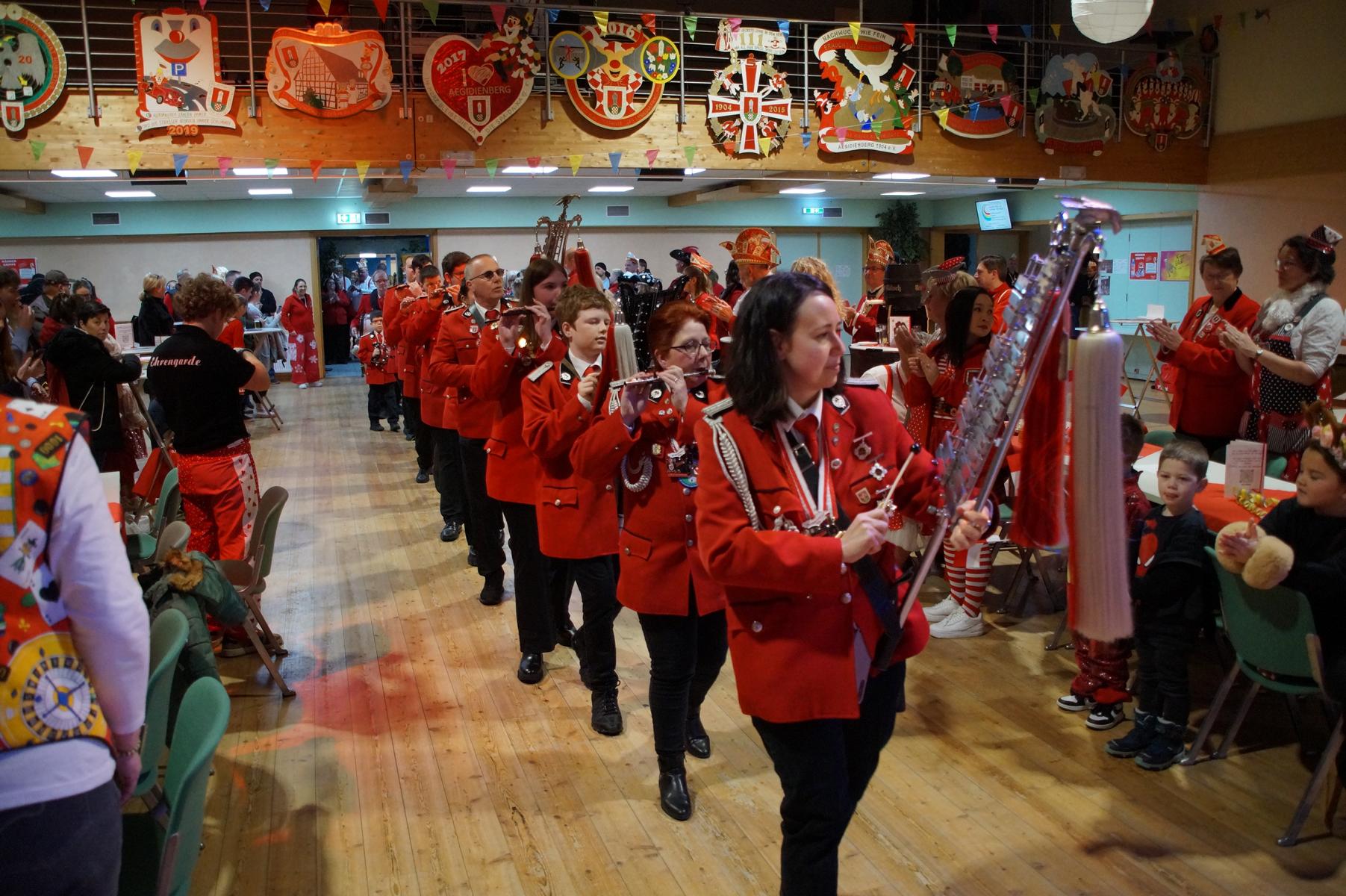 Ein weiterer Höhepunkt war der Auftritt der Prinzengarde der KG Rot-Weiß Klääv Botz, die in ihren rot-weißen Uniformen für ein eindrucksvolles Bild sorgte. Das Siebengebirgsprinzenpaar mit der Stücher KG aus Thomasberg, begleitet vom Spielmannszug der TV Eiche Bad Honnef, brachte das Bürgerhaus mit seinen Klängen noch einmal richtig in Bewegung.