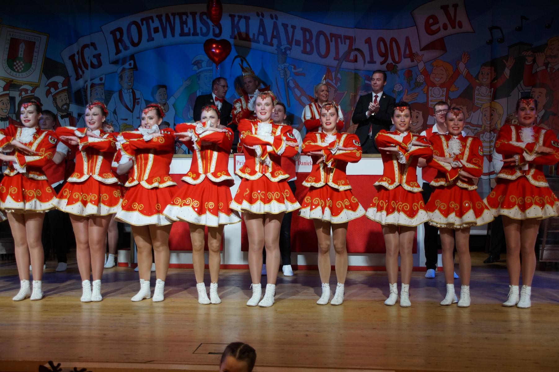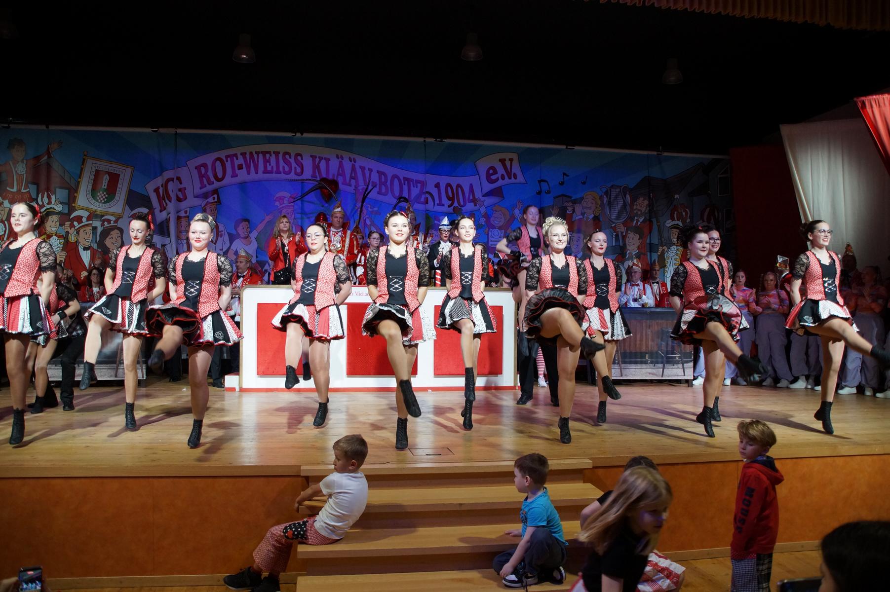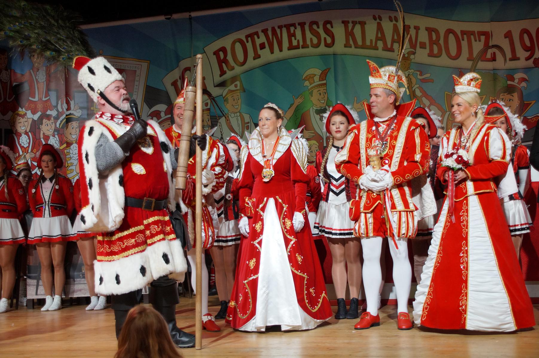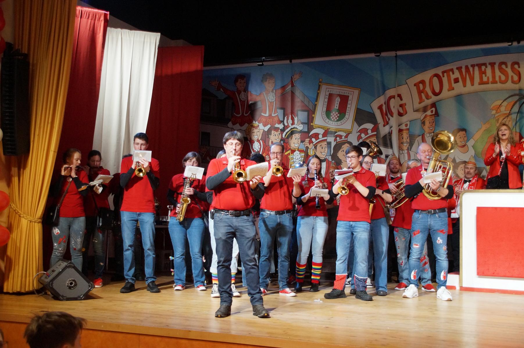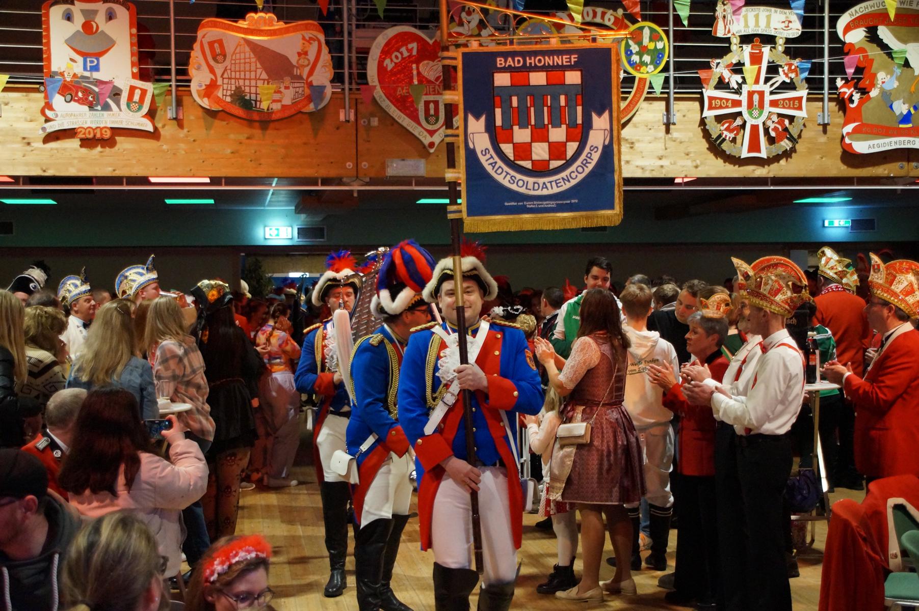 Ein weiterer Höhepunkt war der Auftritt der Prinzengarde der KG Rot-Weiß Klääv Botz, die in ihren rot-weißen Uniformen für ein eindrucksvolles Bild sorgte. Das Siebengebirgsprinzenpaar mit der Stücher KG aus Thomasberg, begleitet vom Spielmannszug der TV Eiche Bad Honnef, brachte das Bürgerhaus mit seinen Klängen noch einmal richtig in Bewegung.