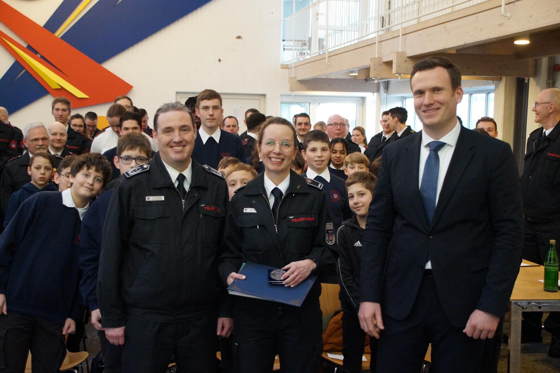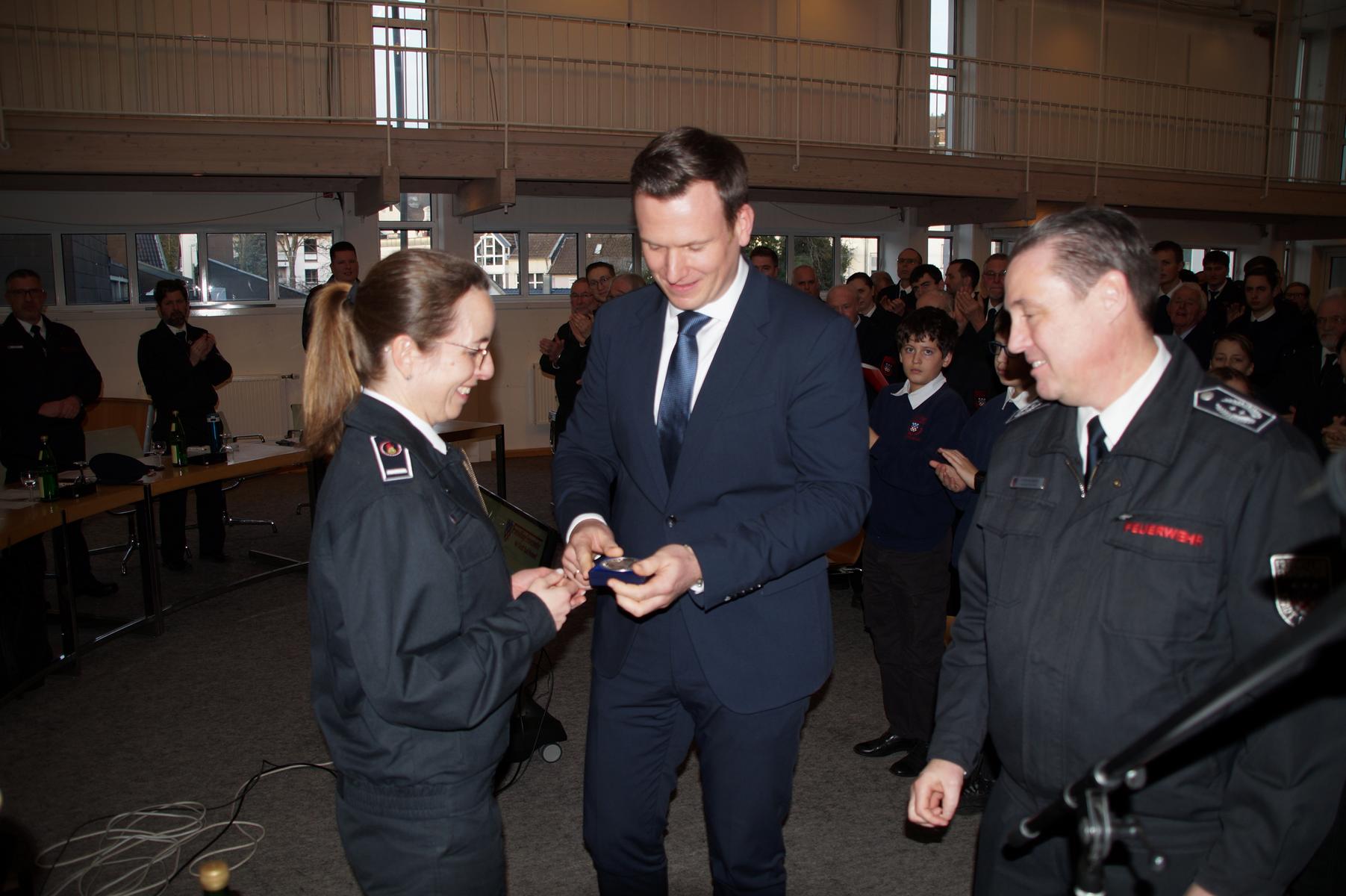Eine besondere Würdigung erhielt Patrizia Wiesel (Brandinspektorin — Stadtjugendfeuerwehrwartin) , die für ihre außergewöhnlichen Arrangements mit der Dankmedaille der Stadt Bad Honnef ausgezeichnet wurde. Bürgermeister Philipp Herzog überreichte ihr die Ehrung persönlich und betonte, wie sehr Wiesel ihr Leben der Feuerwehr widmet – insbesondere der Kinder- und Jugendfeuerwehr. Wiesel nahm die Auszeichnung sichtlich gerührt entgegen.