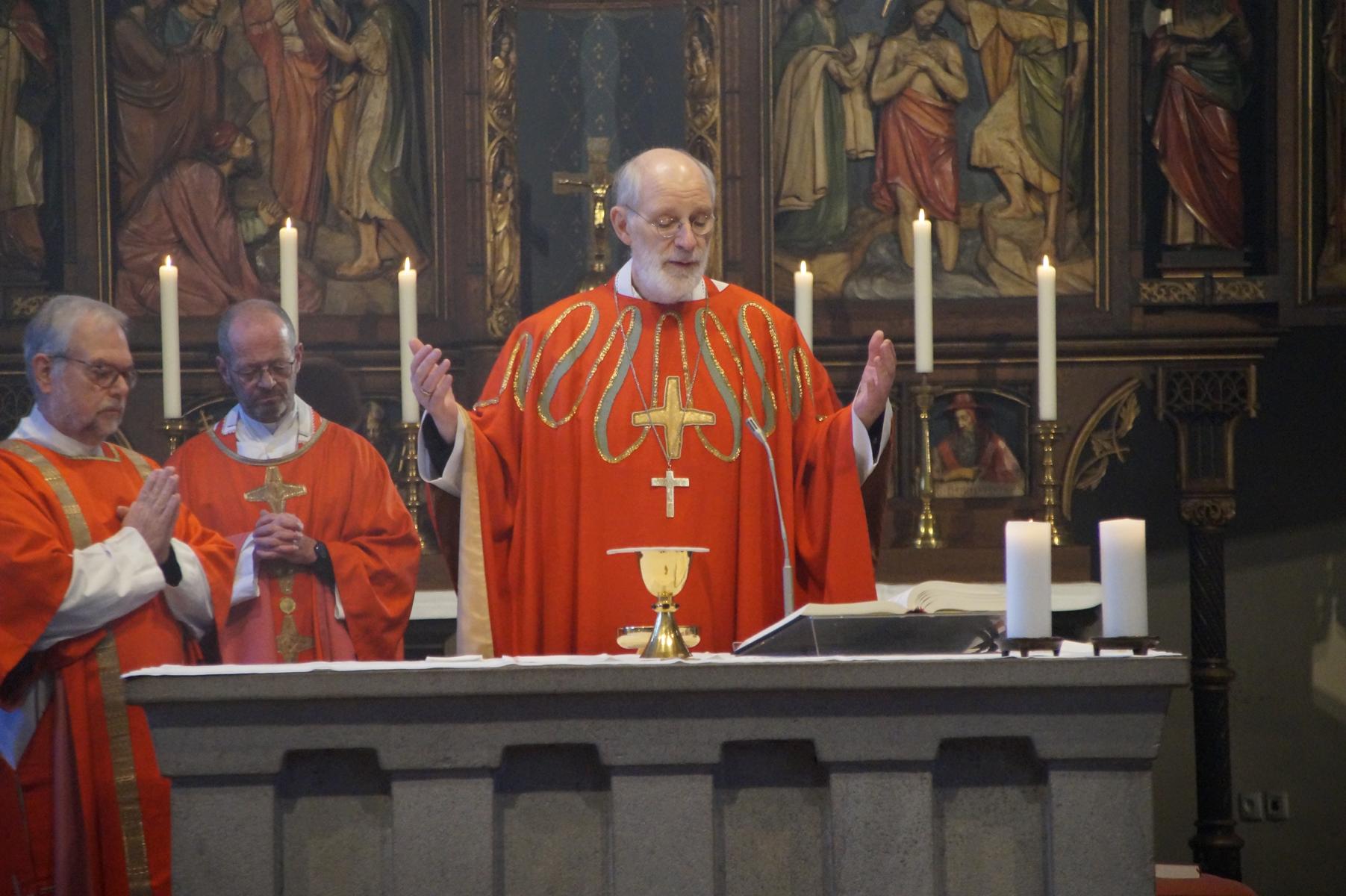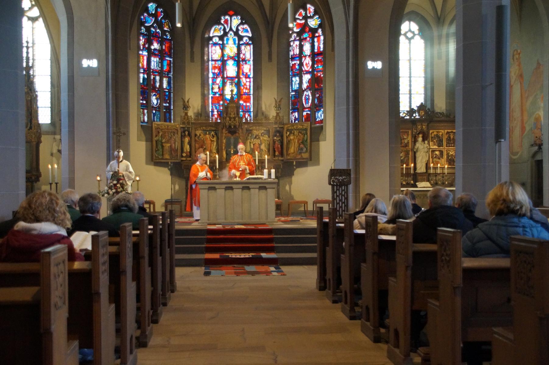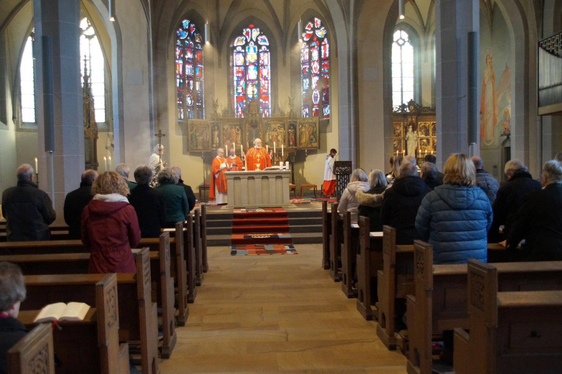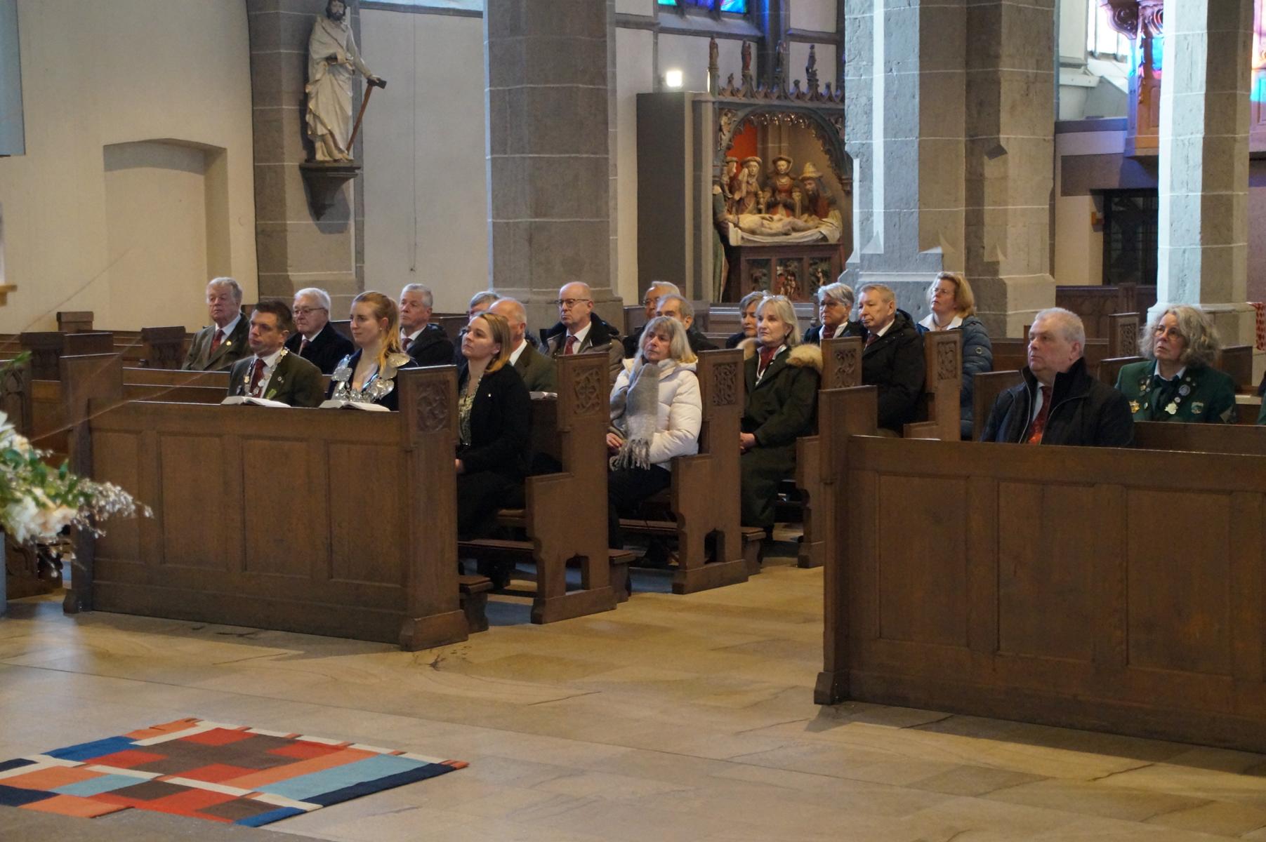Bezirkspräses Markus Hoitz, in diesem Jahr begleitet von Weihbischof Ansgar Puff aus Köln, und Diakon Franz Gunkel, zelebrierte eine besondere Messe die auch einen Rückblick des 700 jährigen Bestehens der Schützenbruderschaft in 2025 fand.
