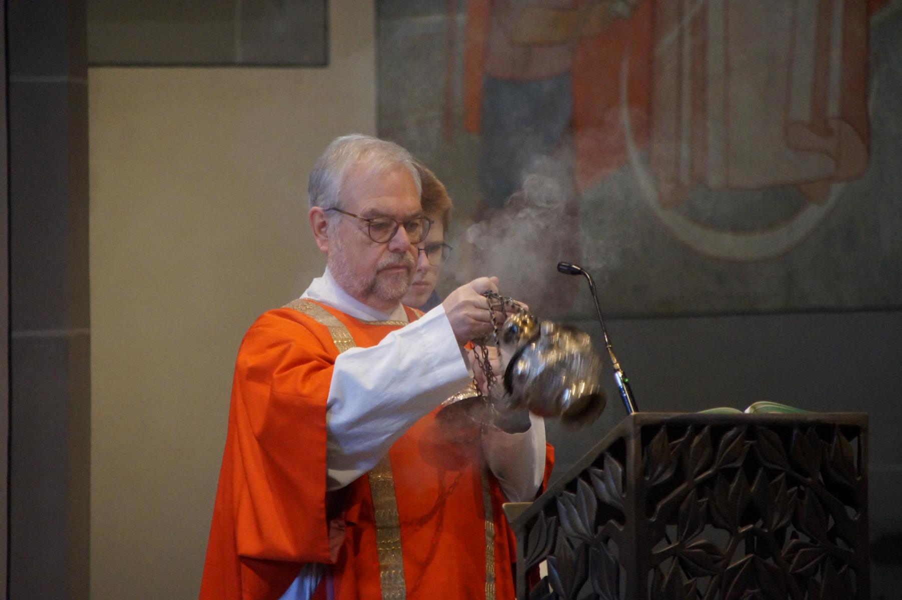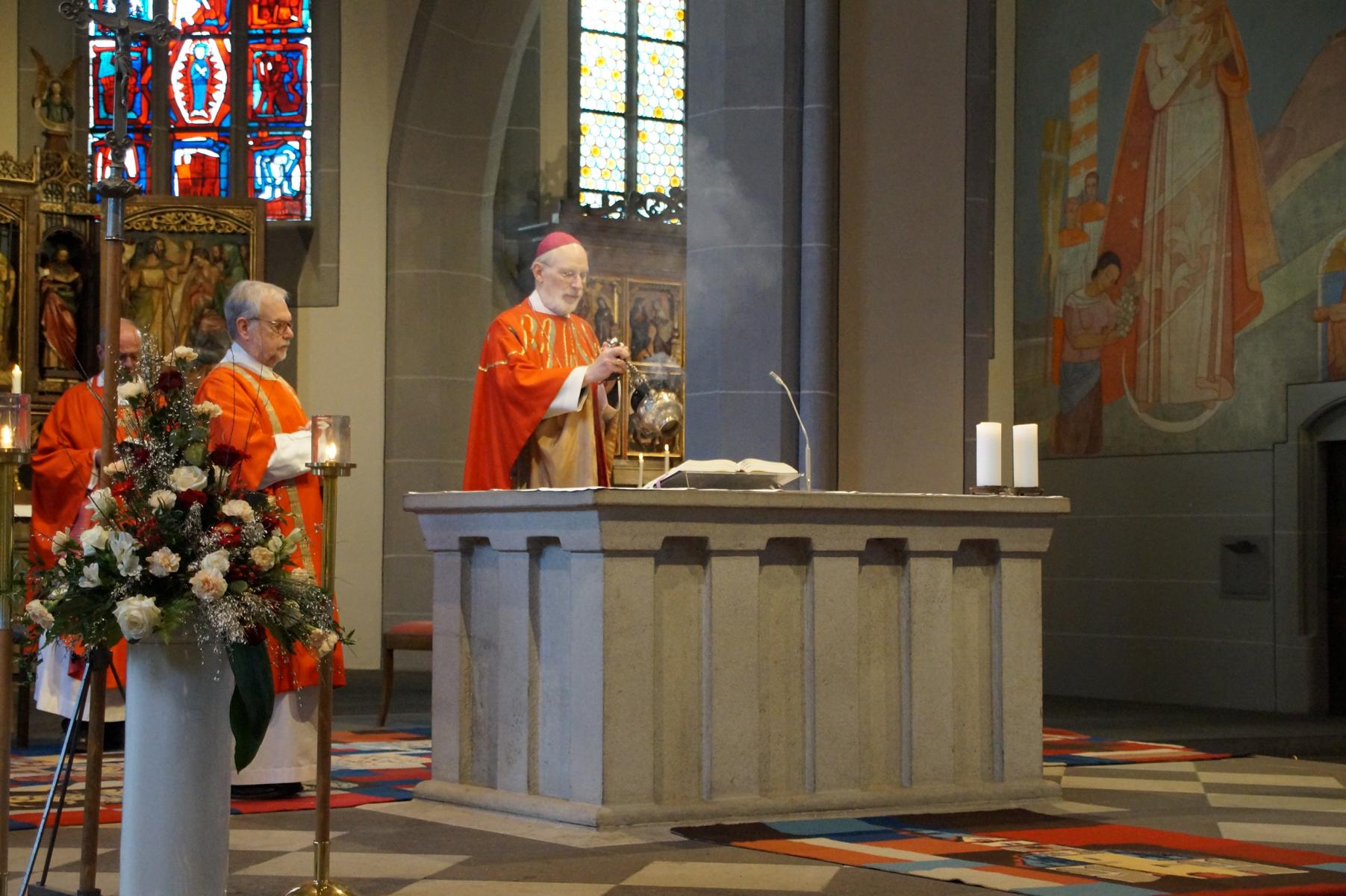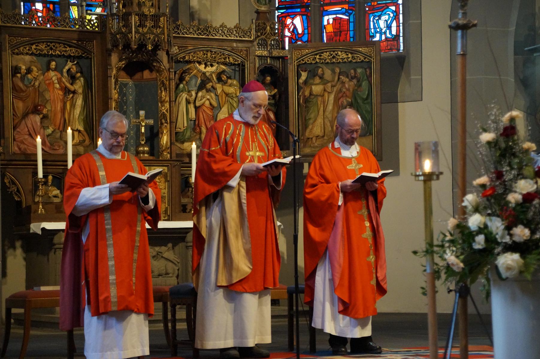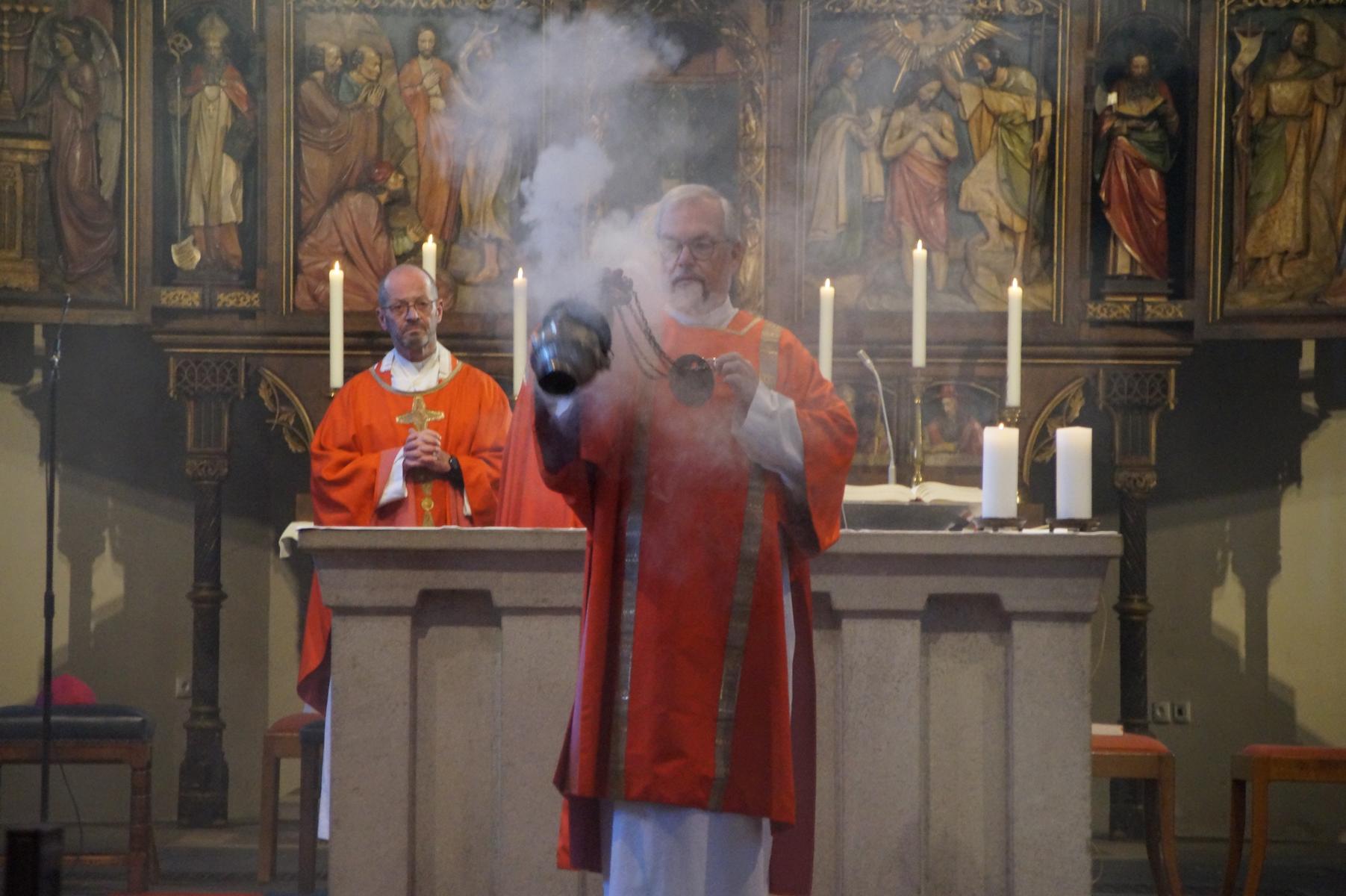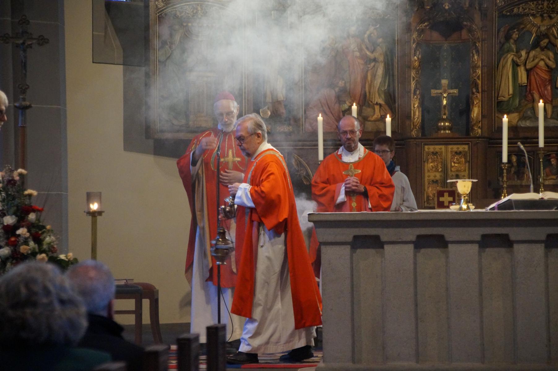 Bezirkspräses Markus Hoitz, in diesem Jahr begleitet von Weihbischof Ansgar Puff aus Köln, und Diakon Franz Gunkel, zelebrierte eine besondere Messe die auch einen Rückblick des 700 jährigen Bestehens der Schützenbruderschaft in 2025 fand.