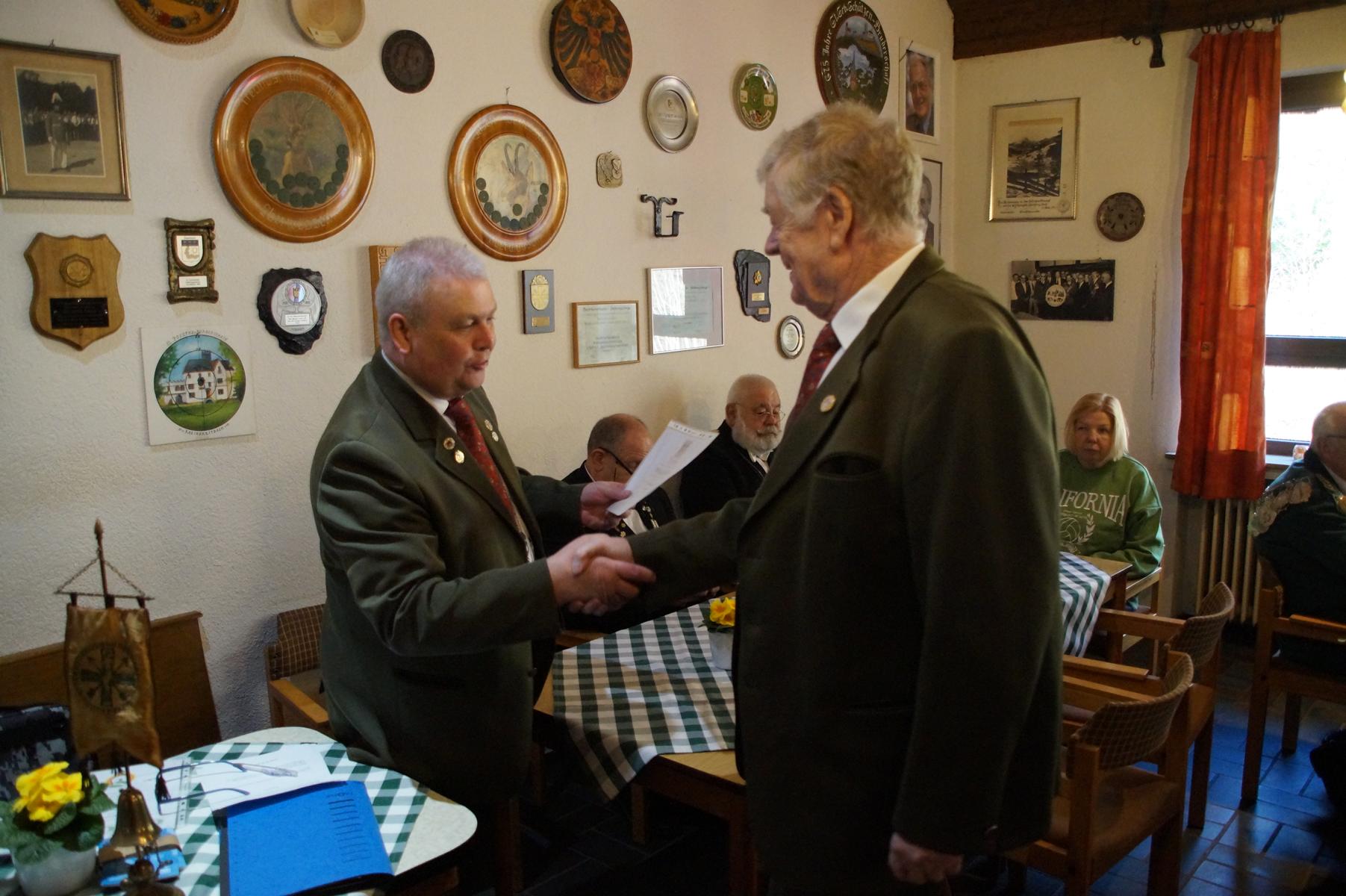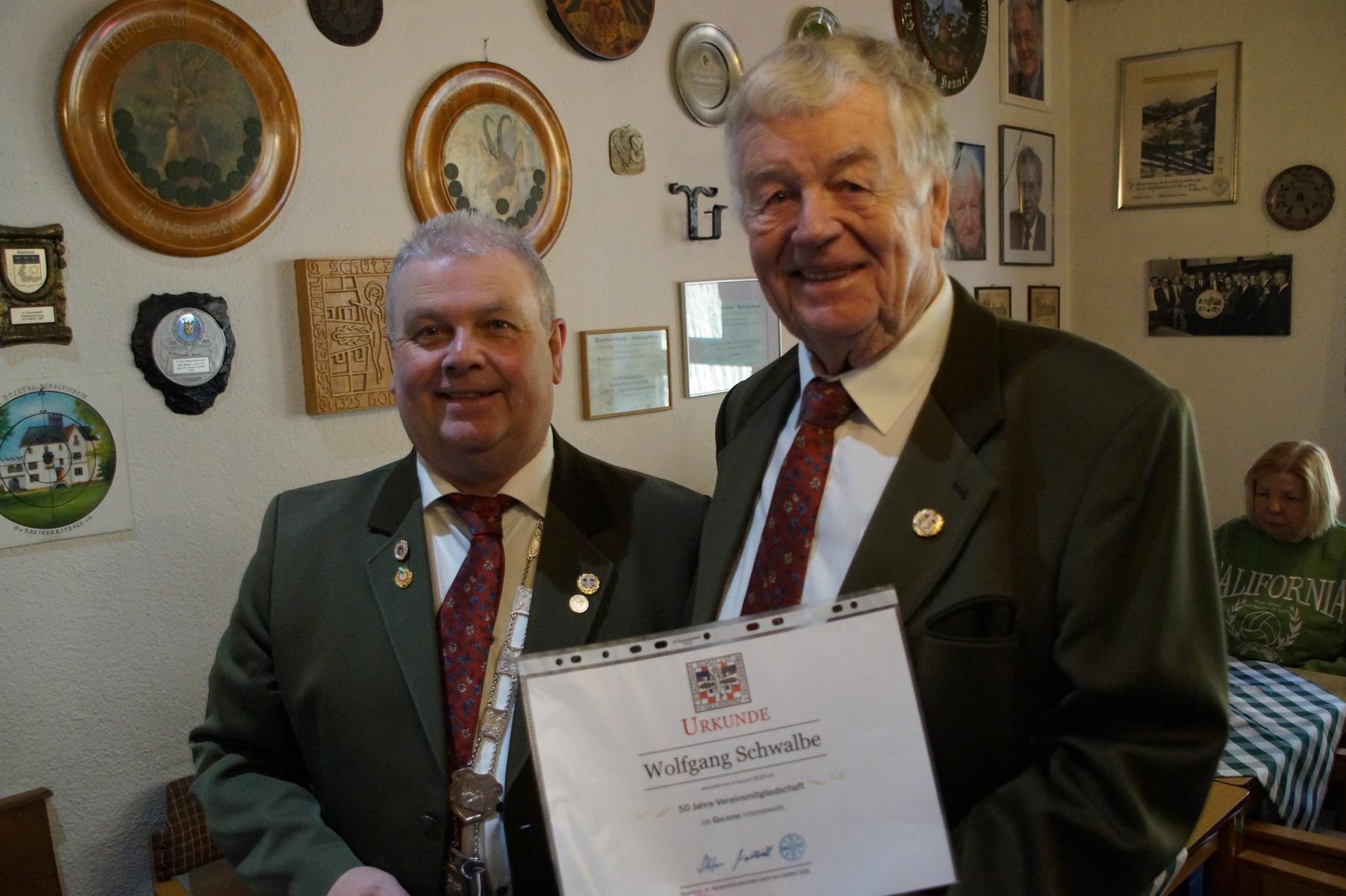 Im Anschluß gab es noch einen Höhepunkt. Wolfgang Schwalbe wurde für 50 Jahre Mitgliedchaft mit einer Ehrenurkunde und einer besonderen Vereinsnadel geehrt.