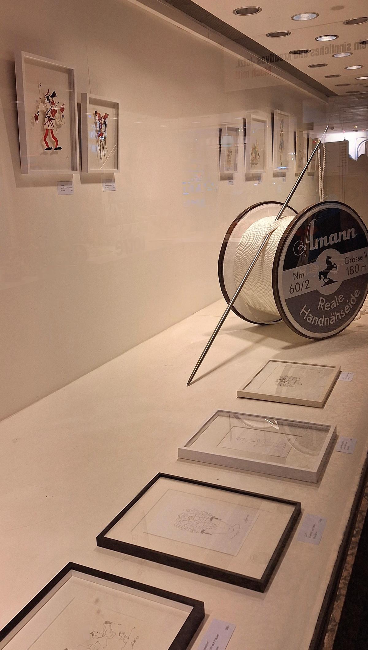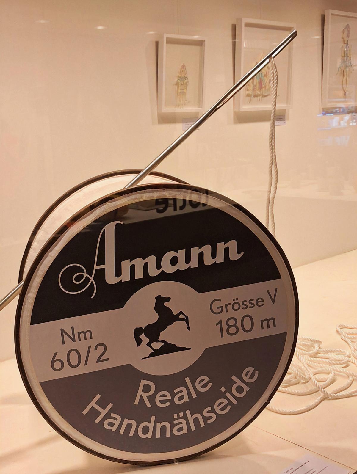 Eine Kabeltrommel als Garnrolle, 71 cm hoch, 48 cm breit, ein 200 Meter langes Tauwerkseil als Nähgarn, eine zwei Meter lange, von einem Handwerker aus Bad Honnef gefertigte „Nadel“ aus Edelstahl, dazu ein vergrößertes Original-Firmenlogo des traditionsreichen Nähgarnproduzenten Amann: das alles sind „Zutaten“, aus denen die Künstlerin ihr Kunstobjekt mit pädagogischem Hintergrund und kommunikativer Botschaft gestaltet hat.