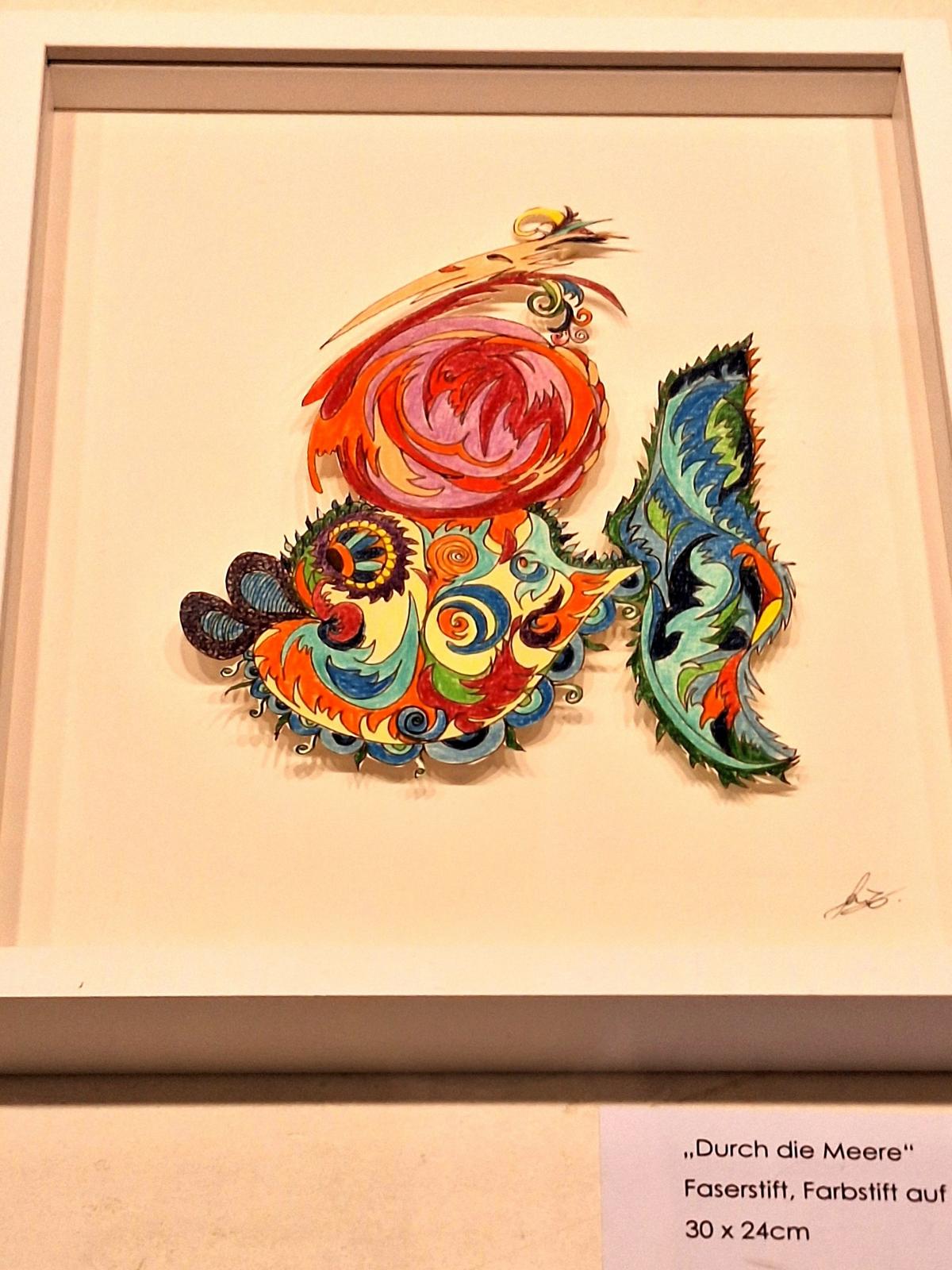 Ausgestellt sind noch bis zum 20. März 2026 sechzehn Schwarz-Weiß- und Farb-Zeichnungen, die an Scherenschnitte erinnern. Beim Betrachten lassen sie eine fantasievolle Bildwelt entstehen, die zum Entdecken und Verweilen einlädt.