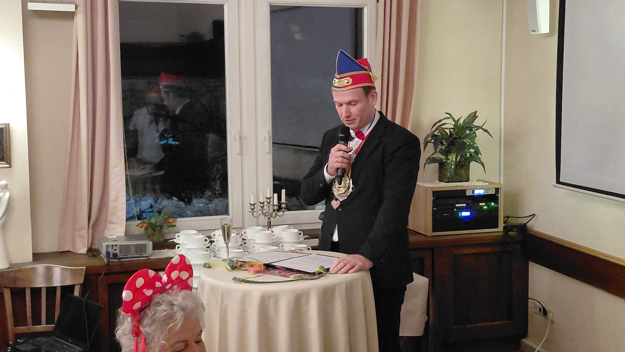 Auch der Vorsitzende des Deutschen Amateur Radio Clubs, Ortsverband Bad Honnef, Stefan Scharfenstein, lies es sich nicht nehmen, die fast 50 bunt kostümierten Gäste – u.a. auch den Vorstand der KG „Löstige Geselle , Marion Kock und Peter Monschau, zu begrüßen und darauf hinzuweisen, dass die Honnefer Funkamateure in den letzten 10 Jahren eine tragende Säule der Städtepartnerschaft – selbst in den Corona Jahren – mit ihren regelmäßigen Reisen nach Berck im Rahmen  der  Internationalen weltweiten Funkaktivitäten von Leuchttürmen aus, waren. Und da Bad Honnef vieles aber keinen Leuchtturm besitzt, kam man schon 2016 auf die Idee, die Funkverbindungen vom wunderschönen Bercker Leuchtturm durchzuführen. Übersetzt wurde sein Vortrag von Karl-Heinz Rohde, ebenfalls aus dem Vorstand der Funkamateure.