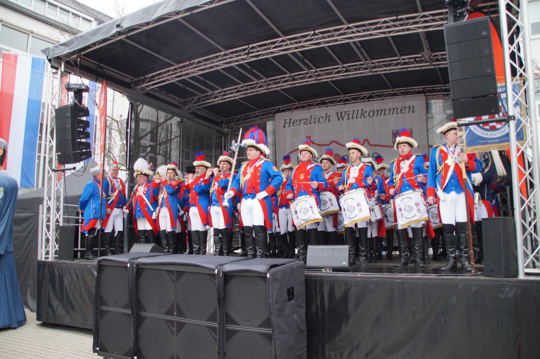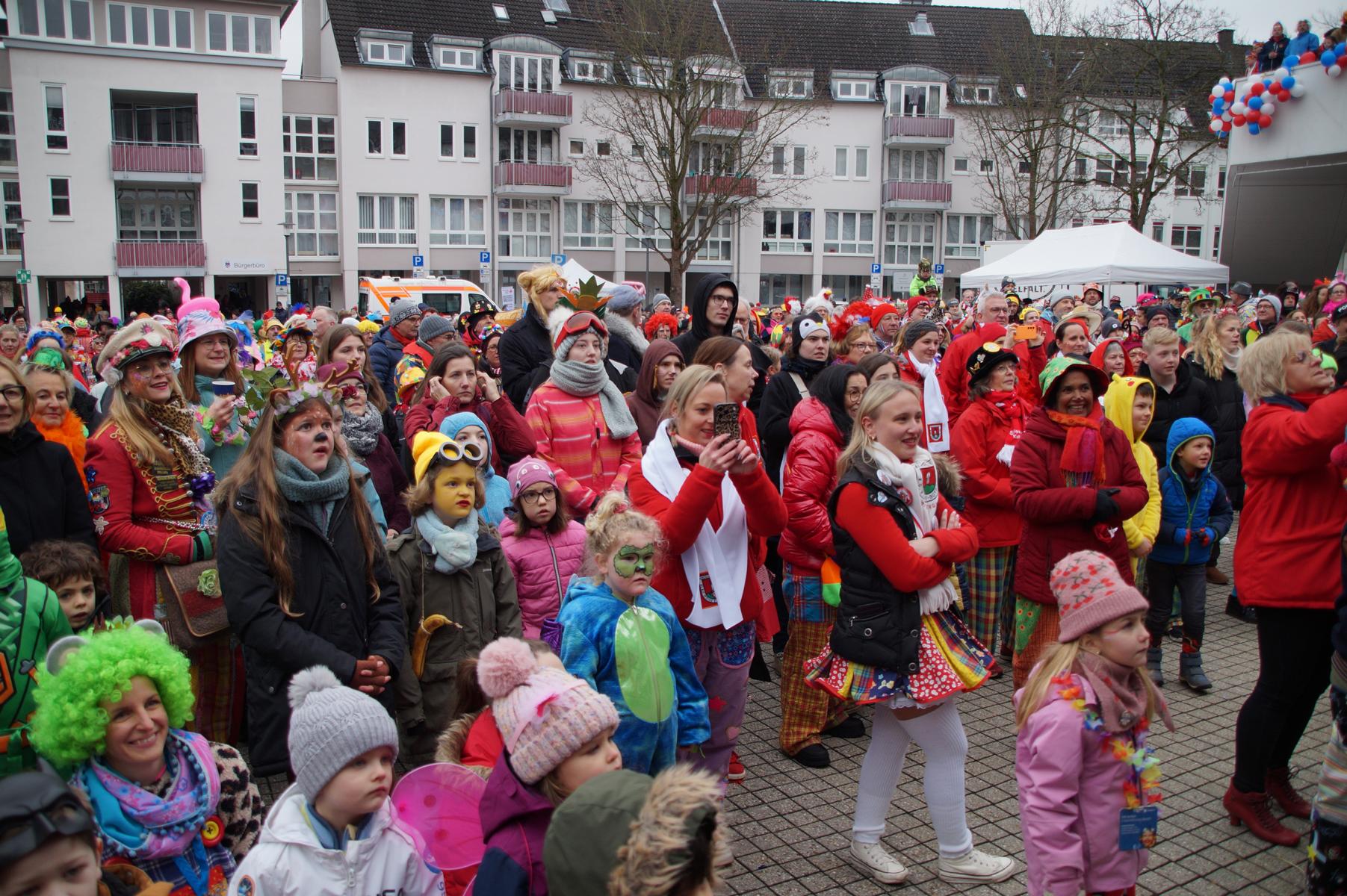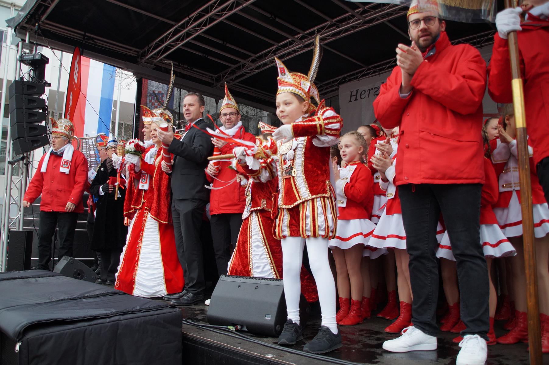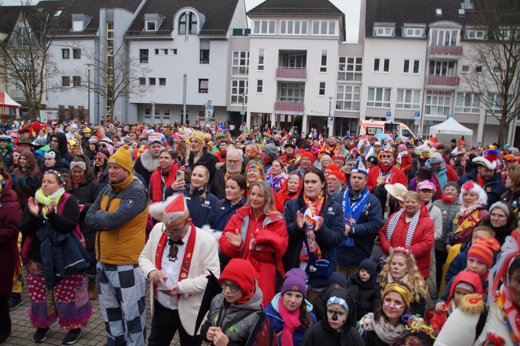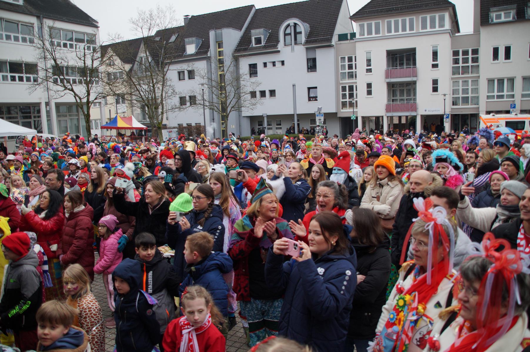 Pünktlich um 11.00 Uhr ging es auf der großen Bühne vor dem Rathaus los, vor der sich zu diesem Zeitpunkt bereits einige hundert Karnevalisten eingefunden hatten.