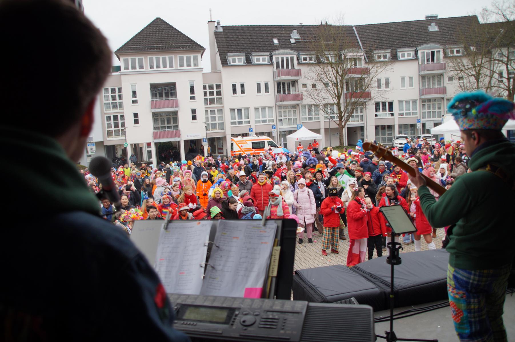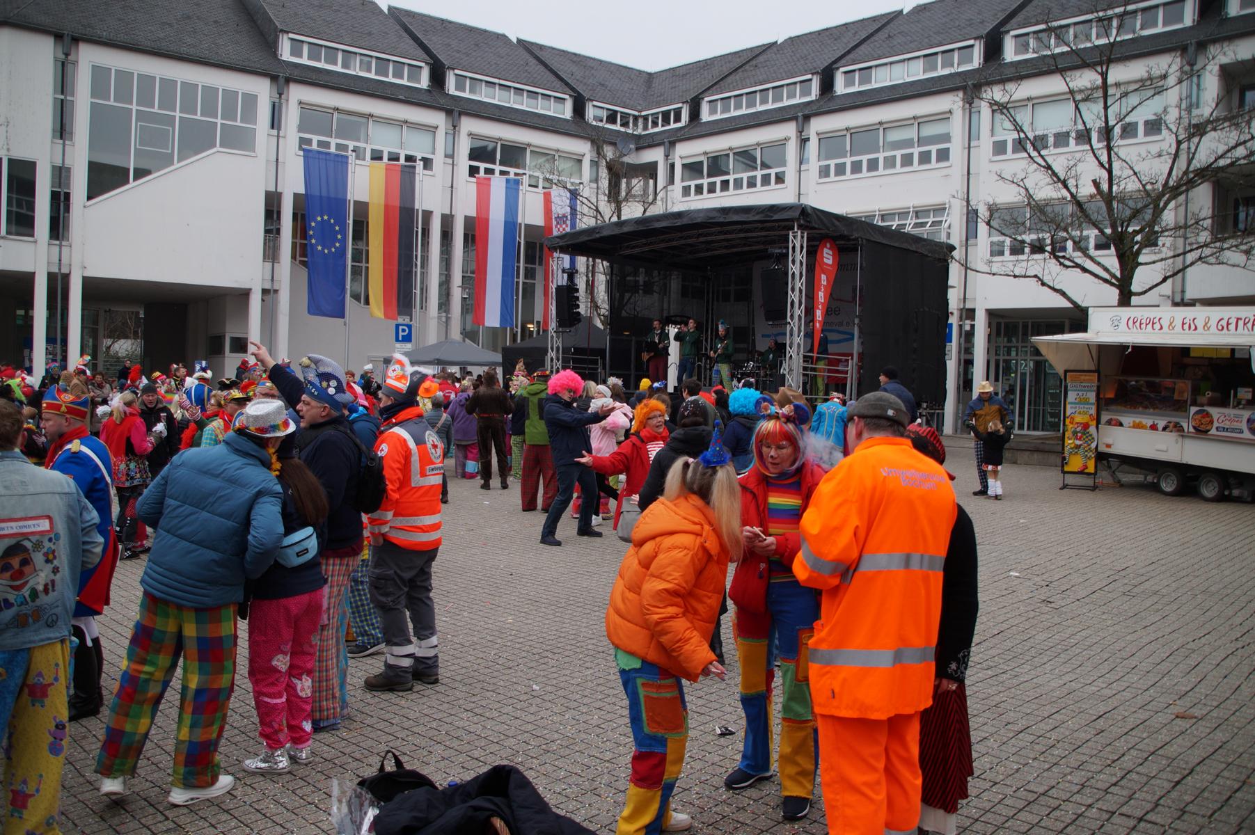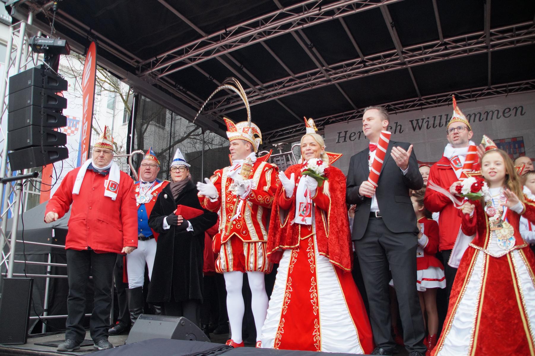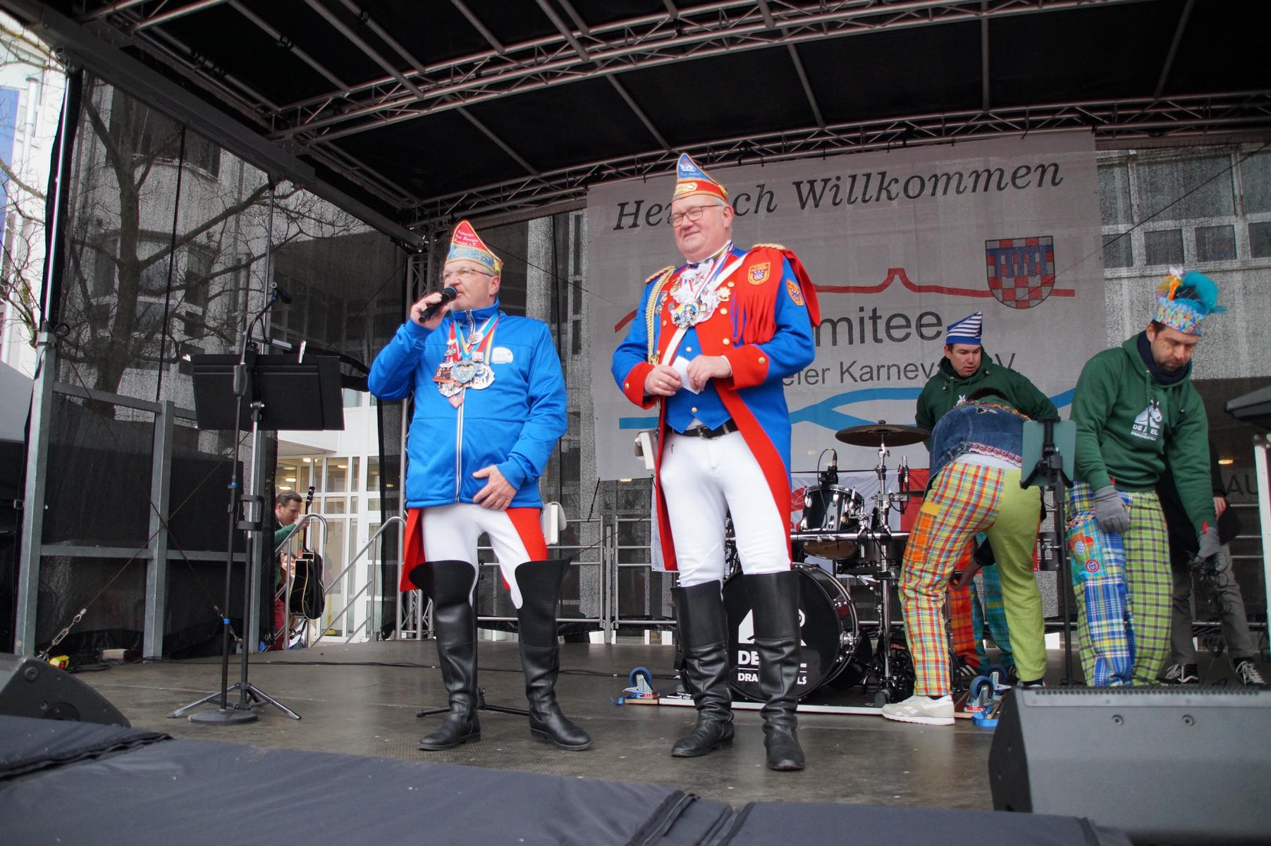 Pünktlich um 11.00 Uhr ging es auf der großen Bühne vor dem Rathaus los, vor der sich zu diesem Zeitpunkt bereits einige hundert Karnevalisten eingefunden hatten.