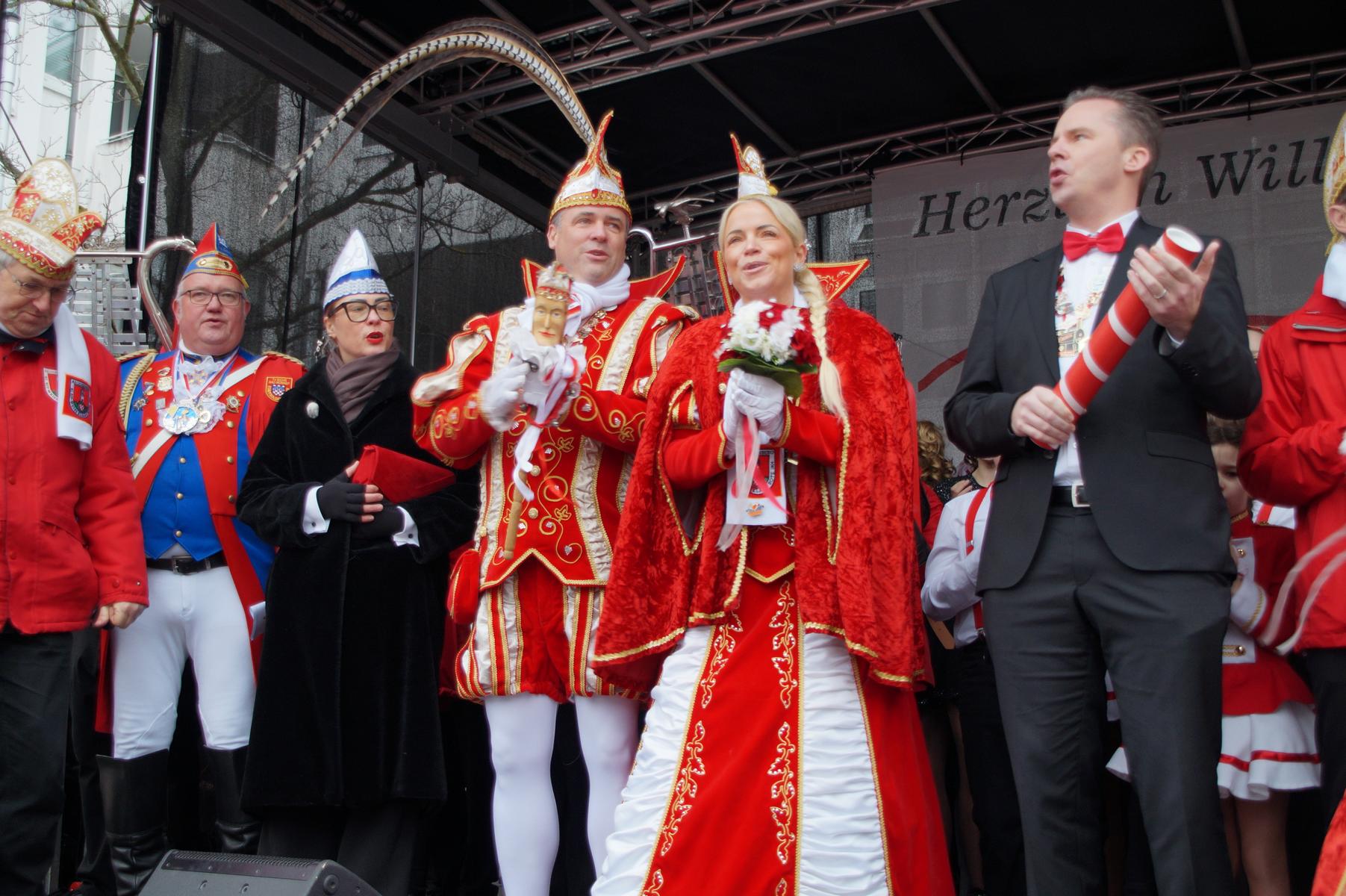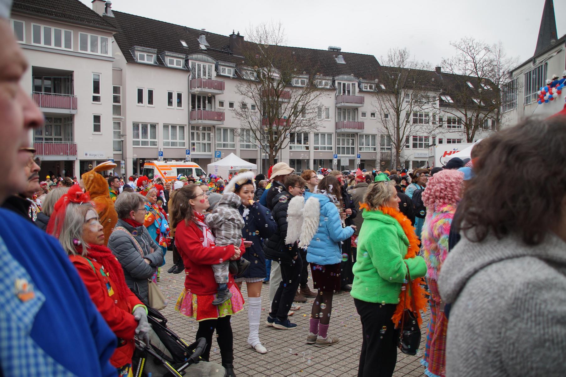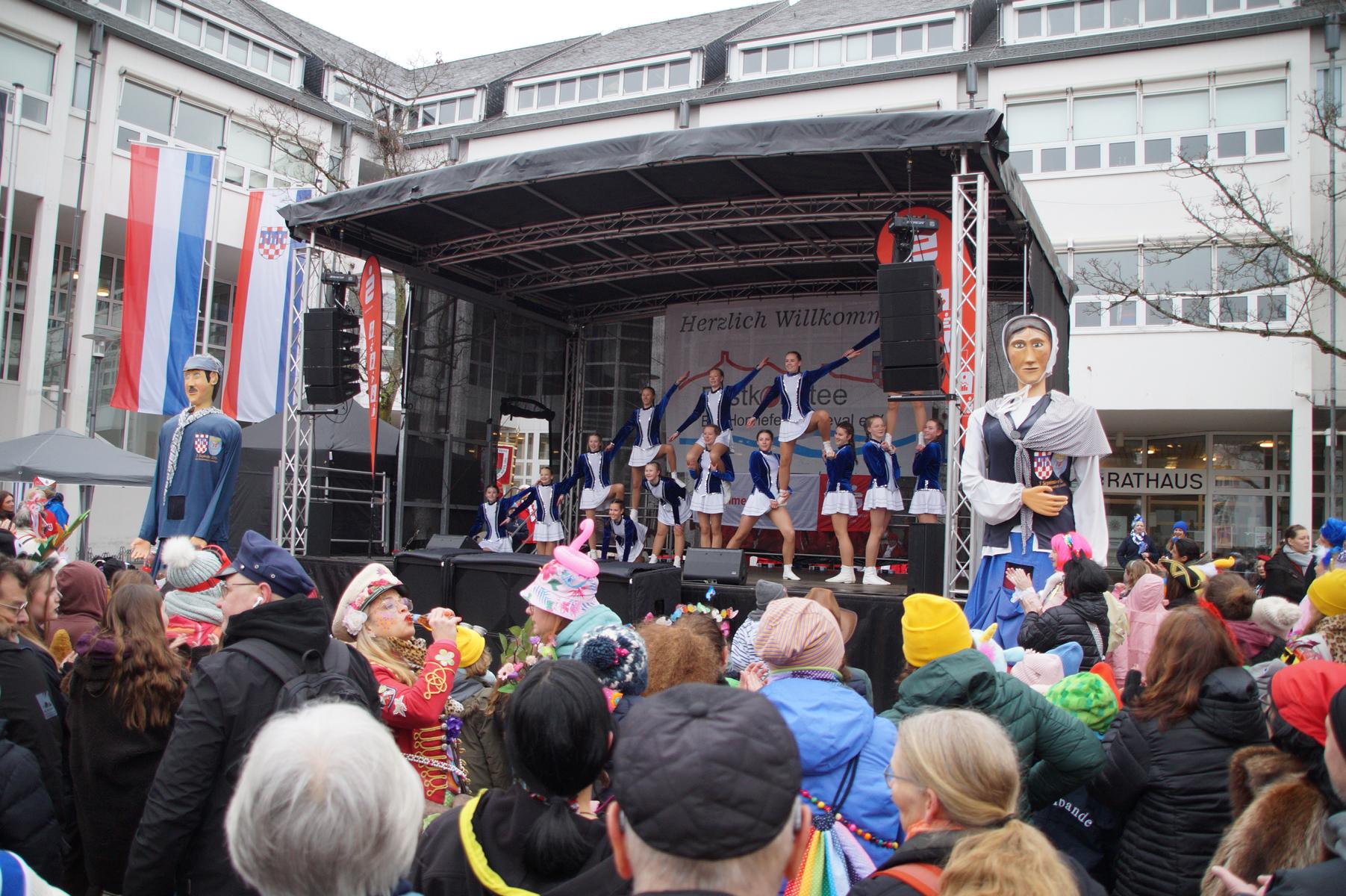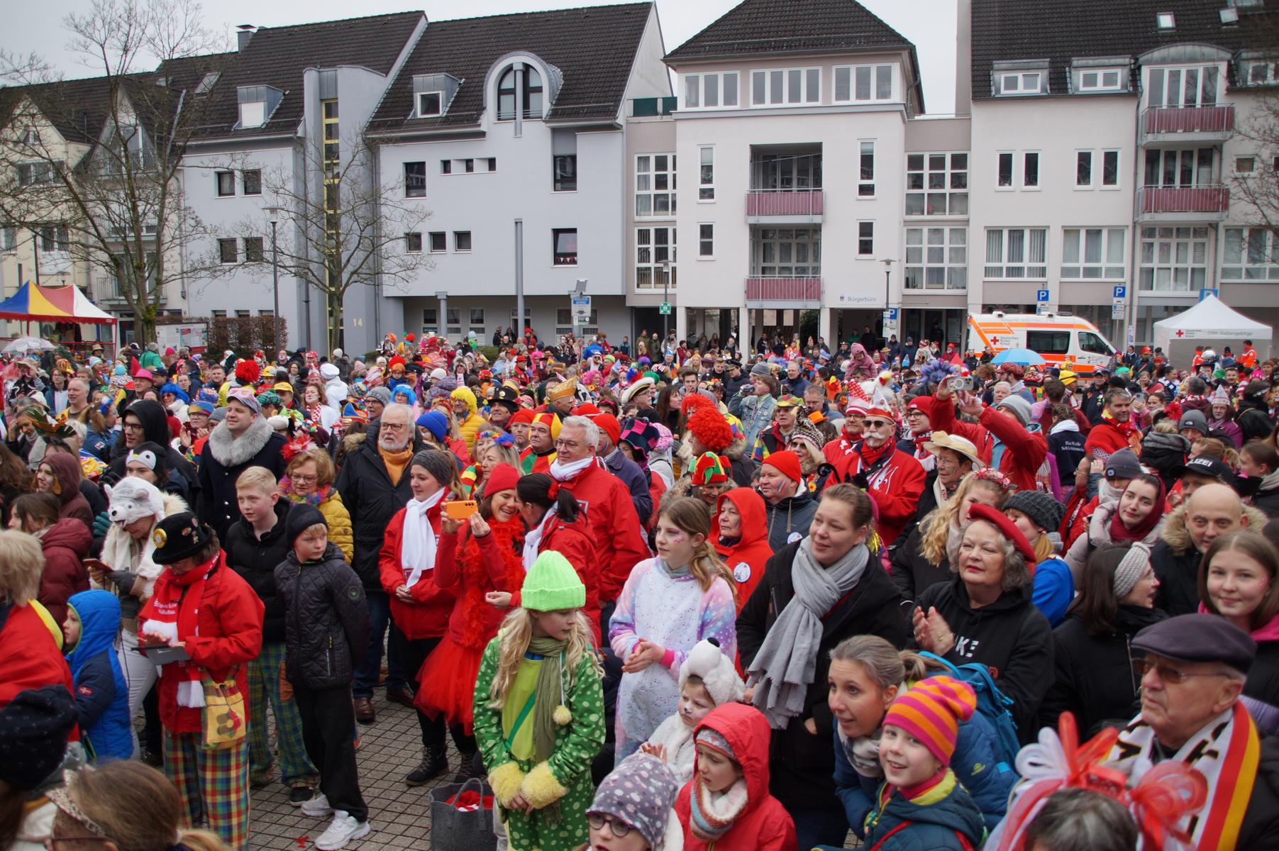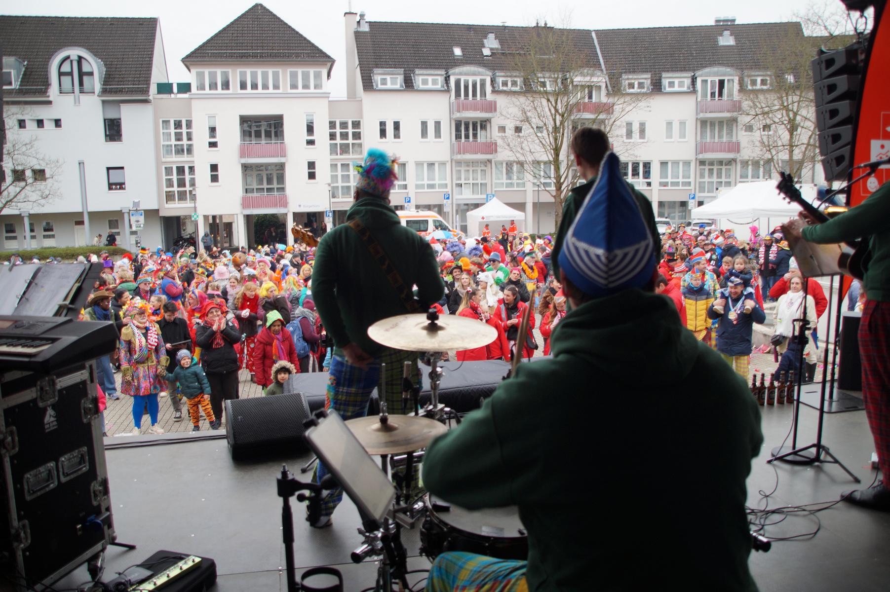Pünktlich um 11.00 Uhr ging es auf der großen Bühne vor dem Rathaus los, vor der sich zu diesem Zeitpunkt bereits einige hundert Karnevalisten eingefunden hatten.