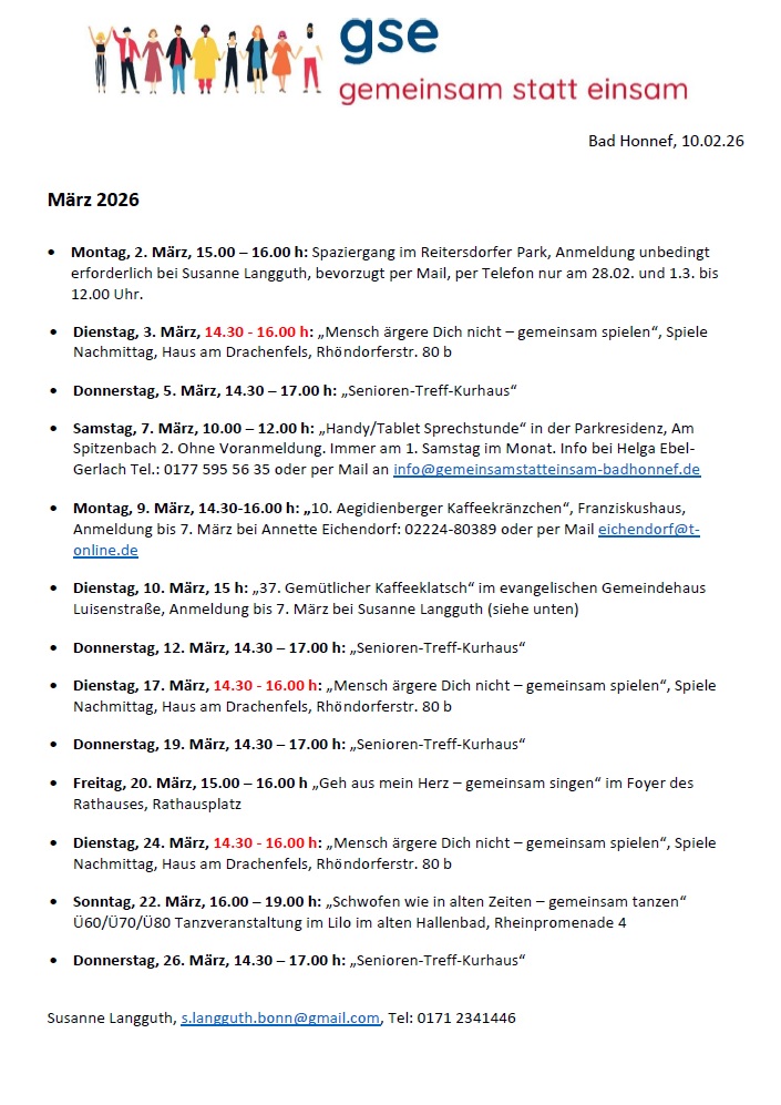 Hier die Termine GSE – Geminsam statt einsam – März 2026
