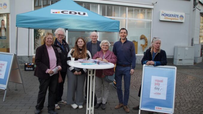 Der Stadtverband der Christlich-Demokratischen Arbeitnehmerschaft (CDA) Bad Honnef hat am 27. Februar 2026 mit einem Informationsstand in der Fußgängerzone auf den Equal Pay Day aufmerksam gemacht. Ziel der Aktion war es, die weiterhin bestehende systemisch bedingte Lohnlücke zwischen Frauen und Männern in den Fokus der Öffentlichkeit zu rücken.