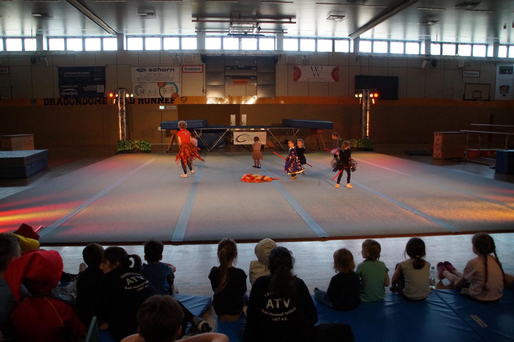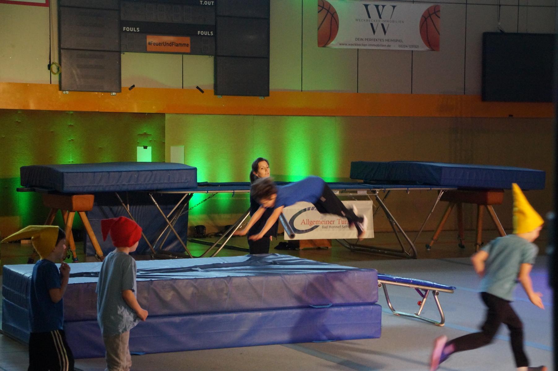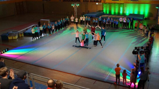 Pünktlich um 15:30 Uhr begann das Programm. Die Tribünen im Oberrang waren nahezu vollständig besetzt, als die jungen Athletinnen und Athleten die Halle betraten und ihre turnerischen Fähigkeiten präsentierten. Vom Kinderturnen über Breitensport und Gerätturnen bis hin zum Trampolinturnen zeigte der Verein die ganze Bandbreite seines sportlichen Angebots. Die liebevoll gestalteten Vorführungen, viele davon mit märchenhaften Elementen, begeisterten das Publikum und sorgten für anhaltenden Applaus.