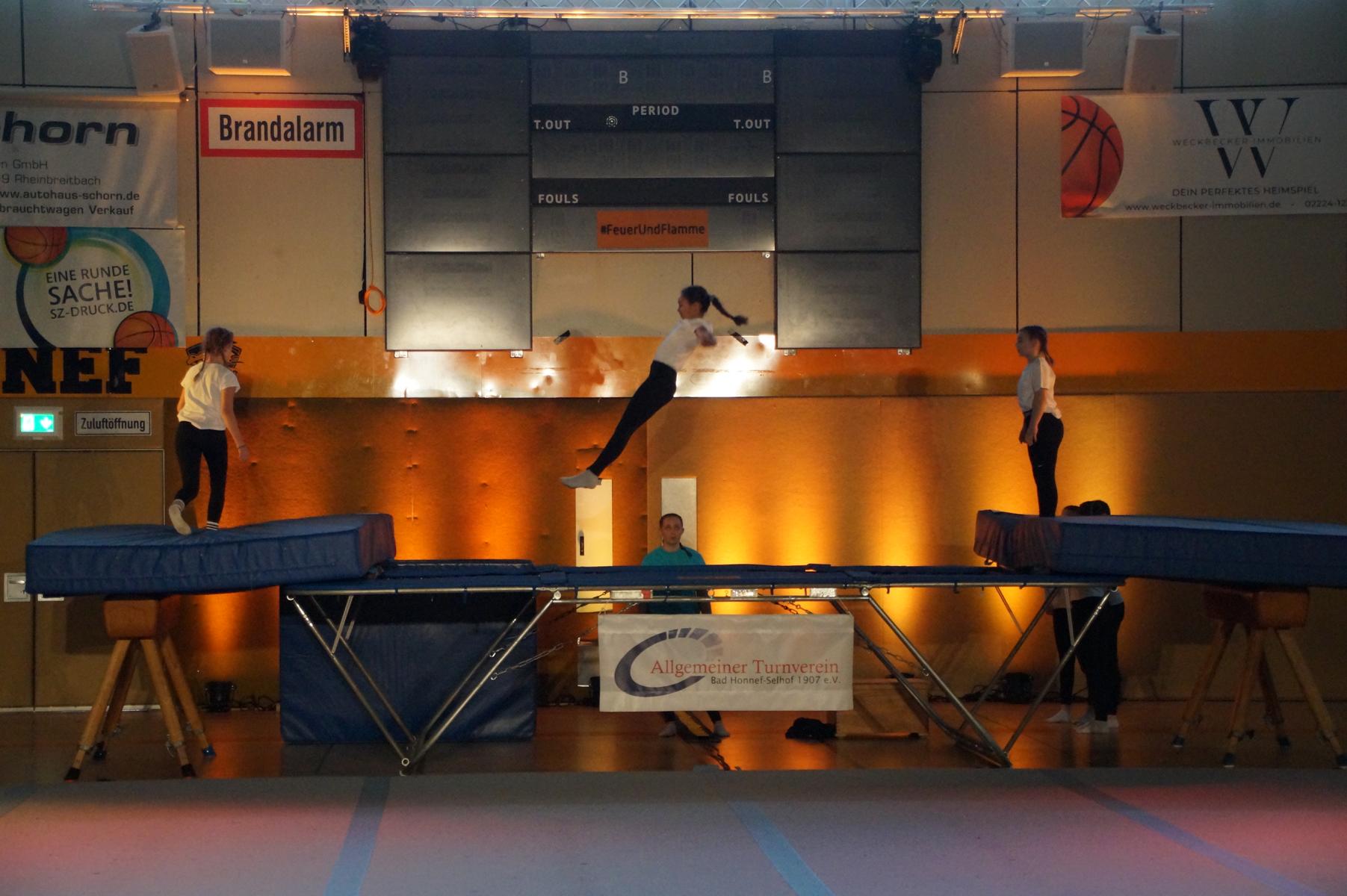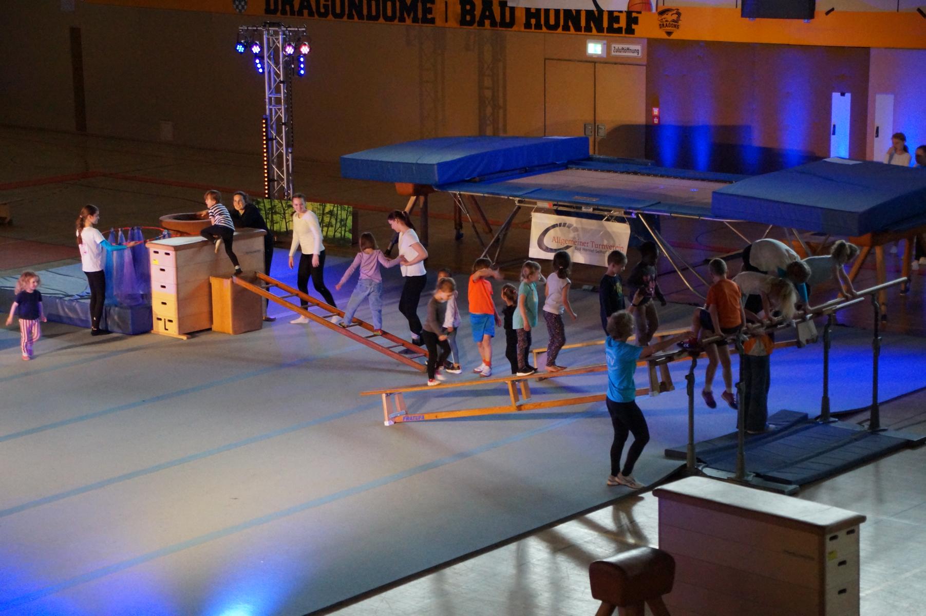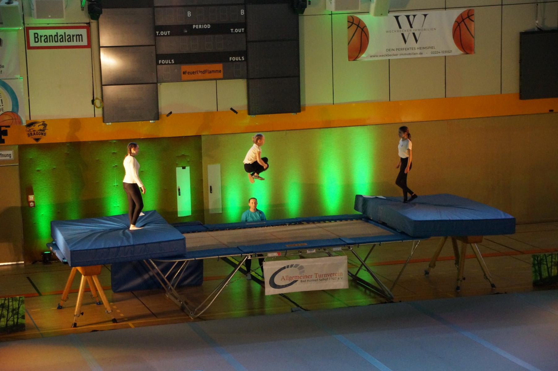 Pünktlich um 15:30 Uhr begann das Programm. Die Tribünen im Oberrang waren nahezu vollständig besetzt, als die jungen Athletinnen und Athleten die Halle betraten und ihre turnerischen Fähigkeiten präsentierten. Vom Kinderturnen über Breitensport und Gerätturnen bis hin zum Trampolinturnen zeigte der Verein die ganze Bandbreite seines sportlichen Angebots. Die liebevoll gestalteten Vorführungen, viele davon mit märchenhaften Elementen, begeisterten das Publikum und sorgten für anhaltenden Applaus.