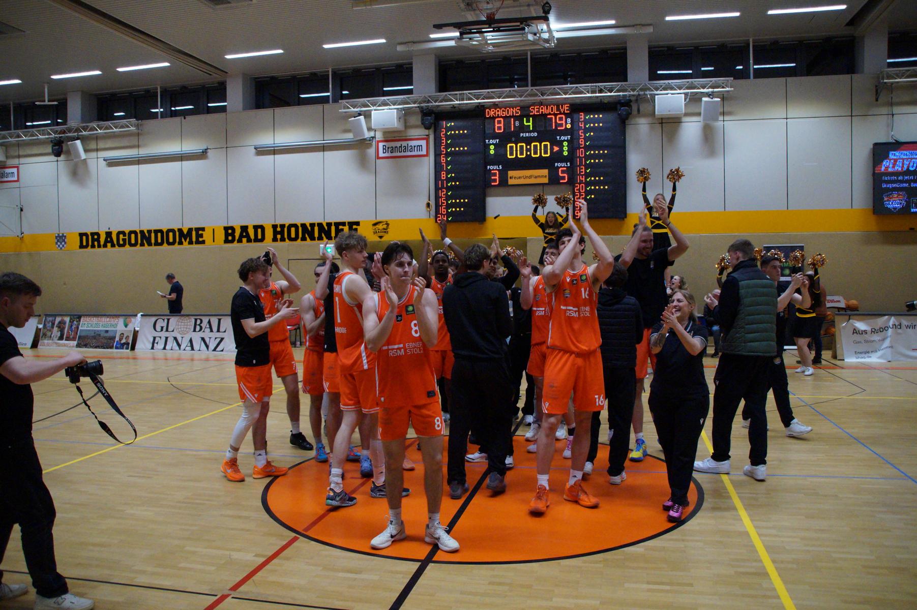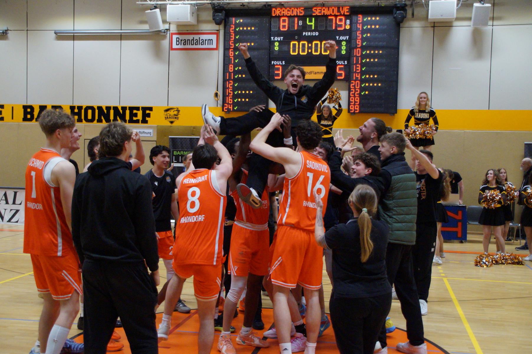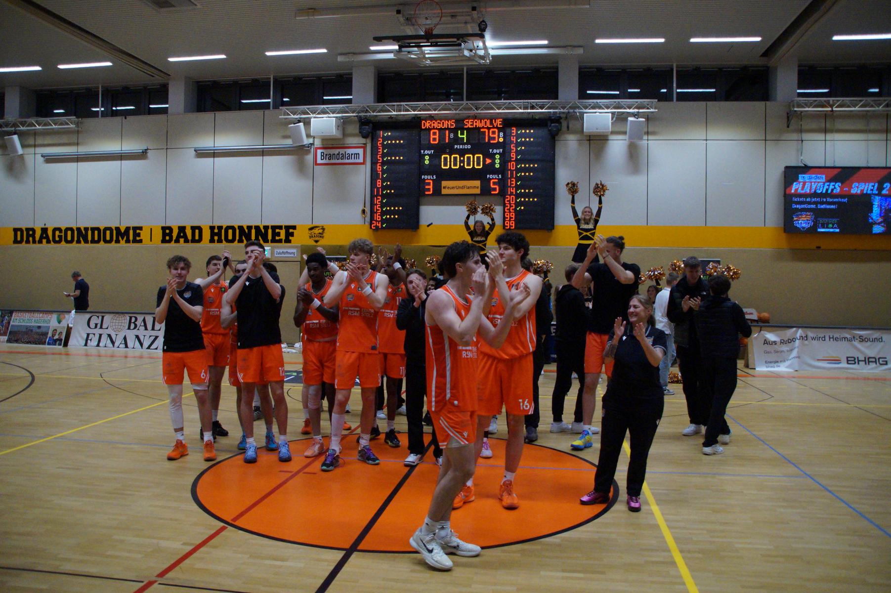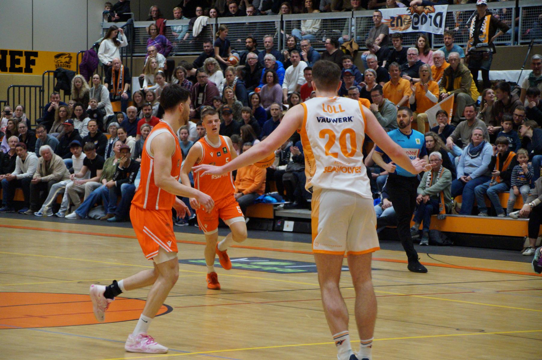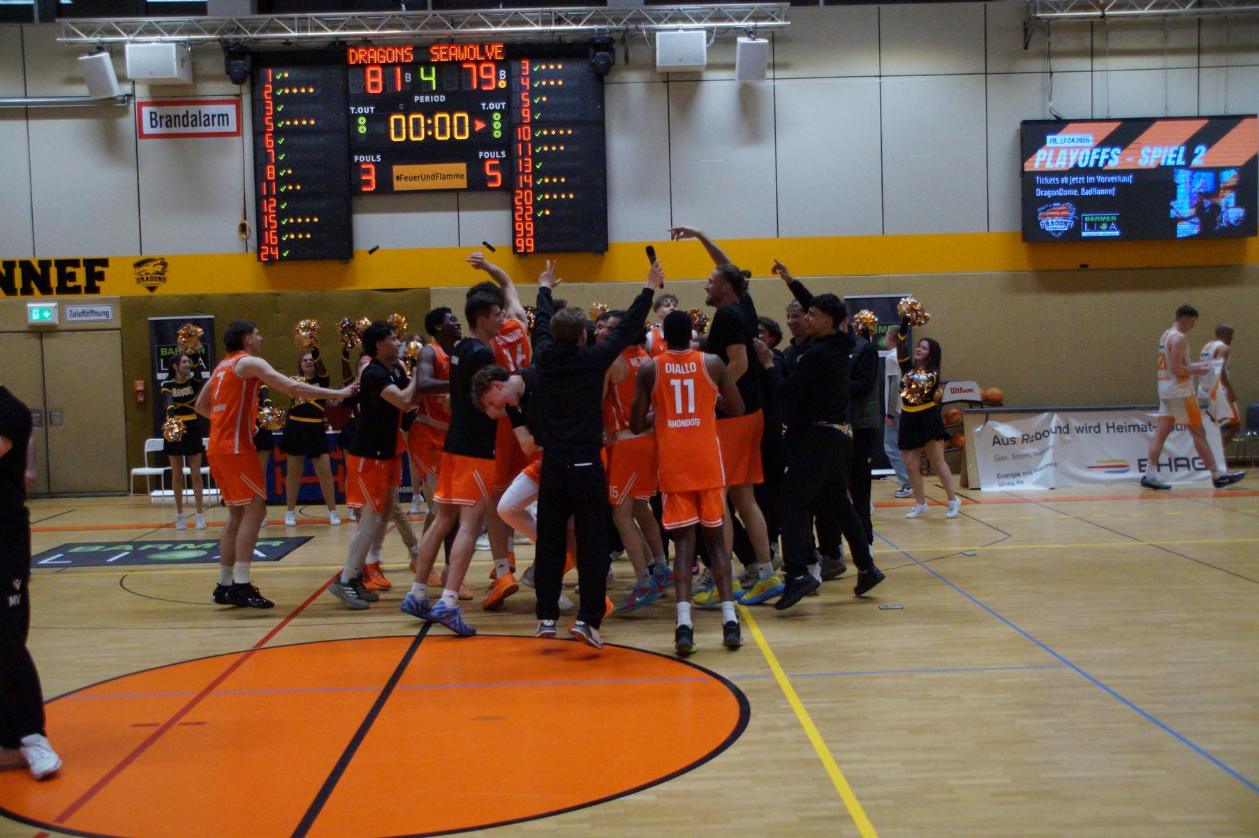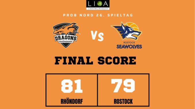 Das Finale der regulären Saison zwischen Rhöndorf und Rostock blieb nichts schuldig. Erst mit dem letzten Wurfversuch fiel die Entscheidung. Rund 915 Fans im DragonDome hielten den Atem an, aber der Wurf der Seawolfes landete den Bruchteil einer Sekunde zu spät im Korb der Hausherren. Damit war der denkbar knappe 81:79-Sieg (48:39) und die Playoff-Qualifikation der Rheinländer perfekt.