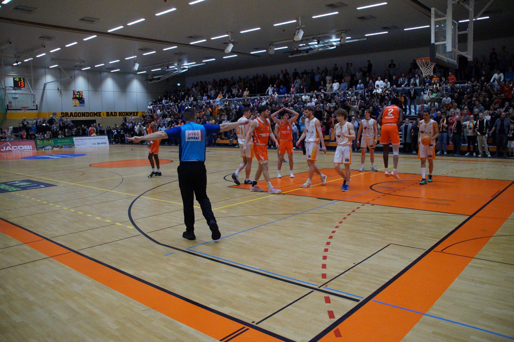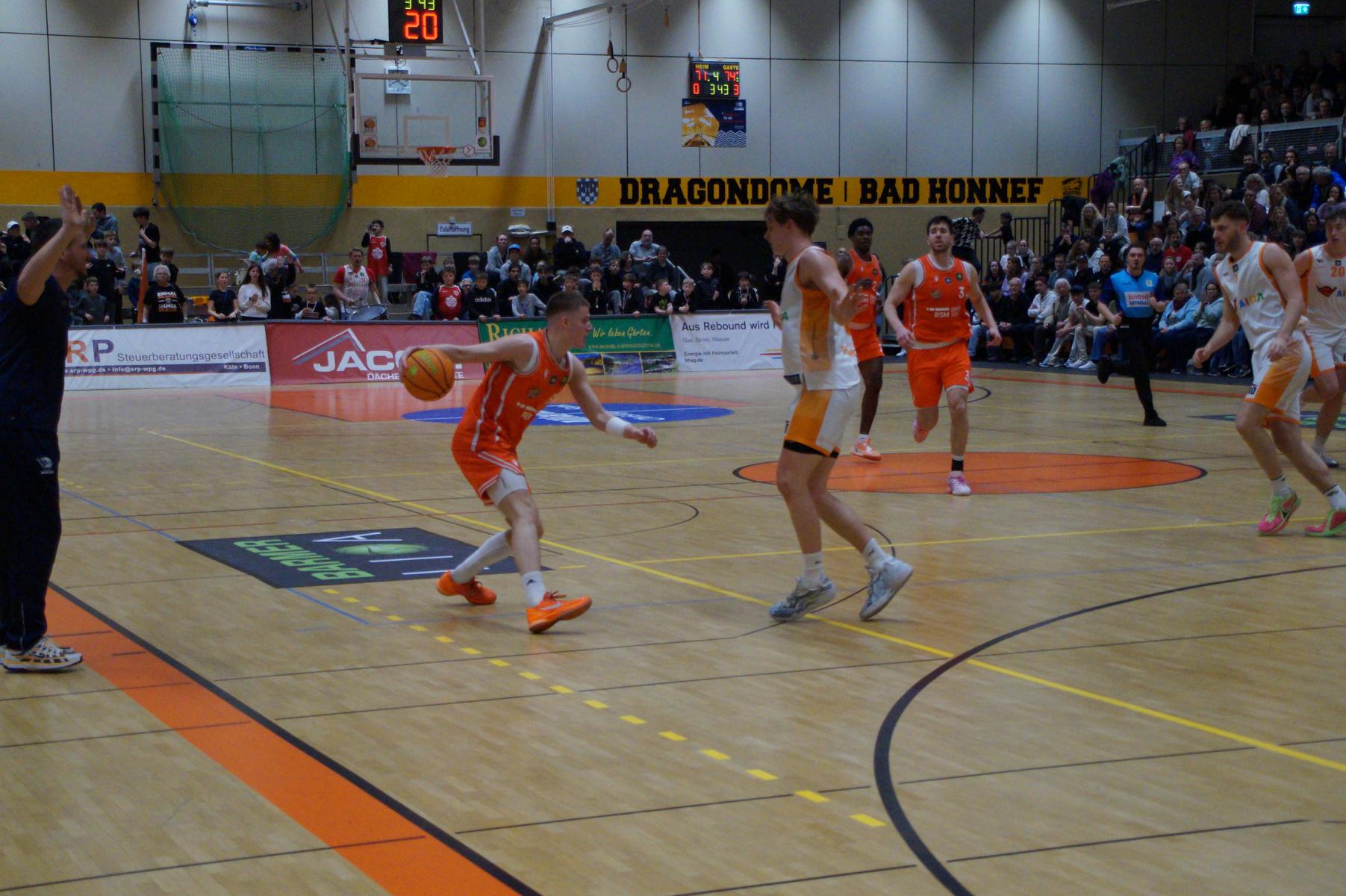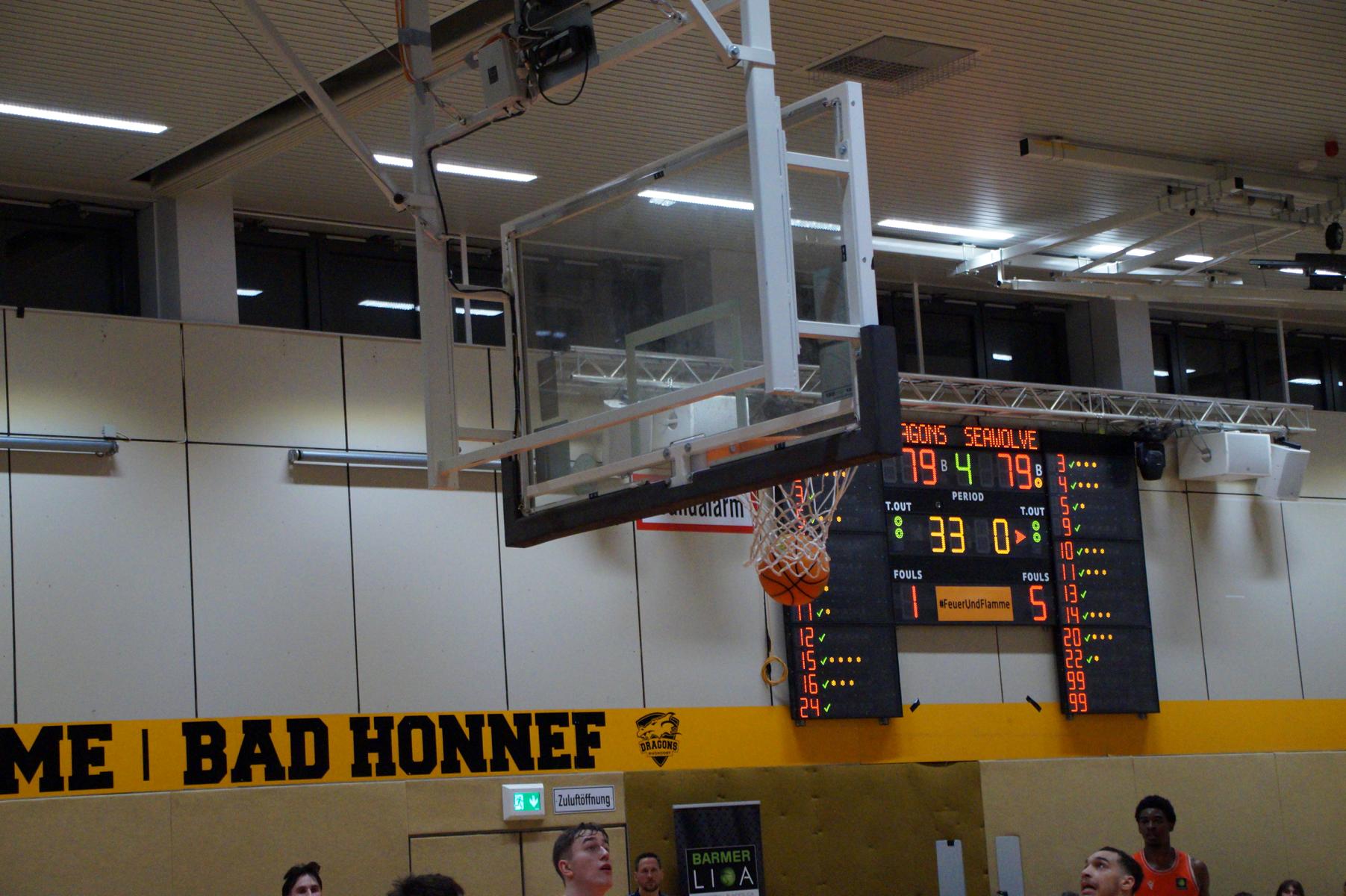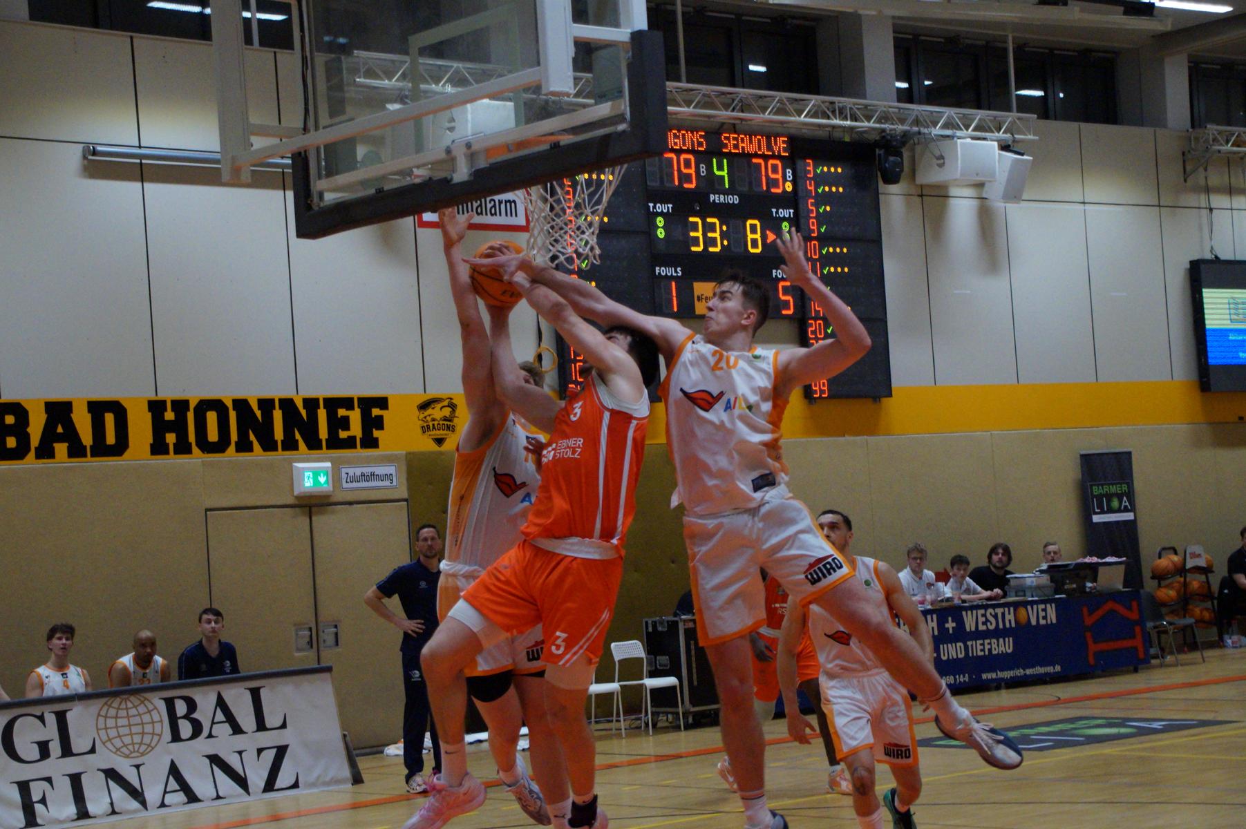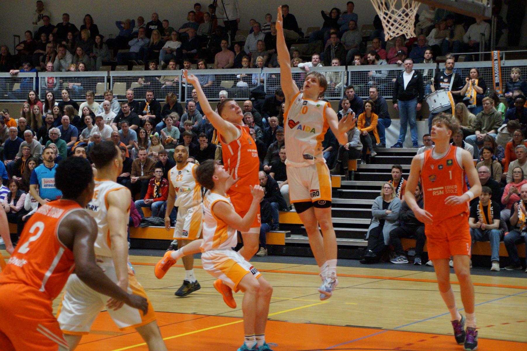 Das Finale der regulären Saison zwischen Rhöndorf und Rostock blieb nichts schuldig. Erst mit dem letzten Wurfversuch fiel die Entscheidung. Rund 915 Fans im DragonDome hielten den Atem an, aber der Wurf der Seawolfes landete den Bruchteil einer Sekunde zu spät im Korb der Hausherren. Damit war der denkbar knappe 81:79-Sieg (48:39) und die Playoff-Qualifikation der Rheinländer perfekt.