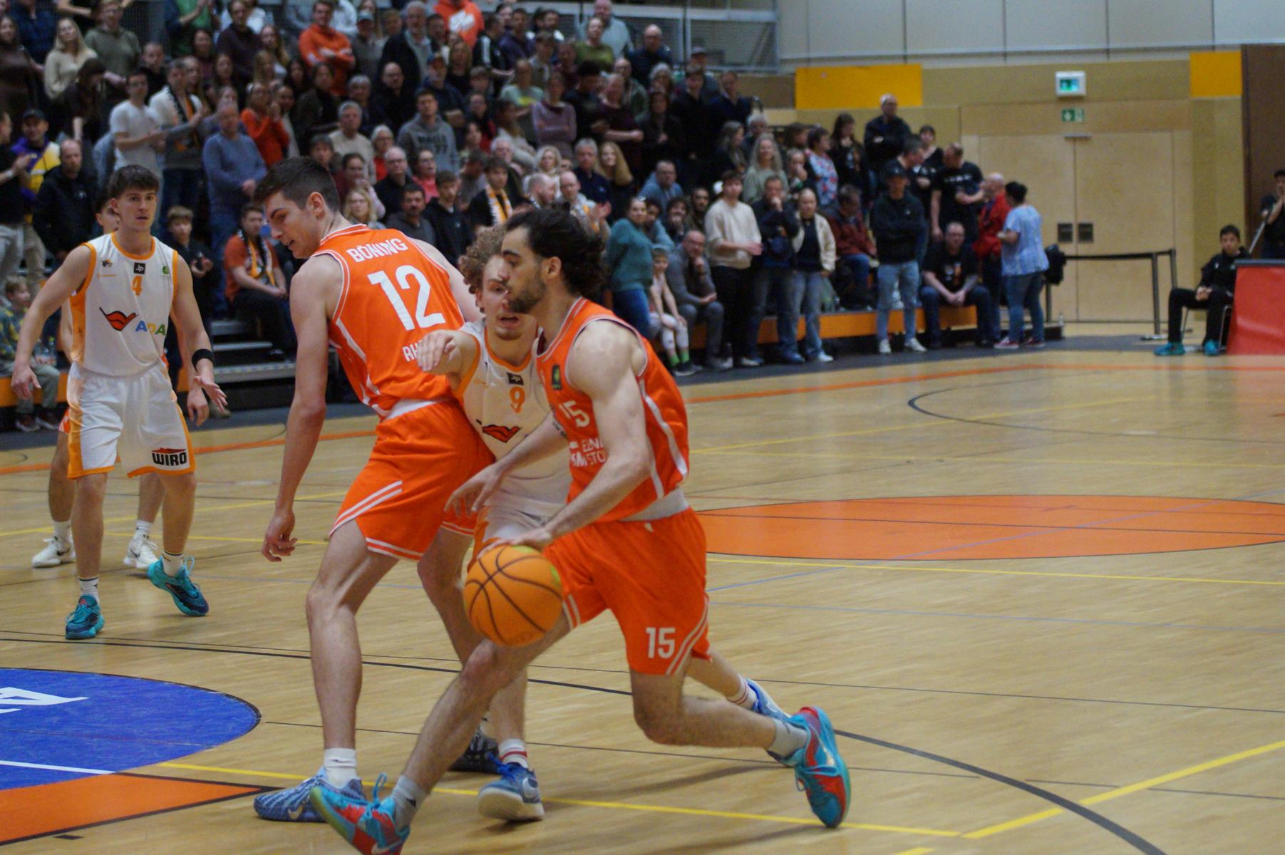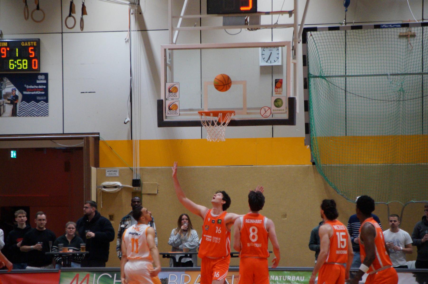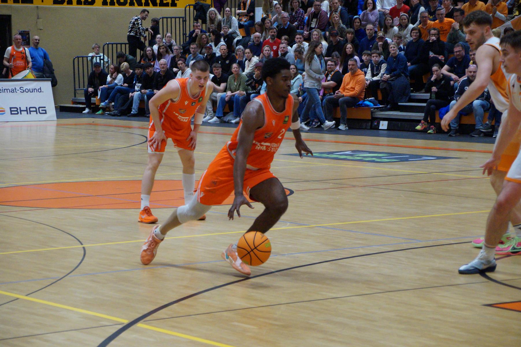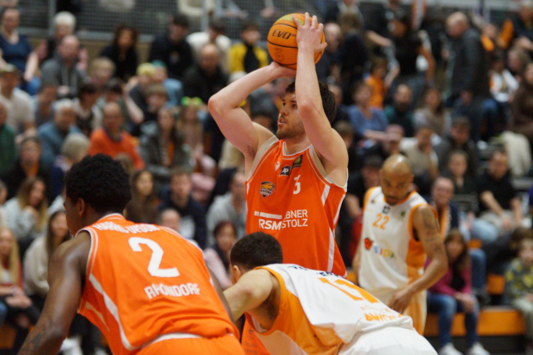 Im zweiten Spielabschnitt fiel dann auch noch der gefürchtete Dreier von den Gästen und sie glichen in der 13. Minute aus (34:34). Rhöndorf ließ das Zwischenhoch von Rostock aber kalt und konterte u.a. mit zwei blitzsauberen Distanzwürfen von Kenan Reinhart und einem von Vuk Scepanovic zur 48:39-Pausenführung.