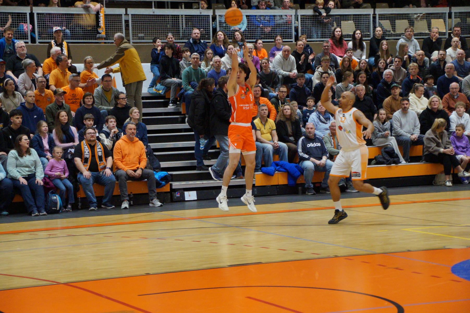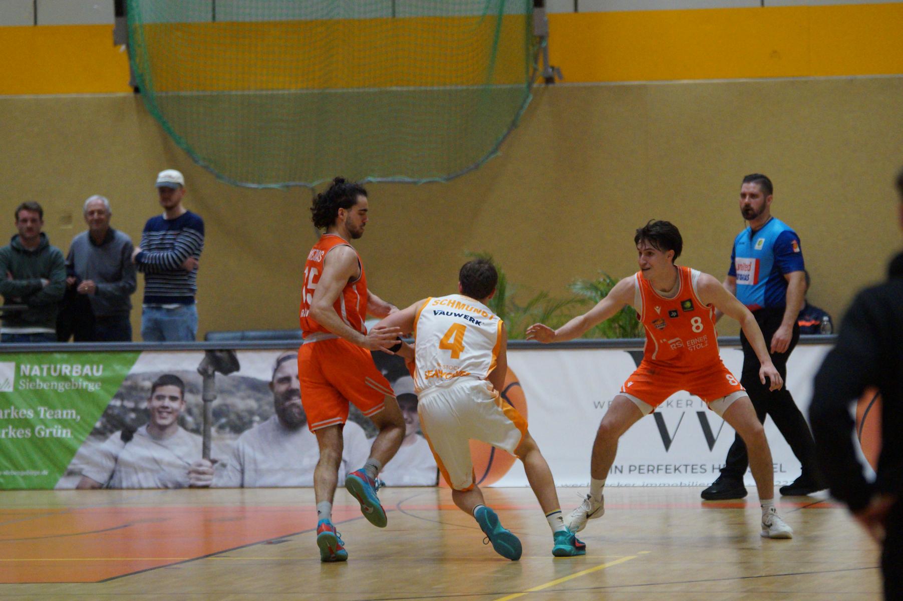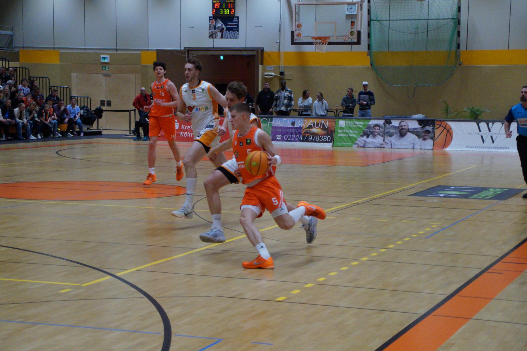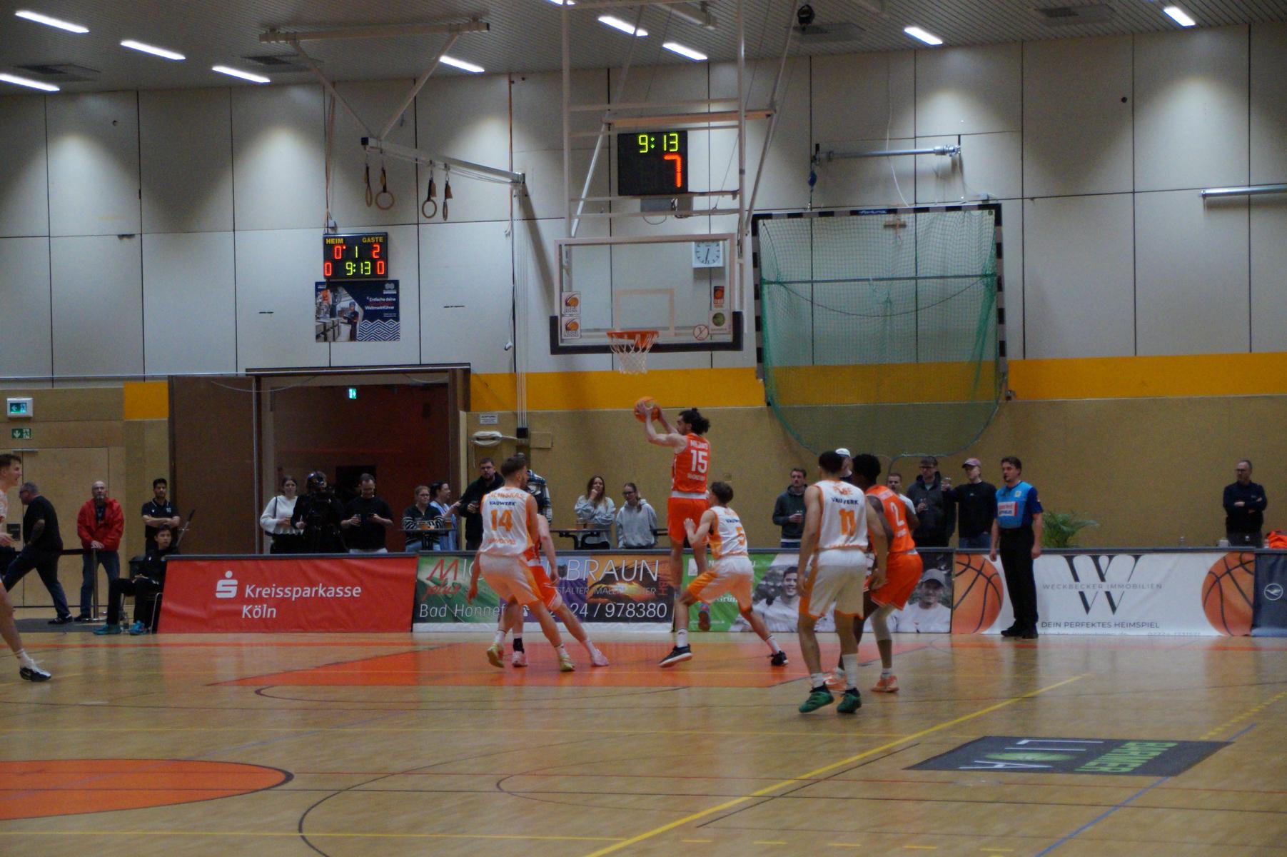 Im zweiten Spielabschnitt fiel dann auch noch der gefürchtete Dreier von den Gästen und sie glichen in der 13. Minute aus (34:34). Rhöndorf ließ das Zwischenhoch von Rostock aber kalt und konterte u.a. mit zwei blitzsauberen Distanzwürfen von Kenan Reinhart und einem von Vuk Scepanovic zur 48:39-Pausenführung.