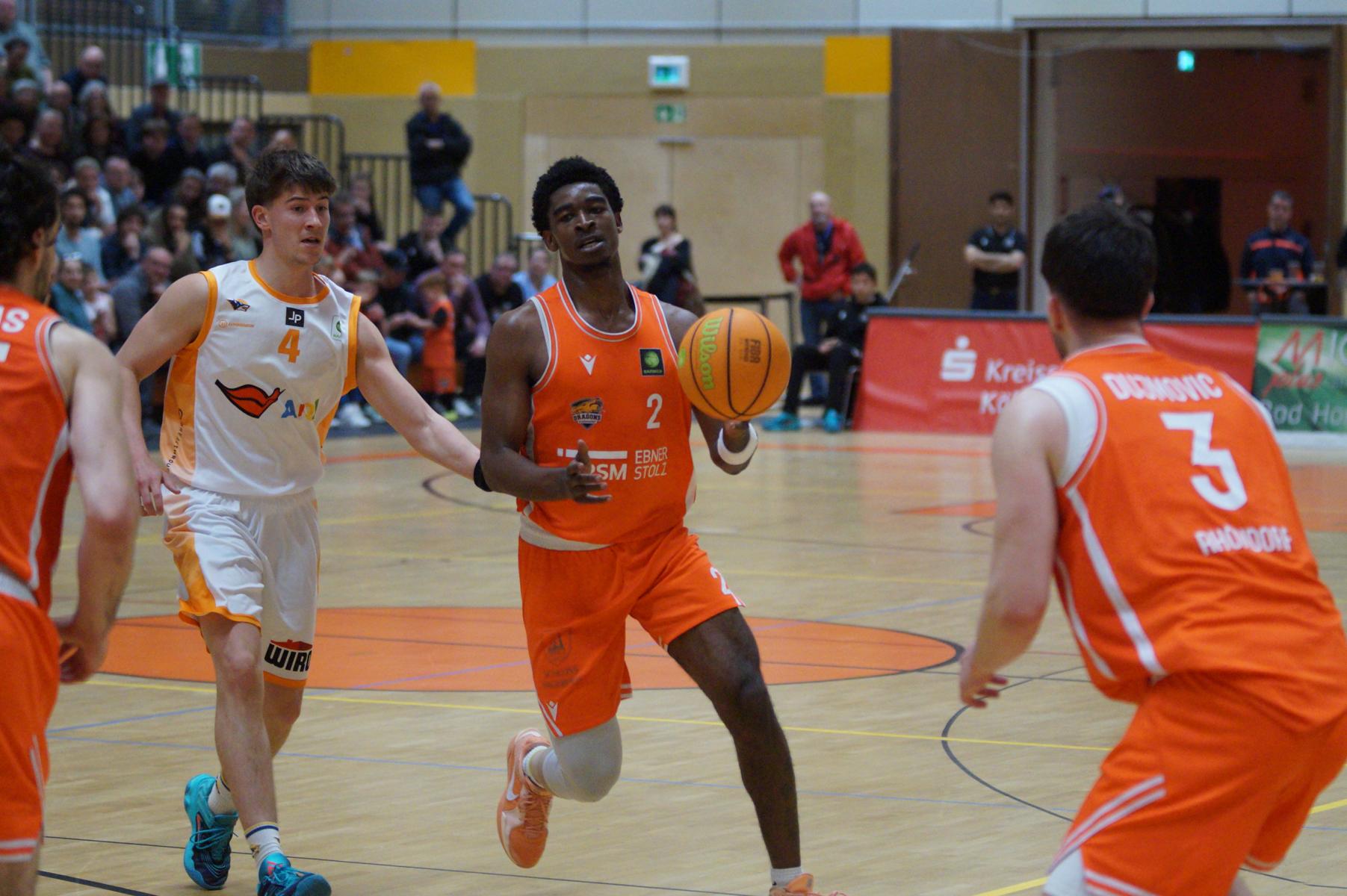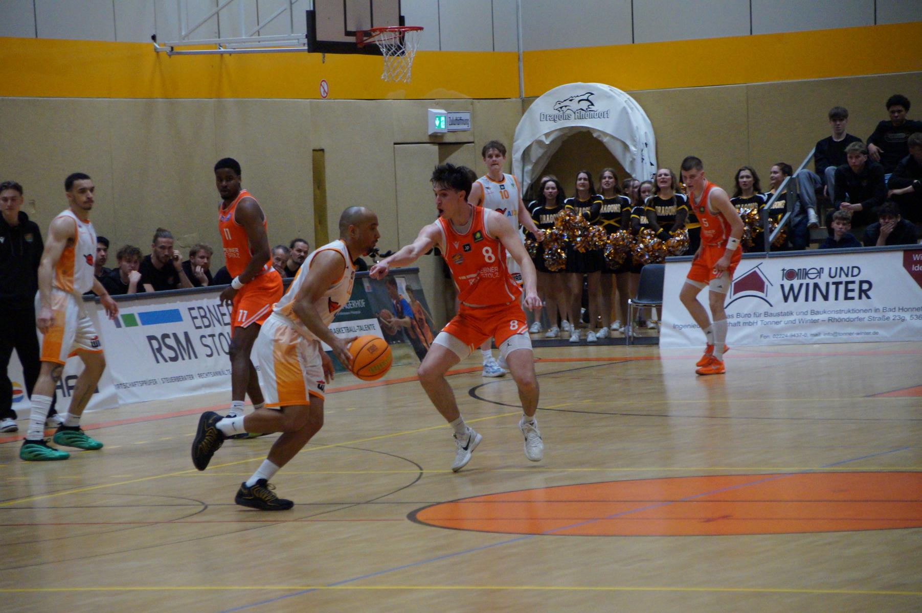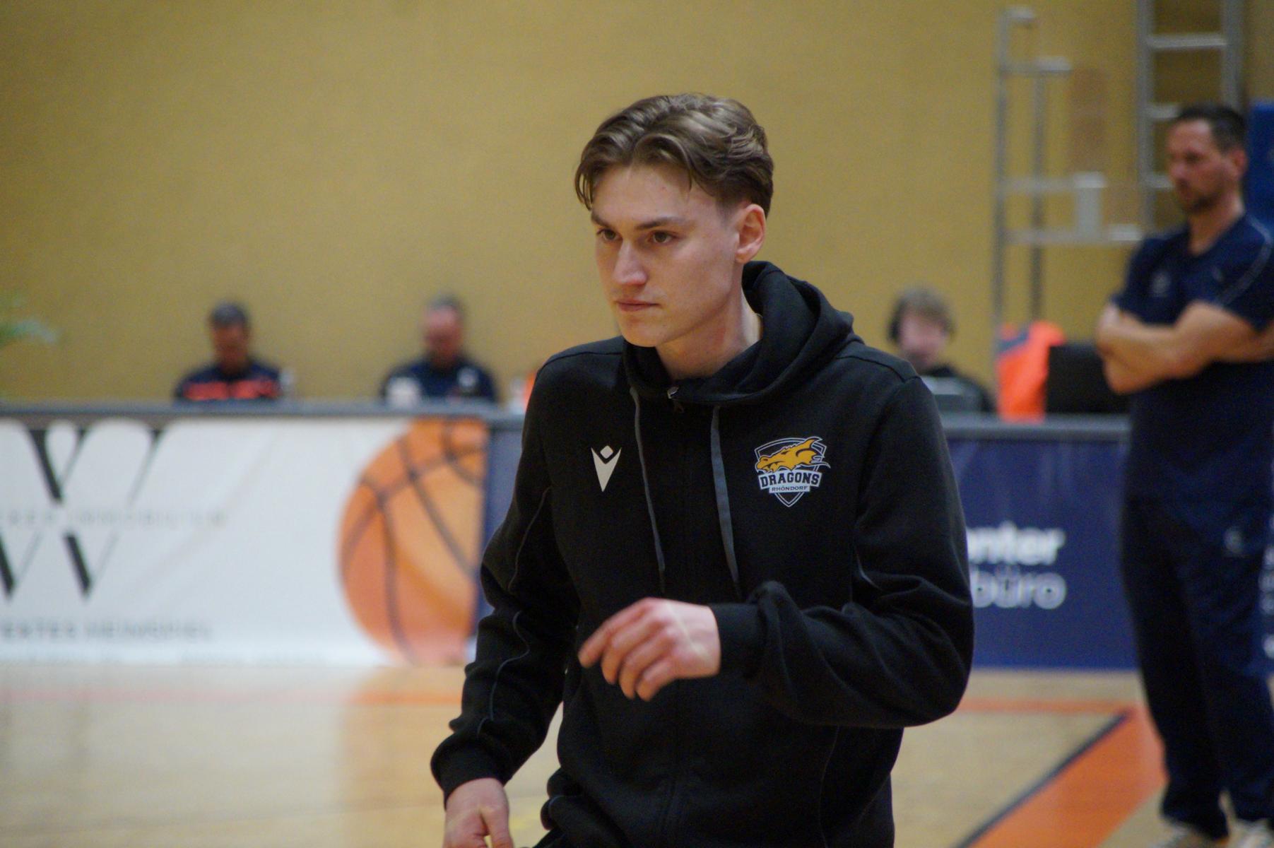 Hier verlor Rhöndorf dann für vier Minuten die Kontrolle über das Spiel. Auf der Gegenseite legten die Gäste eine 8:0-Serie hin. Bei Stand von 63:71 (34“) schienen die Dragons auf der Verliererstraße. Doch das um Max Becker hat in den letzten Wochen viel Selbstbewusstsein getankt und kämpfte sich zurück. Als Juwhan Harris-Dyson mit einem 3-Punkte-Spiel zum 74:74 ausglich, war klar, es wird eine Schlussphase mit Haken und Ösen geben.