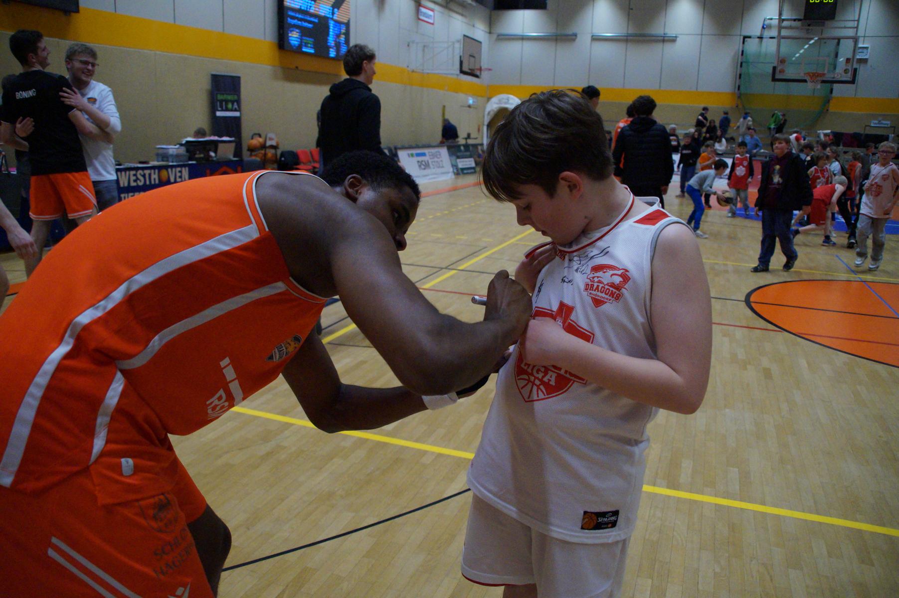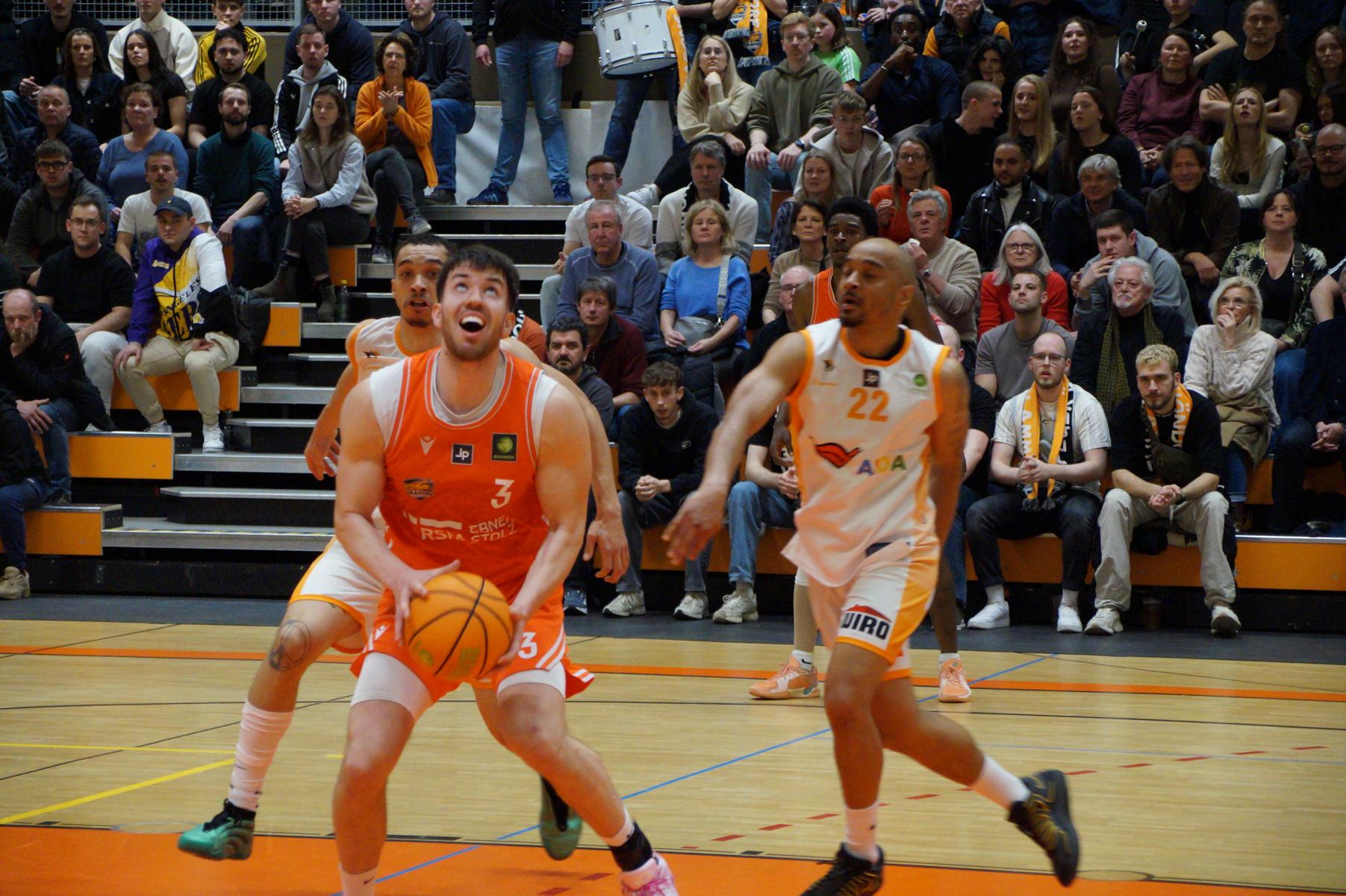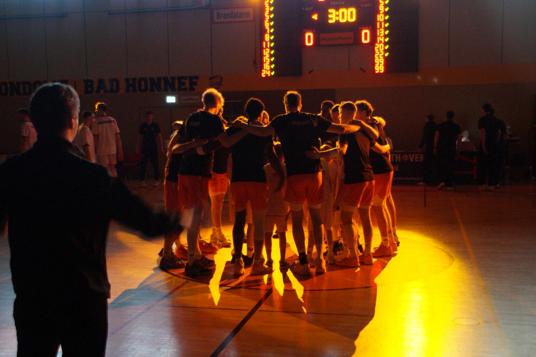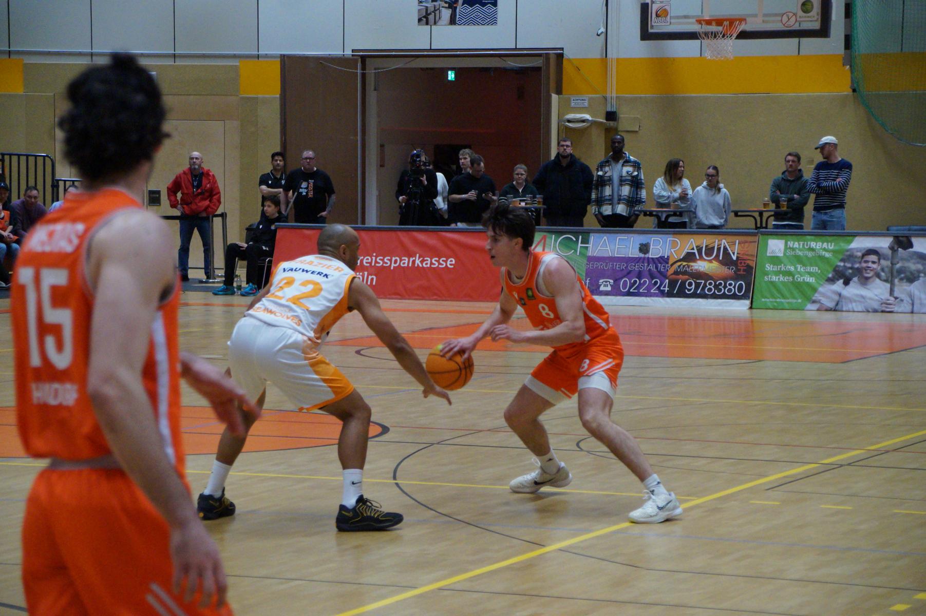 Hier verlor Rhöndorf dann für vier Minuten die Kontrolle über das Spiel. Auf der Gegenseite legten die Gäste eine 8:0-Serie hin. Bei Stand von 63:71 (34“) schienen die Dragons auf der Verliererstraße. Doch das um Max Becker hat in den letzten Wochen viel Selbstbewusstsein getankt und kämpfte sich zurück. Als Juwhan Harris-Dyson mit einem 3-Punkte-Spiel zum 74:74 ausglich, war klar, es wird eine Schlussphase mit Haken und Ösen geben.