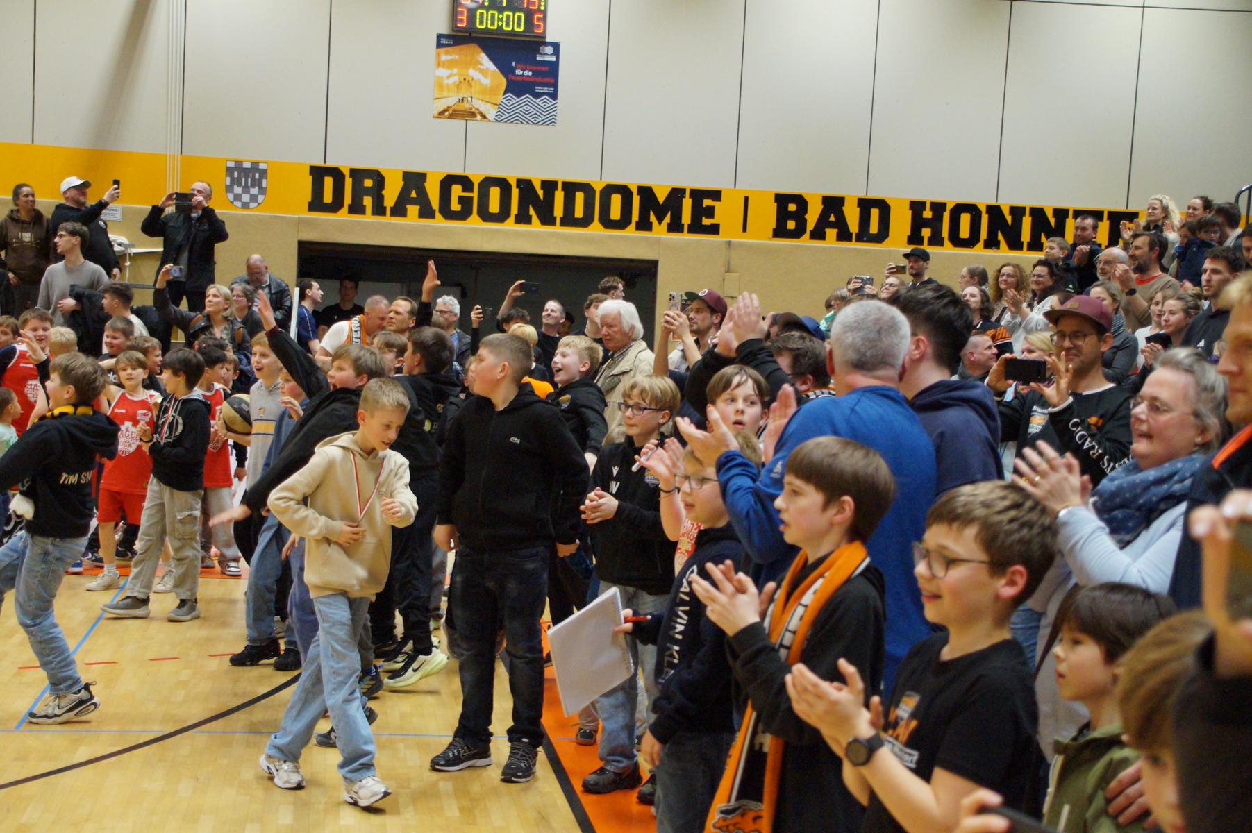 Totenstill war es in der Halle, als die letzten 19 Sekunden der Partie anbrachen. Rostock hatte Einwurf und die Entscheidung beim Spielstand von 81:79 in eigener Hand. Jalen Page dribbelte in Rhöndorfs Zone, um ein Foul zu erzwingen, doch die Dragons verteidigten konsequent und sauber. So erfolgte ein Kickout auf Chris Fazier, der wenige Sekunden vor Spielende zum Dreier hochging. Der Ball rollte über den Ring, Jalen Page angelte sich den Rebound, setzte zum Tipin an und traf – allerdings zu spät, die Spieluhr war bereits abgelaufen. Danach glich der DragonDome einem Tollhaus, Spieler, Trainer und Fans lagen sich in den Armen, Freudentränen kullerten.