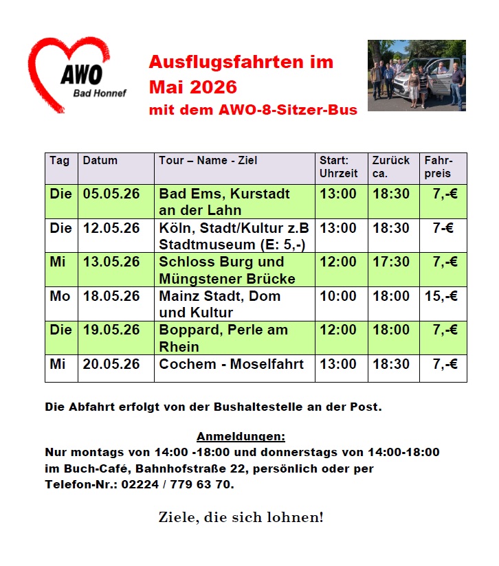 AWO Ausflugsfahrten im Mai 2026 6. April 2026 TS Infos...AusBadHonnef 0 teilen Hier die Termine und Informationen zu den AWO Ausflugsfahrten im Mai 2026 Quelle: AWO Bad Honnef (hl) 6.4.2026 teilen AusBadHonnef.deAwo AusflugsfahrtenAWO Bad HonnefBad Honnef