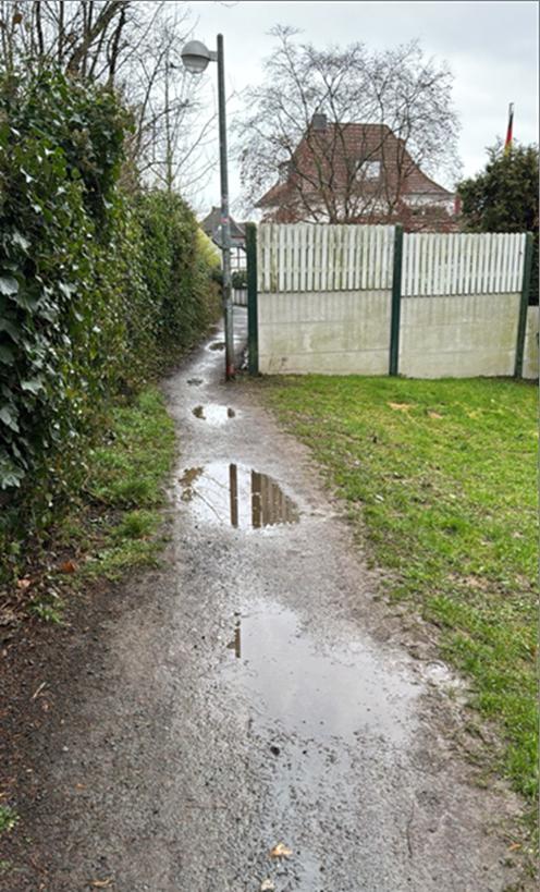 Der schmale Fußweg hinter dem Sibi wird täglich von vielen Schülern und Anwohnern benutzt. Dieser Pfad hatte sich durch unzureichende Pflege zu einer „Pfützen-Hindernis-Strecke“ entwickelt. Für Fußgänger, darunter auch viele Mütter mit Kindern, war insbesondere bei und nach Regen der Weg kaum noch zu passieren. Und die Sibi-Schüler betraten mit dreckigen Schuhen das Schulgebäude. Das folgende Foto zeigte die Situation: