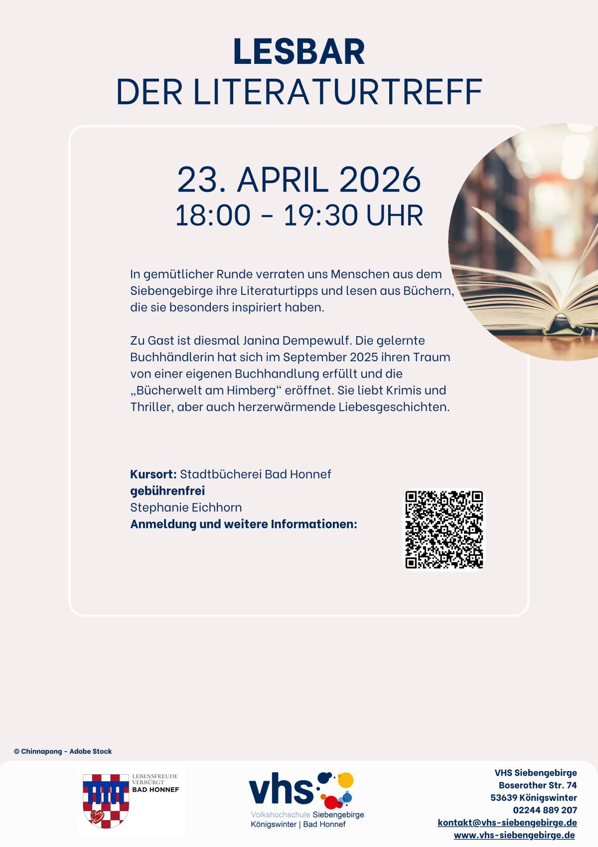 Die Stadtbücherei Bad Honnef lädt am Donnerstag, dem 23. April, um 18 Uhr zu einer Veranstaltung der Reihe „LesBar – der Literaturtreff“ ein.
