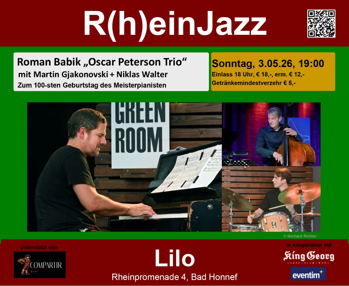 Am Sonntag, den 3.5.26 spielt im Lilo, Bad Honnef, das Roman Babik „Oscar Peterson Trio“ mit Martin Gjakonovski + Niklas Walter (Einlass 18 Uhr, Konzert 19 bis 21 Uhr; Eintritt € 18,-, Getränkemindestverzehr € 5,-; Rheinpromenade 4, Bad Honnef).